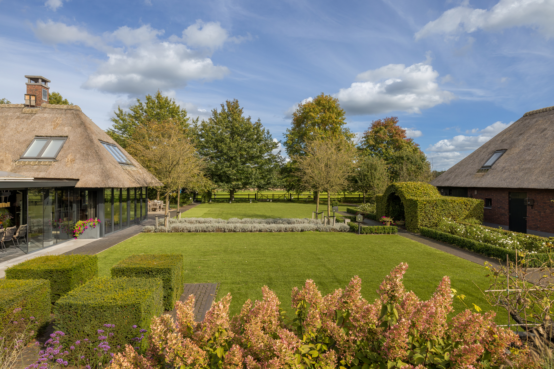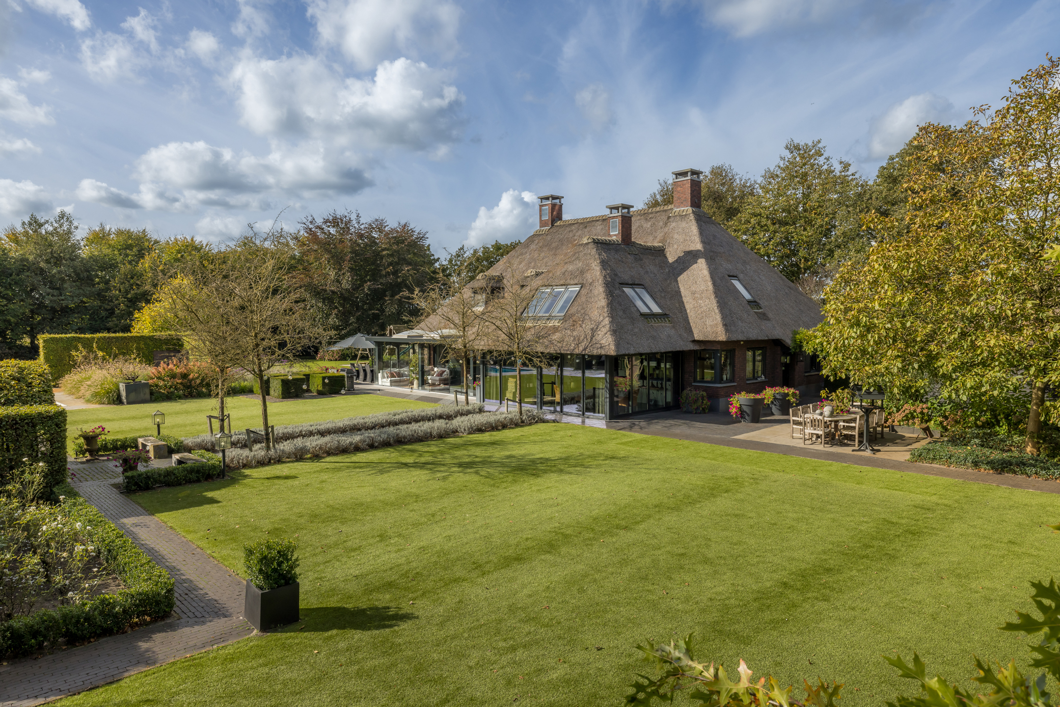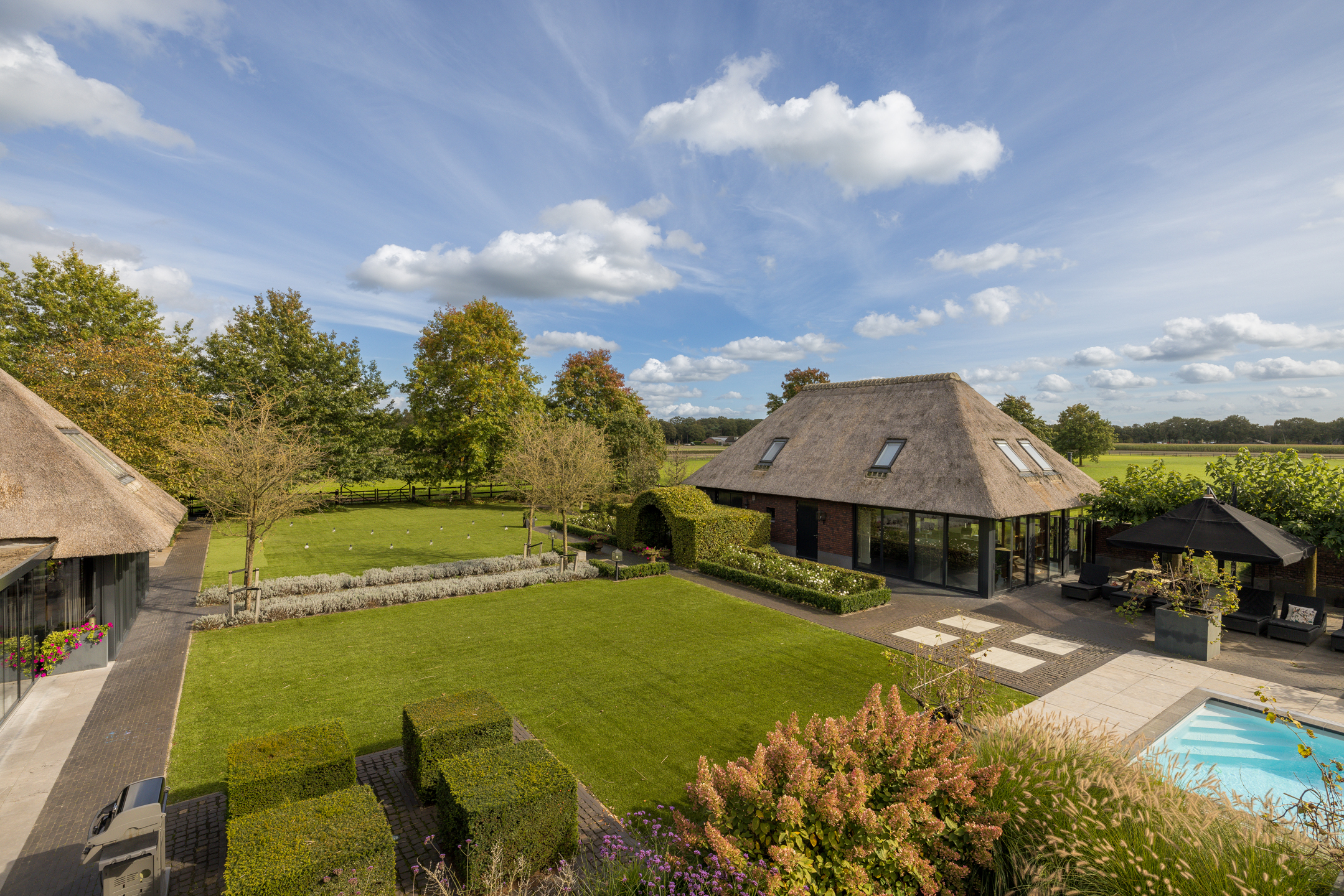 In het buitengebied van Erp gelegen, een werkelijk uniek rietgedekt landhuis met guesthouse en vrijstaande garage, op een riant perceel van bijna 1.5 hectare. Een droomhuis waar het echt aan niets ontbreekt: landelijk, klassiek, chique en technisch modern. Het energielabel A+++ geeft aan dat dit schitterende object ook helemaal op de toekomst is voorbereid. Een woning waar aan ruimte geen gebrek is, volledig onderkelderd, royale begane grond, een riante eerste verdieping en een zolder. Dit heerlijke familiehuis voelt ruim en cosy, zonder het gevoel te krijgen dat het veel te groot is.