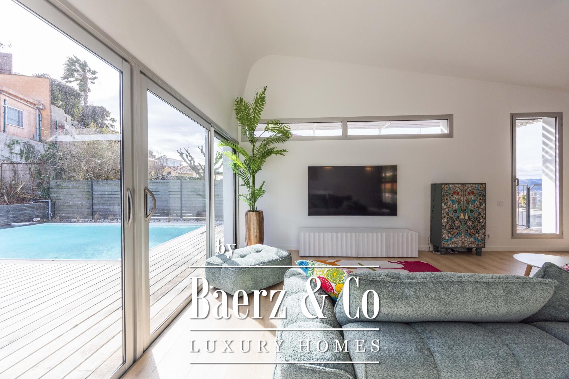 Four landscaped terraces, shaded by palm and banana trees, define an outdoor sanctuary. The 7 x 5 m swimming pool, bordered by a sunlit wooden deck, provides privacy and relaxation, while a pergola and summer kitchen nurture Mediterranean conviviality. Six bedrooms include a master suite with walk-in wardrobe, private wooden terrace, and a spa-inspired bathroom that opens to tranquil views, echoing the calm of a secluded retreat. Two additional double bedrooms share a refined bathroom, while top-floor offices offer inspiring spaces with city outlooks.