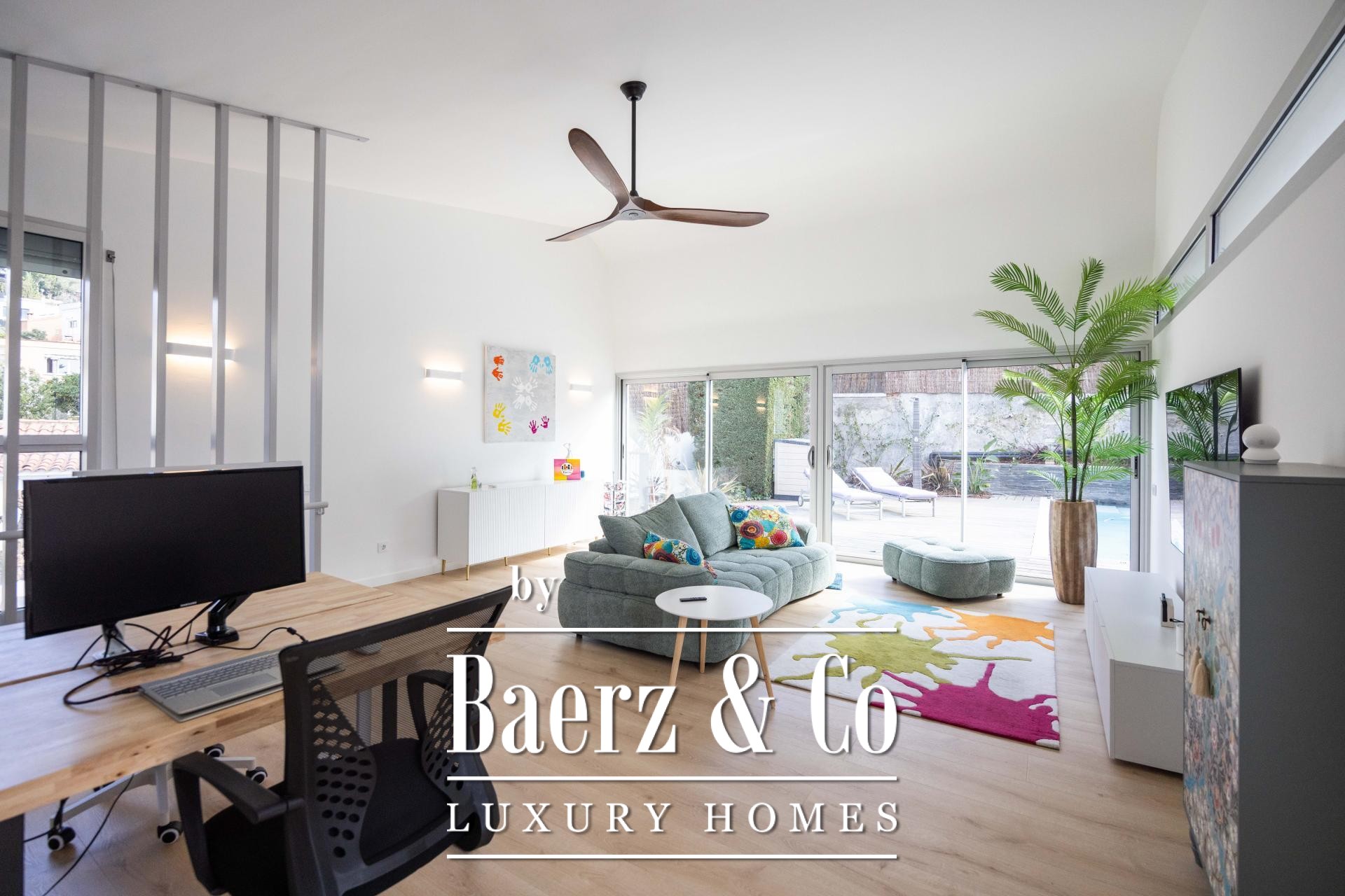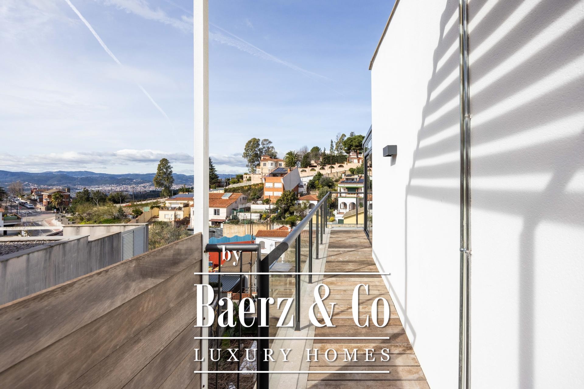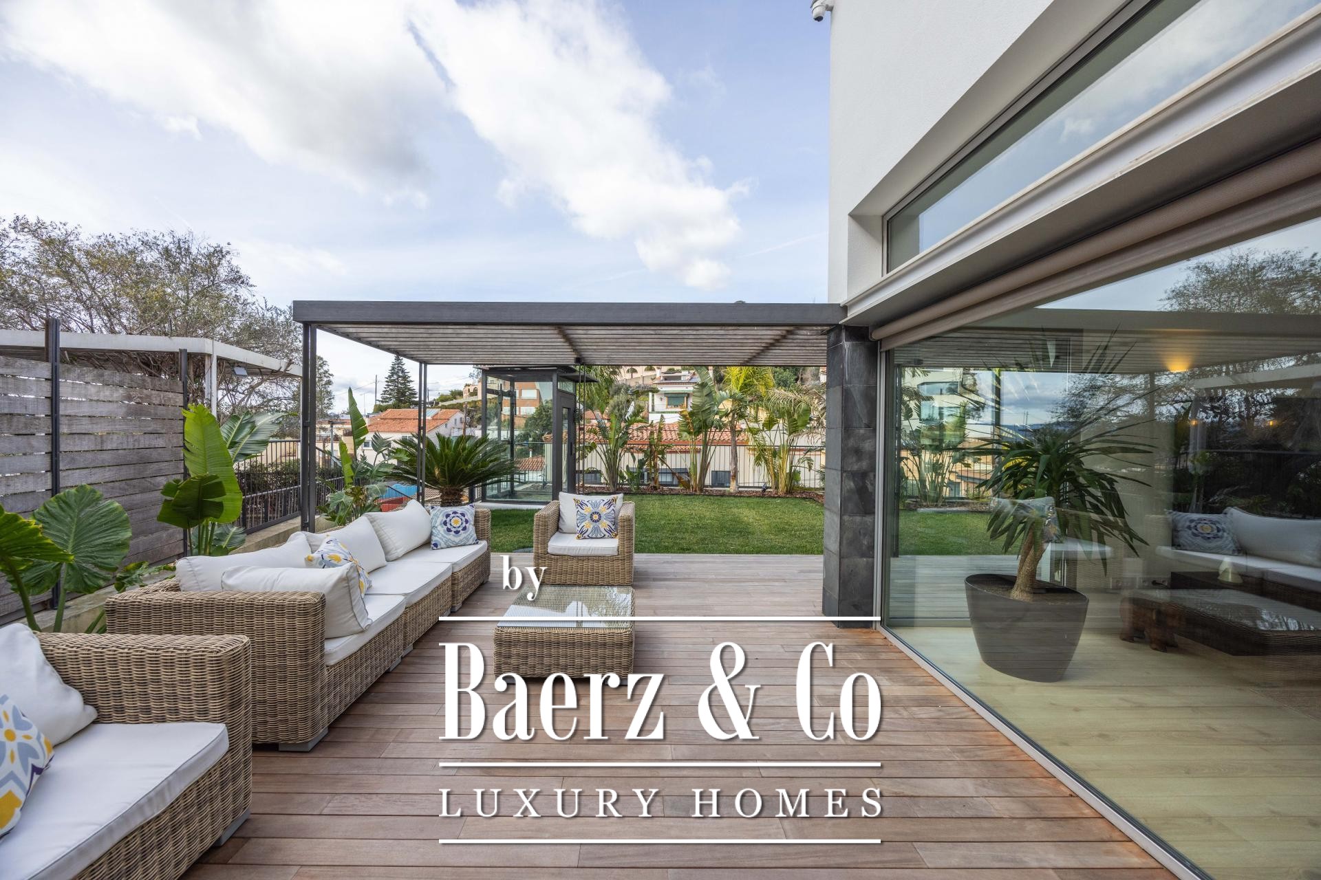 Four landscaped terraces extend the experience outdoors, surrounded by palm and banana trees, curated lawn, a shaded pergola, and a summer kitchen. The 7x5 m swimming pool and wooden sun deck invite moments of relaxation and privacy. The master suite is defined by its walk-in wardrobe, private terrace, and hydromassage bath, while two further bedrooms access a secluded outdoor retreat. An elevator connects the levels, providing comfort and effortless movement throughout the home. The villa’s refined setting in Esplugues de Llobregat ensures both discretion and immediate access to the heart of Barcelona.