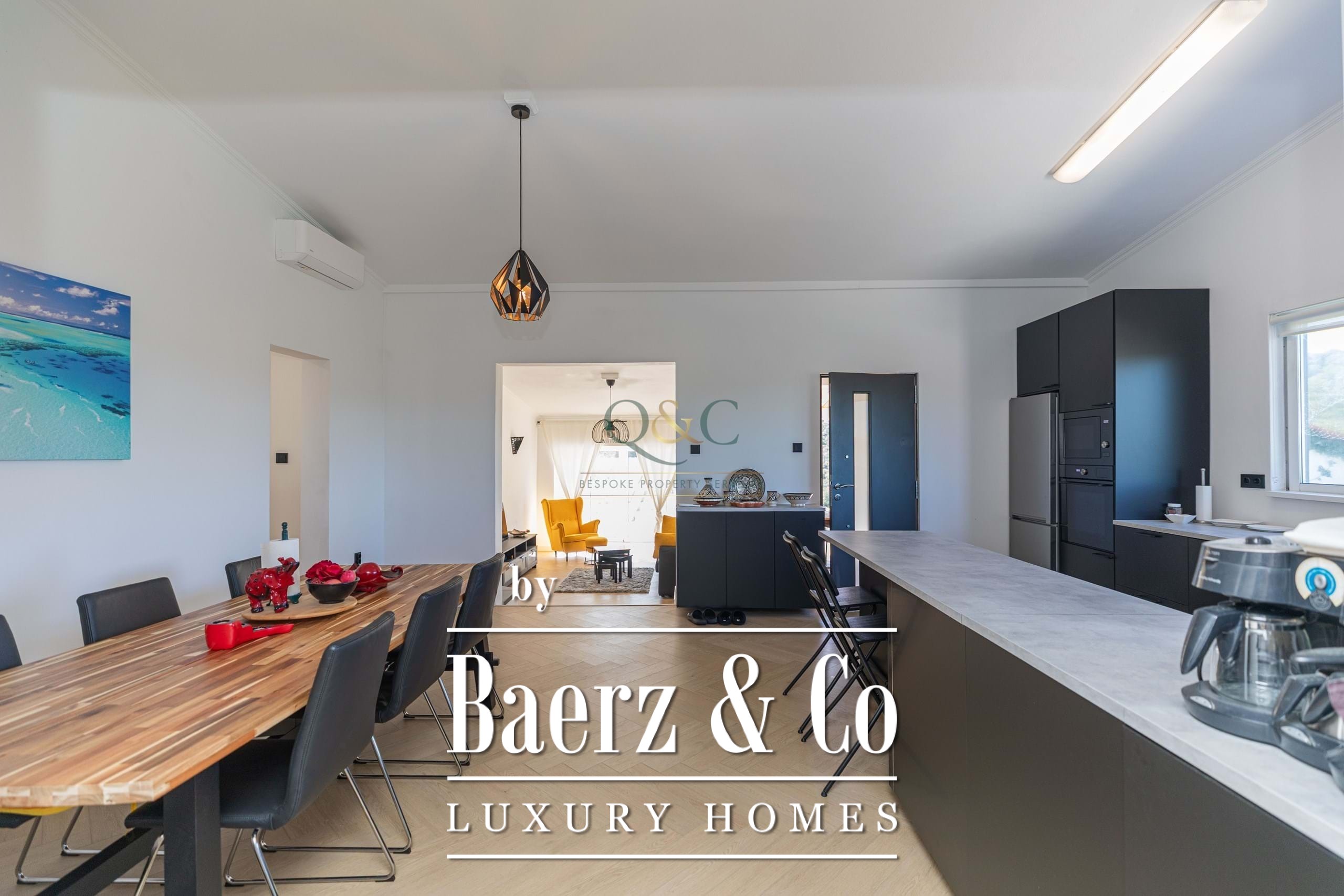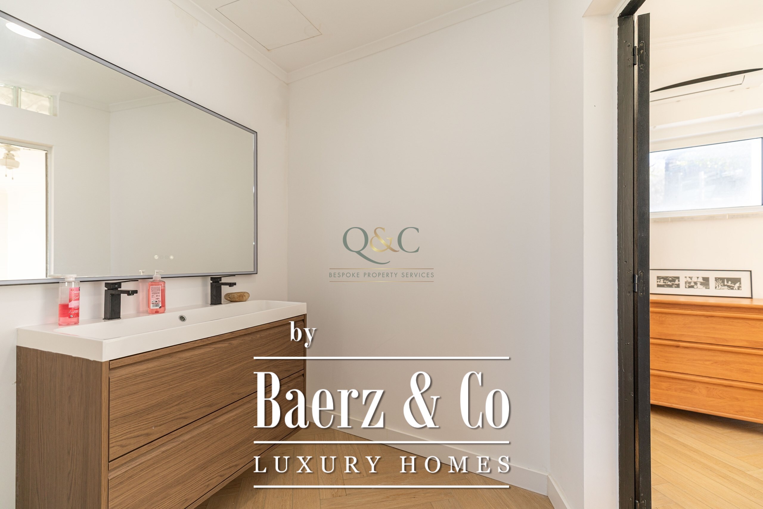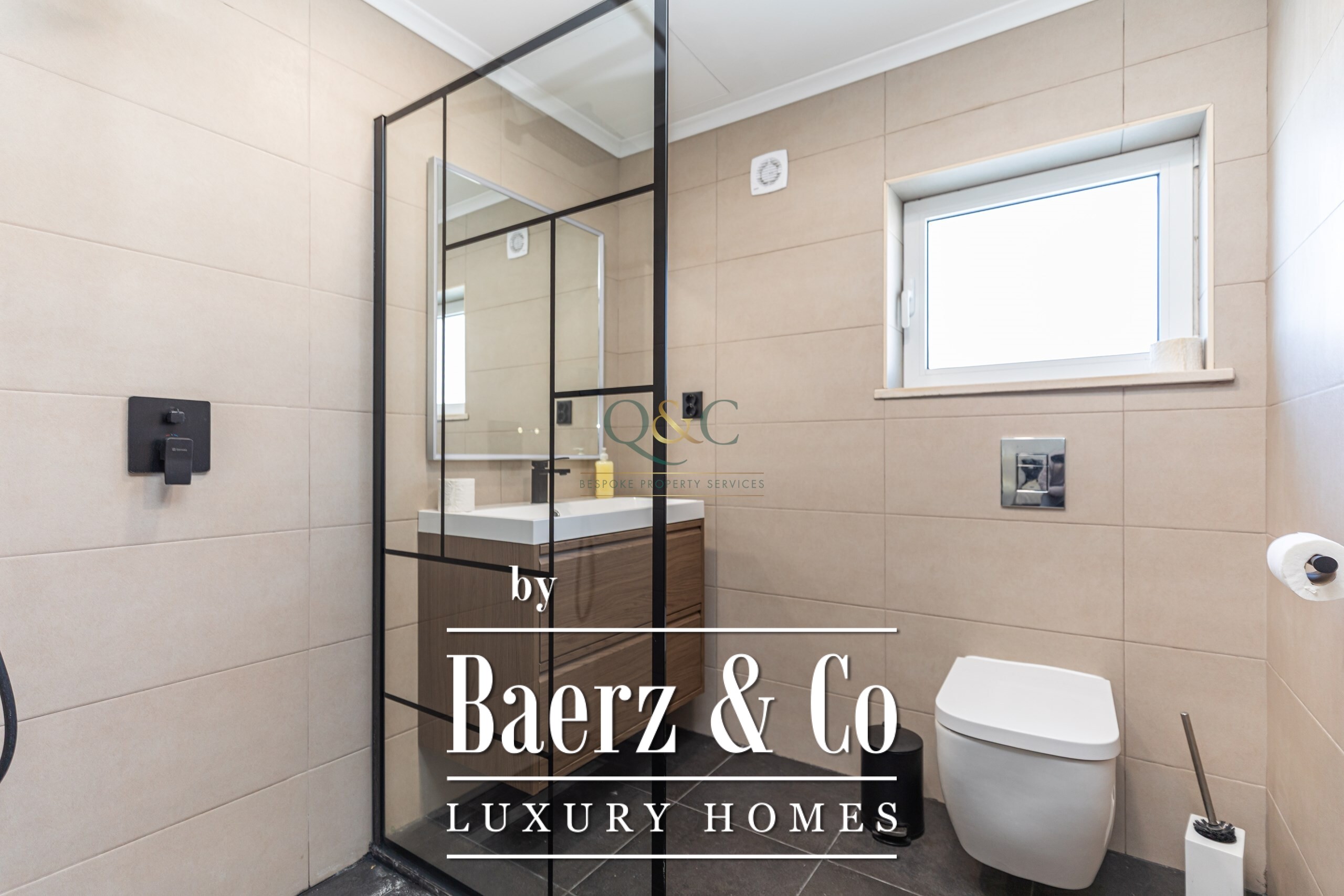 There are three generous double bedrooms, including two with recently refurbished en-suite bathrooms. The primary suite features a walk-in wardrobe and dressing area, while the third bedroom offers double doors leading straight to the swimming pool terrace. A large family bathroom includes a bath, substantial walk-in shower, and double vanity. Utility needs are met with a dedicated laundry room, storage spaces, and an equipped kitchen.