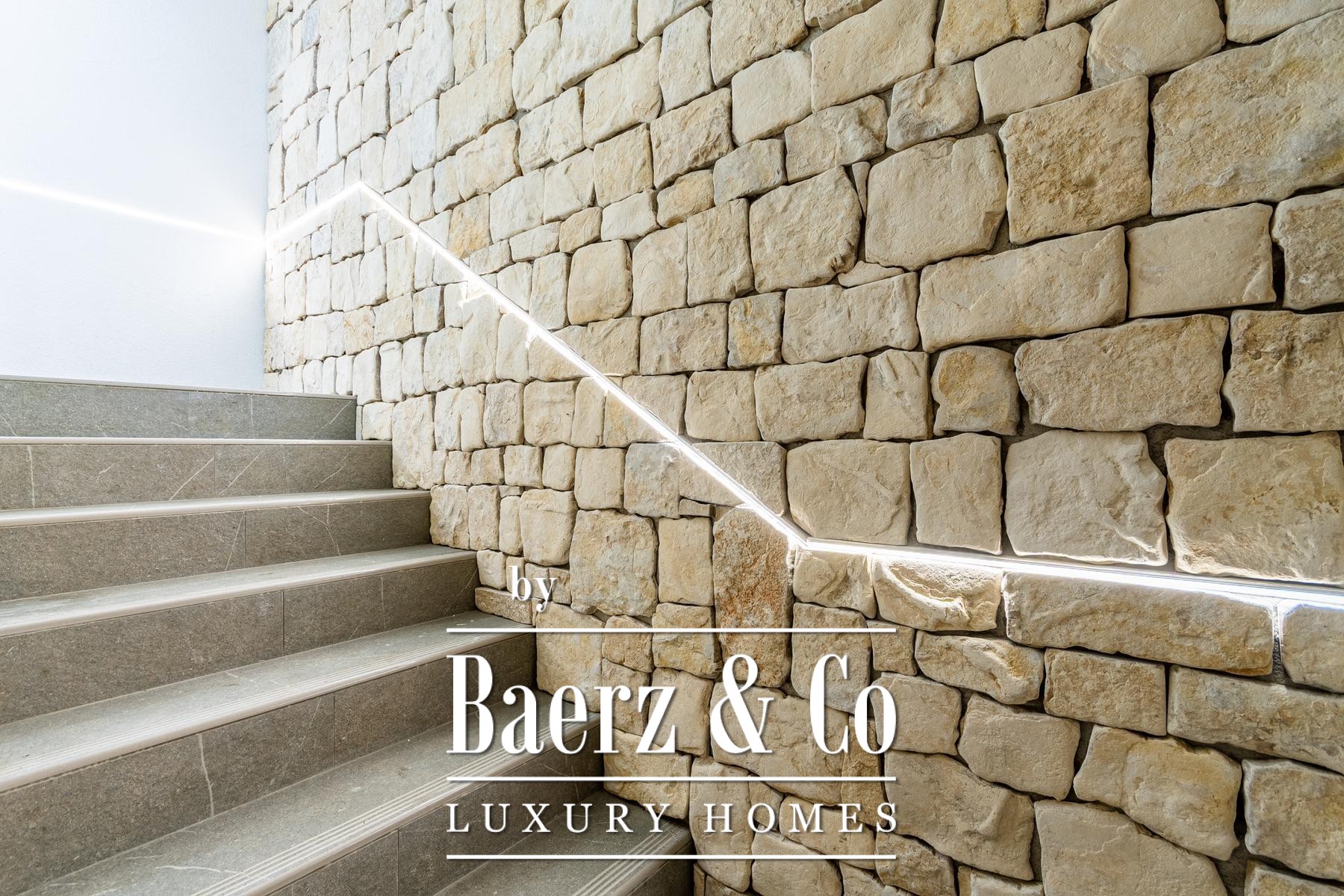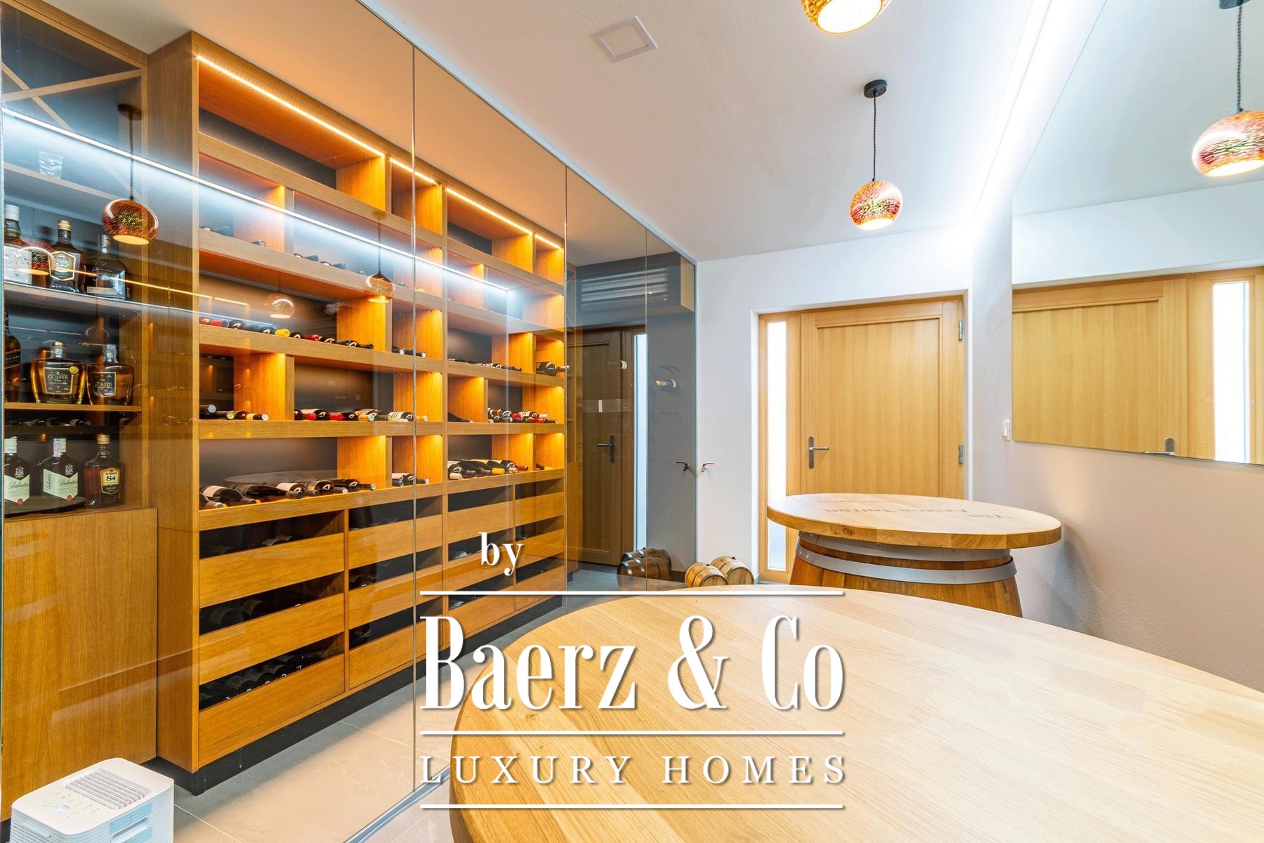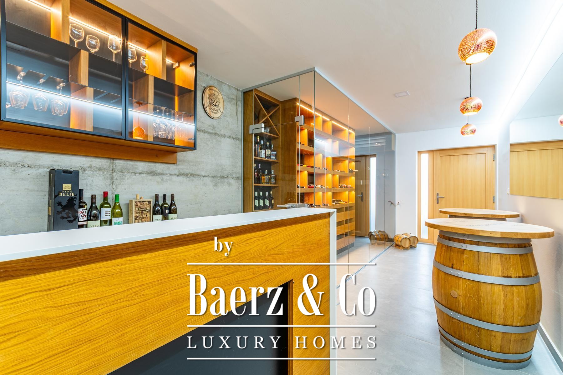 The villa’s architecture flows effortlessly between its three levels. The ground floor features an open kitchen, dining, and living zone, anchored by a fireplace and opening onto a broad terrace that welcomes natural light. A bedroom and bathroom with WC complete this floor. On the first level, a separate entrance leads to two bedrooms, a spacious bathroom, and a flexible kitchenette and living arrangement, with another terrace that frames the scenery. The finished basement provides a private sauna, wine cellar, and garage, grounding the home in quiet luxury.