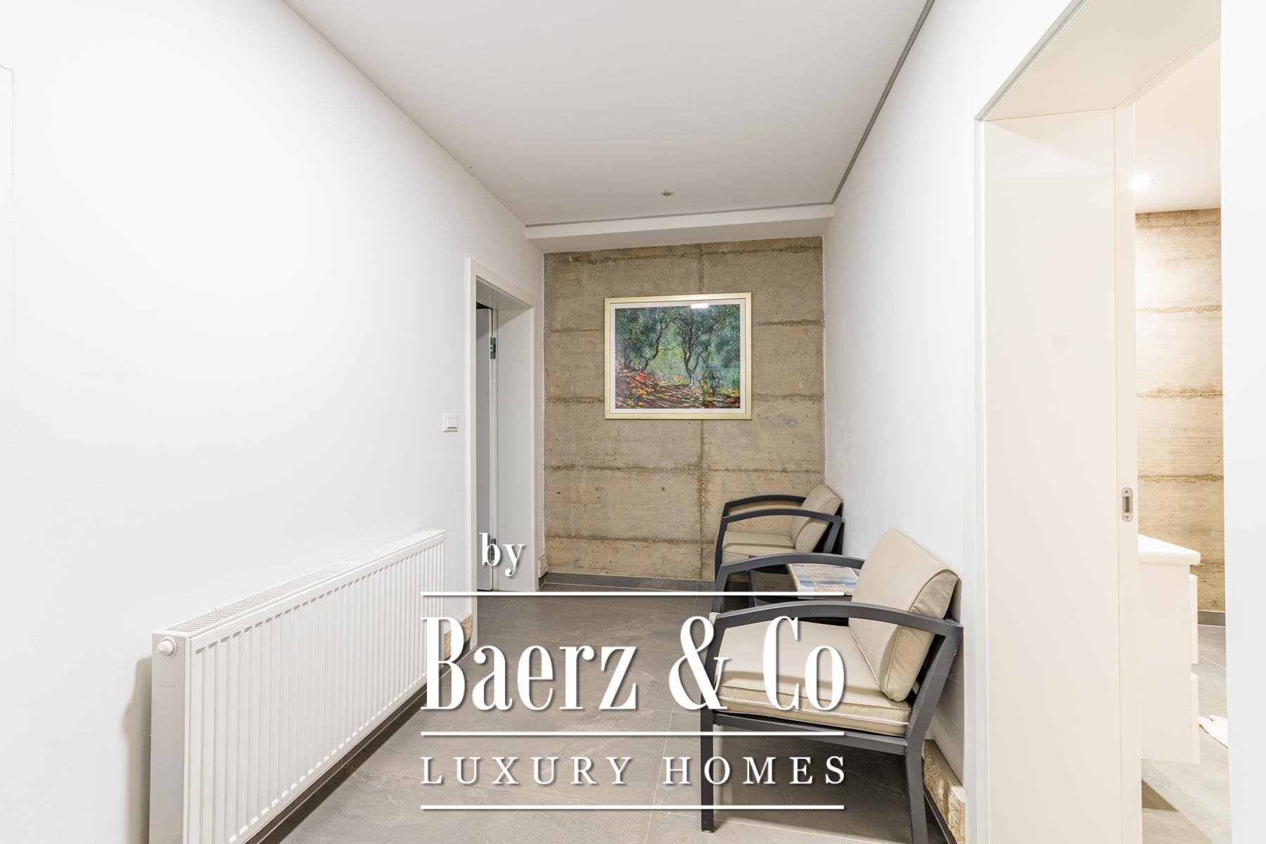 The roof terrace, designed in both covered and open areas with artificial grass, features a jacuzzi and extends the living space outdoors. The landscaped garden includes a heated saltwater pool measuring 10 m by 4 m by 1.65 m, and a dedicated barbecue area with supplementary quarters for guests or staff, complete with a kitchen and bathroom.