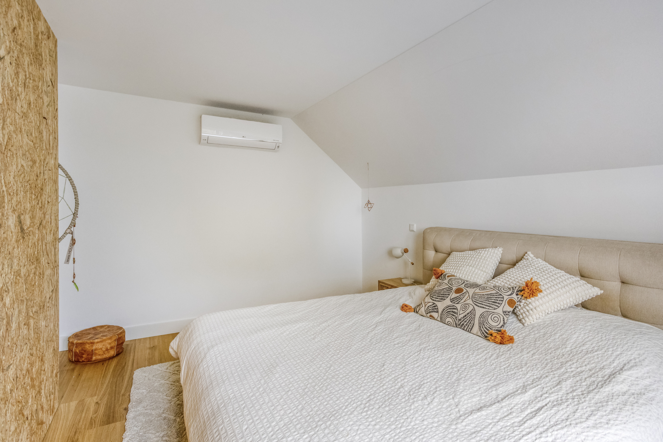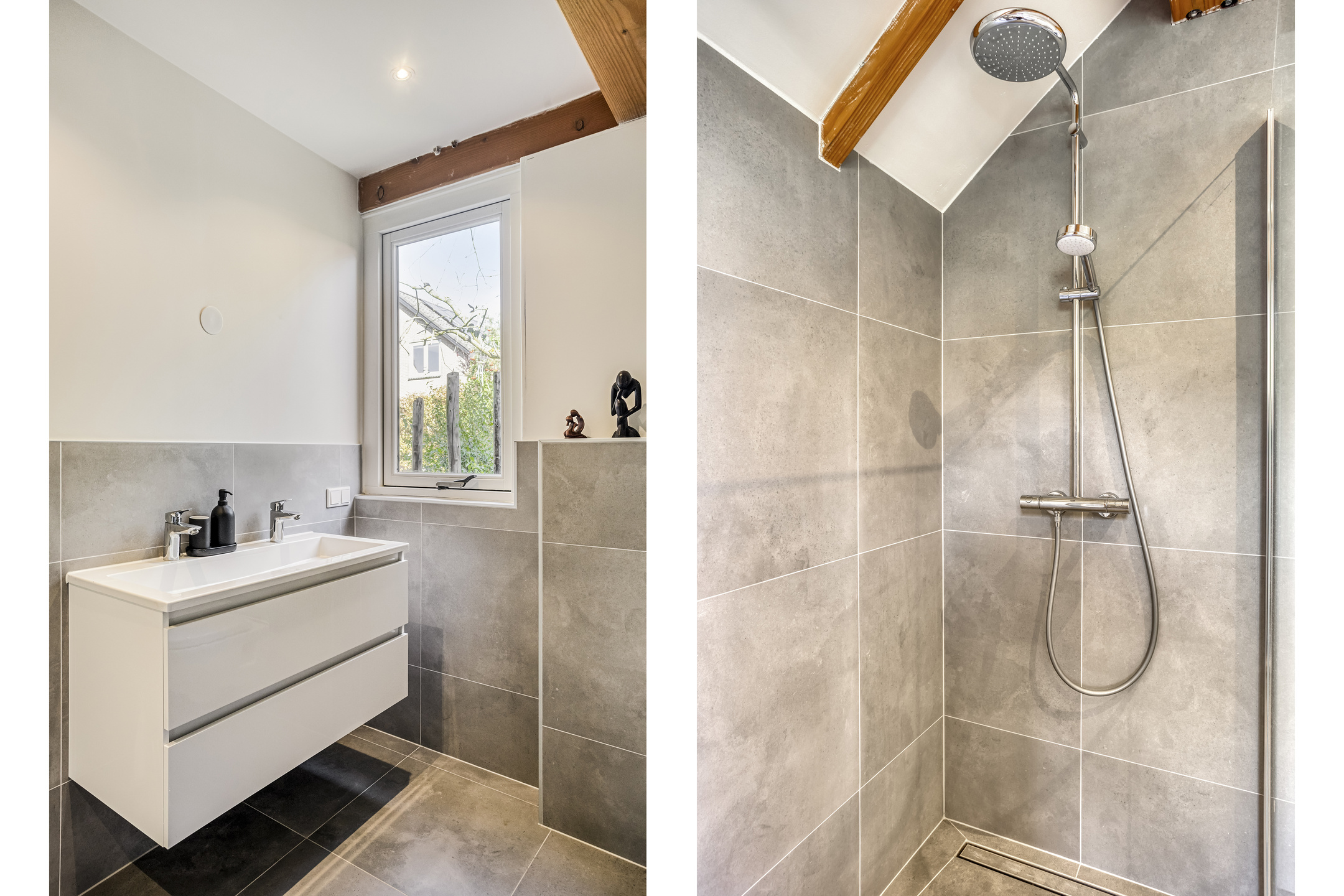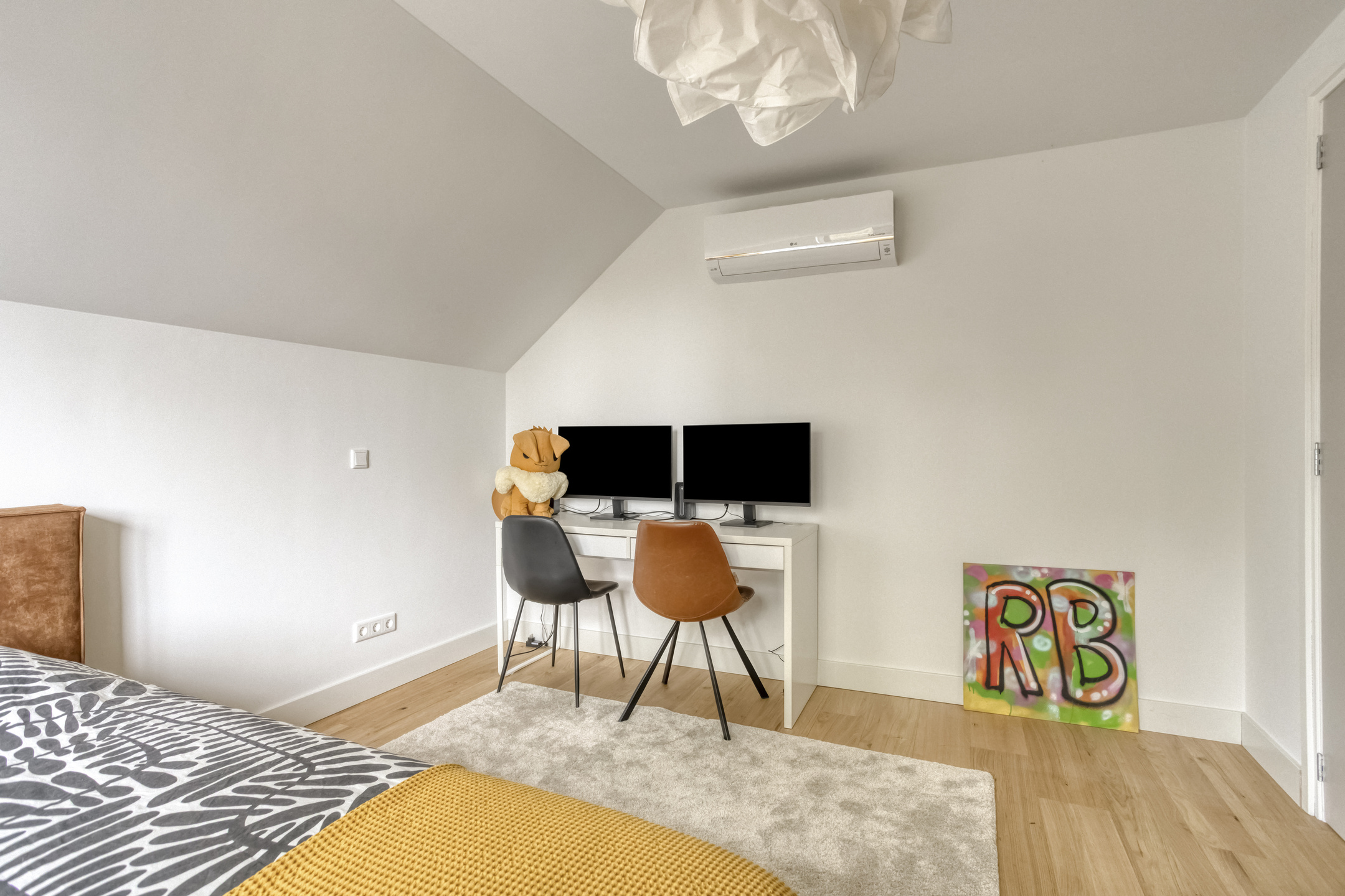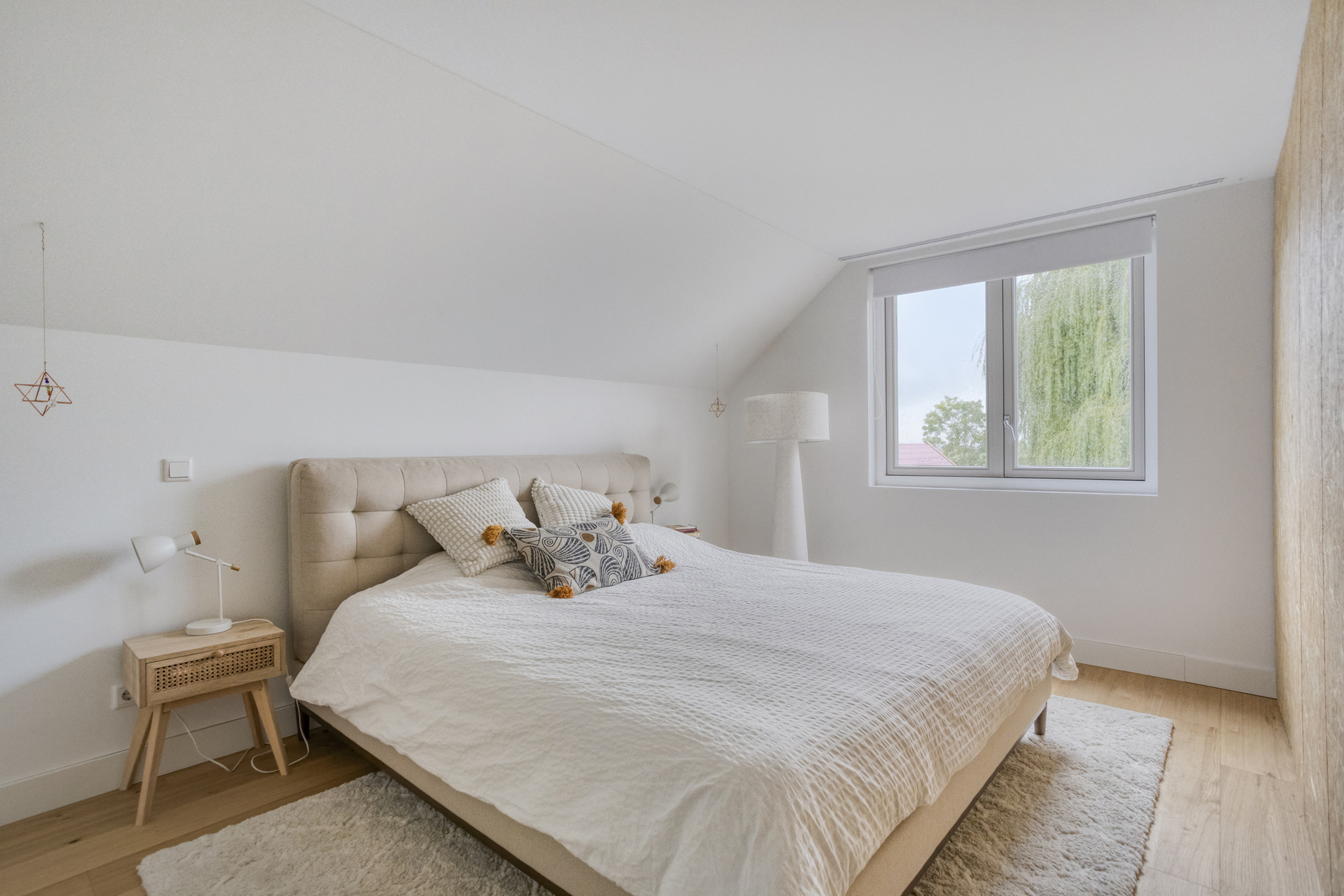 Enter through high ceilings and French doors, where a luminous living room opens toward the green expanse. The cook's kitchen features an XL countertop, Quooker tap, induction cooktop, and built-in appliances designed for both everyday ease and refined entertaining. Upstairs, the main suite is complemented by a generous walk-in closet and a luxurious bathroom with dual natural stone sinks, oak vanity, and a walk-in shower. The home's fiber optic internet and 12 solar panels elevate daily comfort and efficiency.