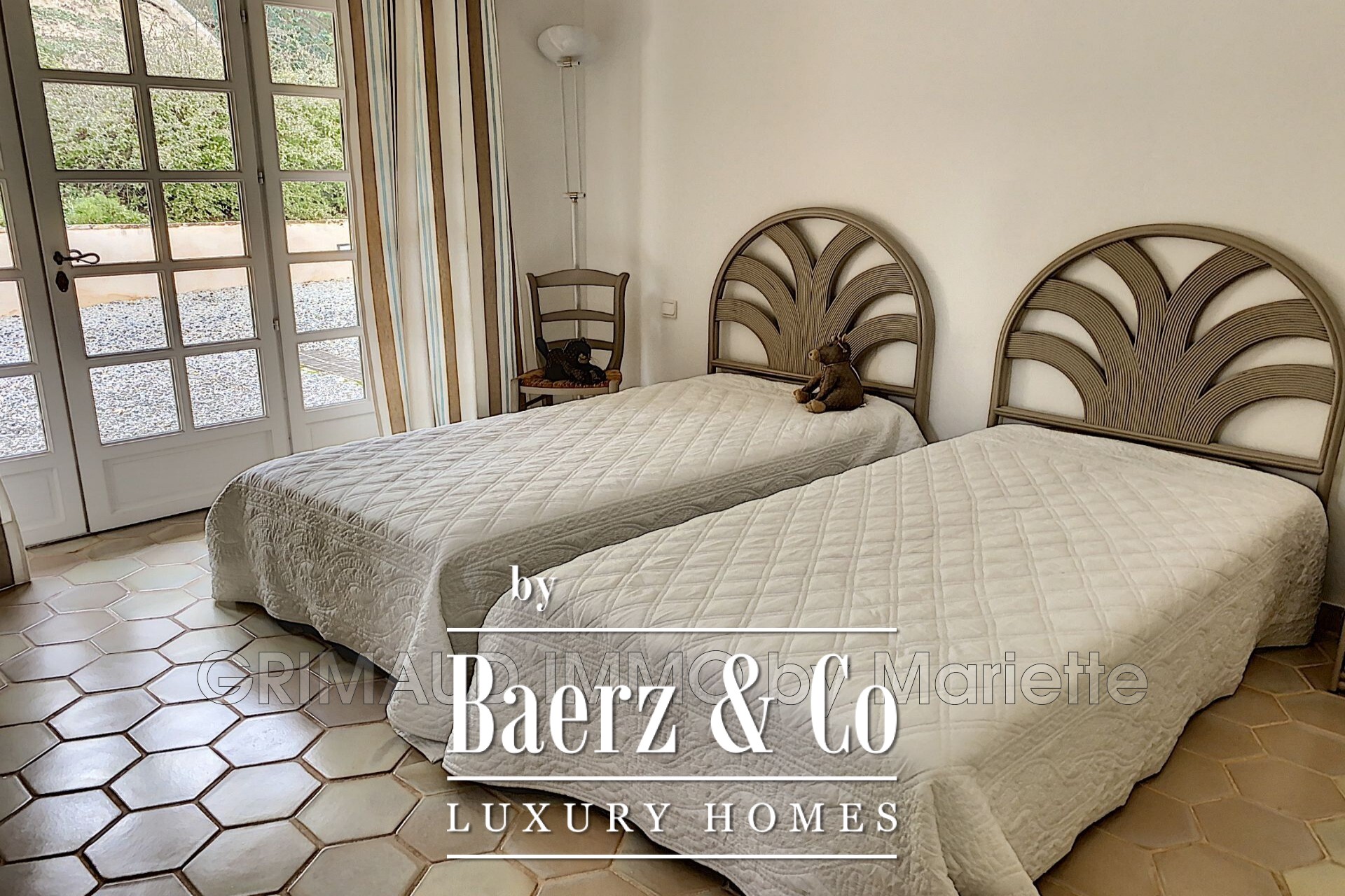 Upstairs, two more bedrooms are served by a shower room, maintaining privacy and quiet for guests or family. Below, a cellar and workshop expand the utility of the home. Outdoors, the 13 m swimming pool draws the eye to the garden’s depth while anchoring leisure in the landscape. This villa in Grimaud stands within walking distance of the village, inviting a measured pace and a rich sense of place.