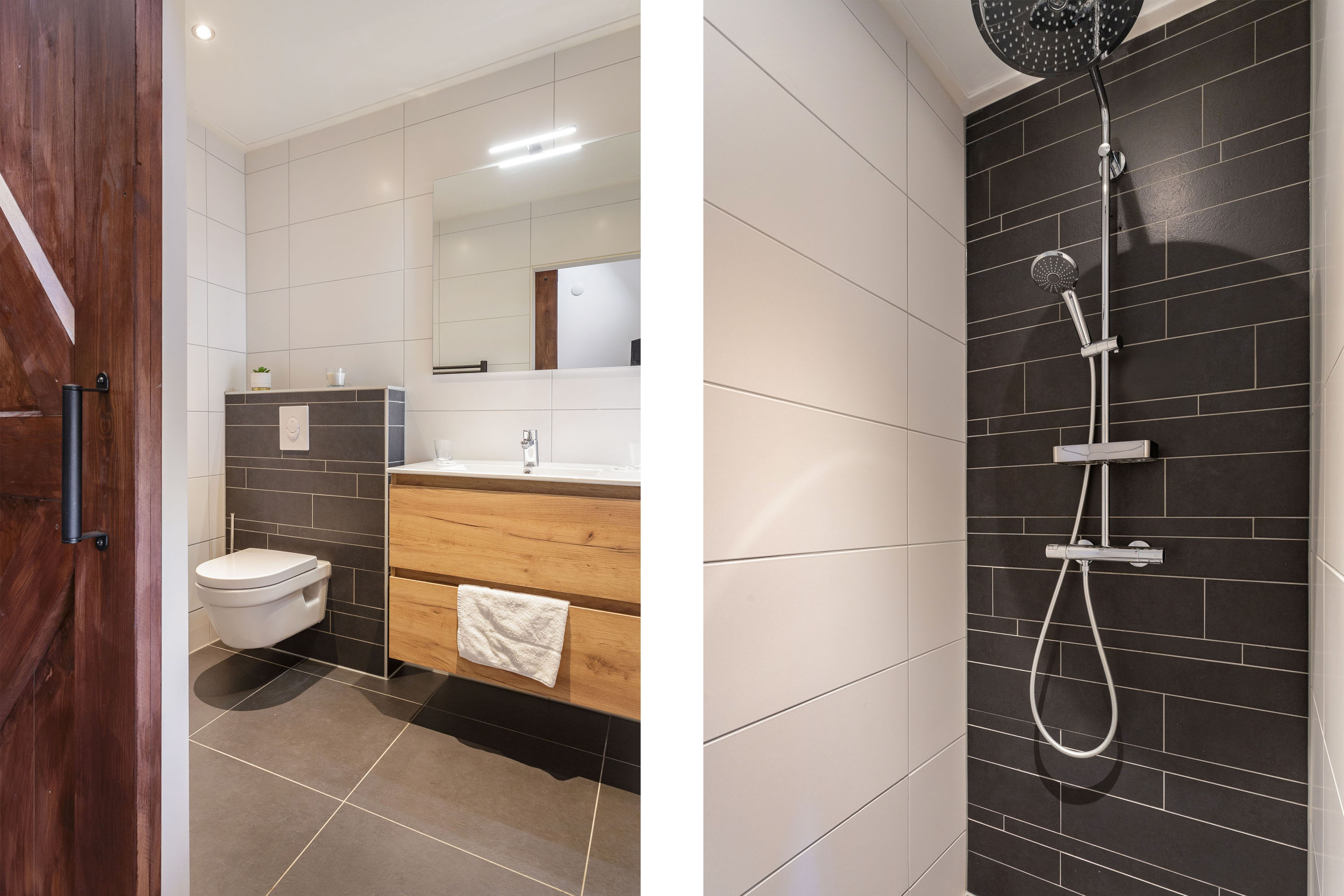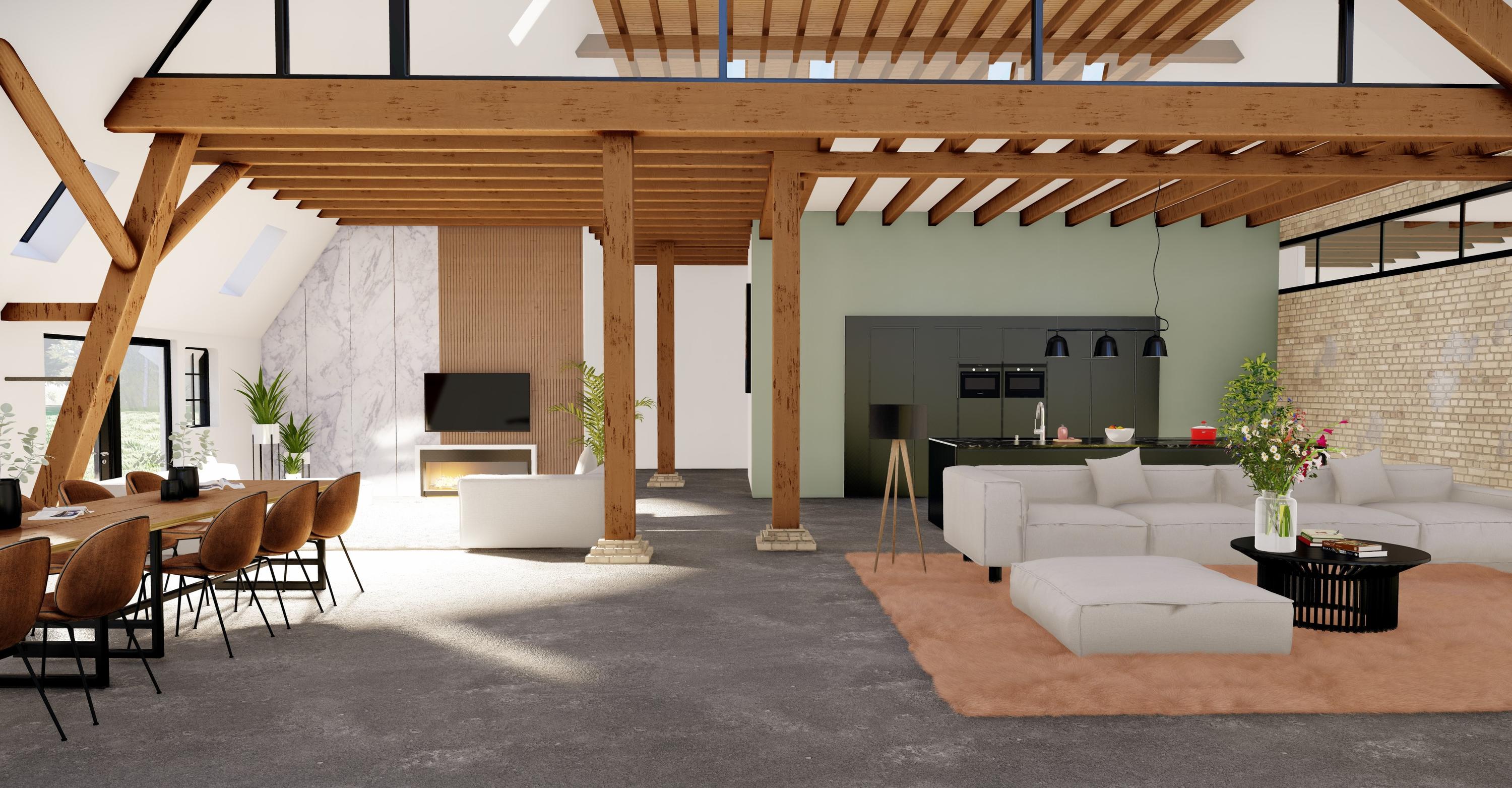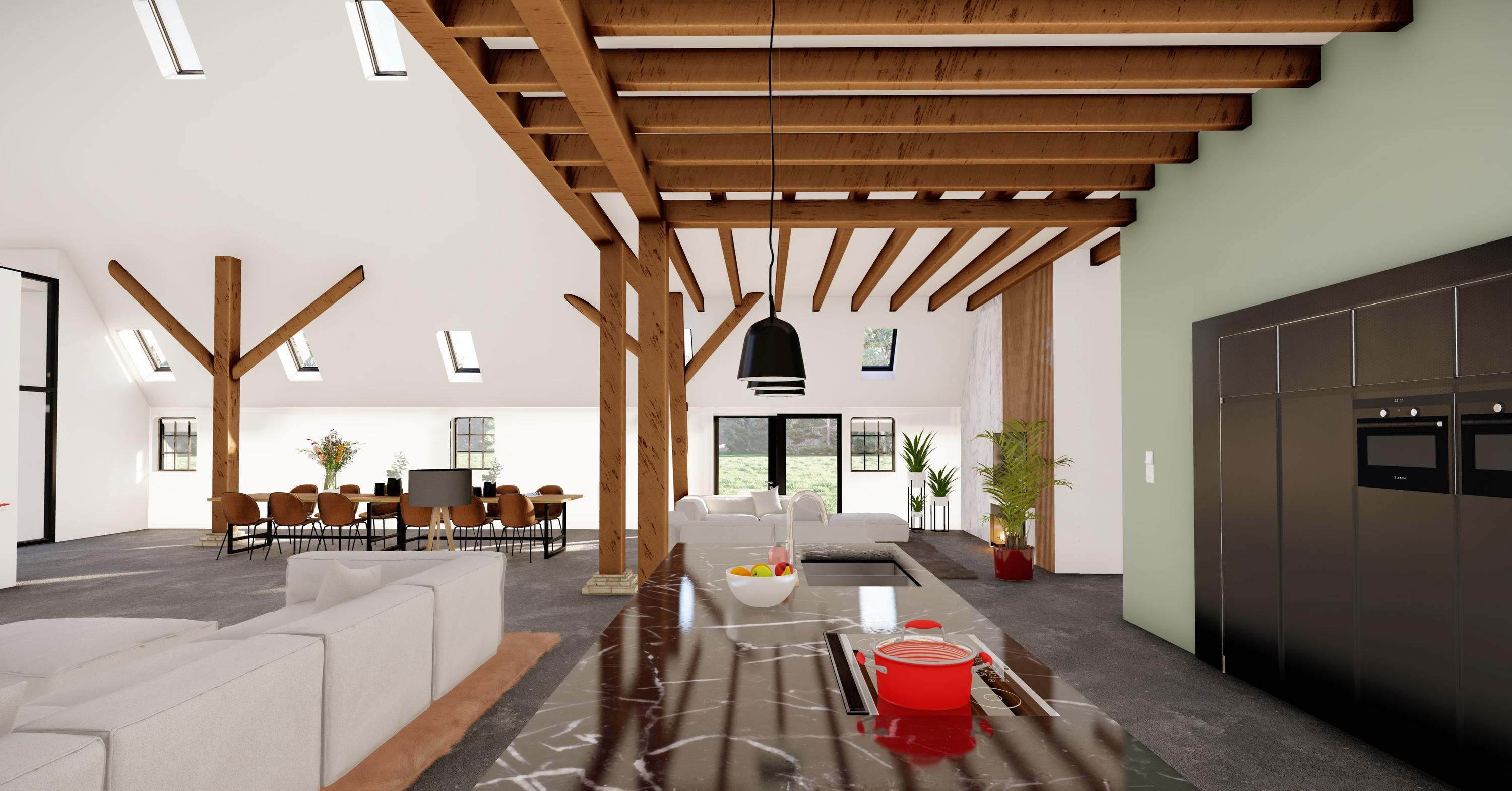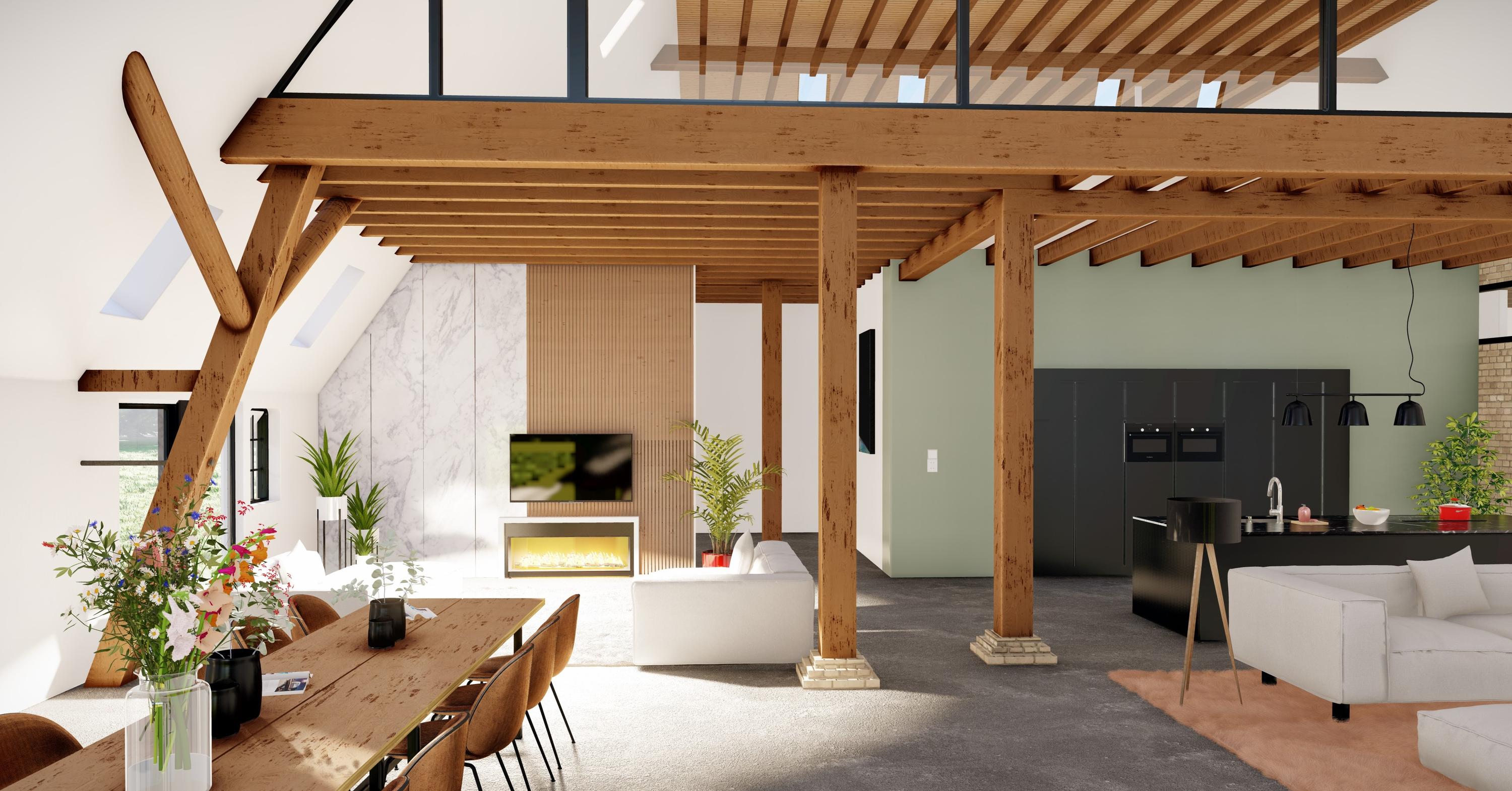 The meticulous renovation preserves the original wooden beams, stable doors, and farmhouse proportions while introducing underfloor heating, modernized kitchens, and high-spec bathrooms. The main house features a living room with panoramic views over pastures, an oak-floored kitchen with terrace access, and authentic details such as a traditional fireplace and box bed doors. The downstairs master suite enjoys a luxurious bath, private terrace, and walk-in wardrobe.