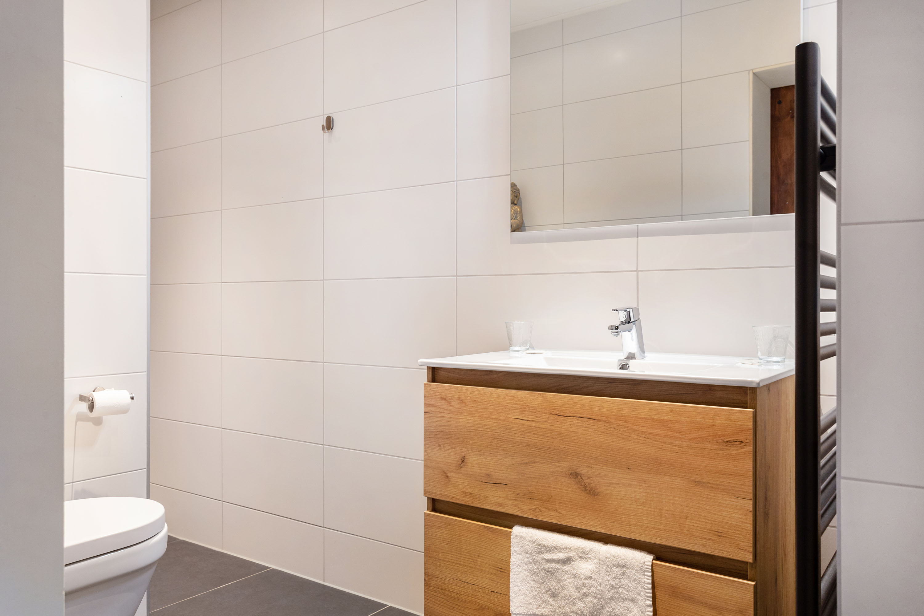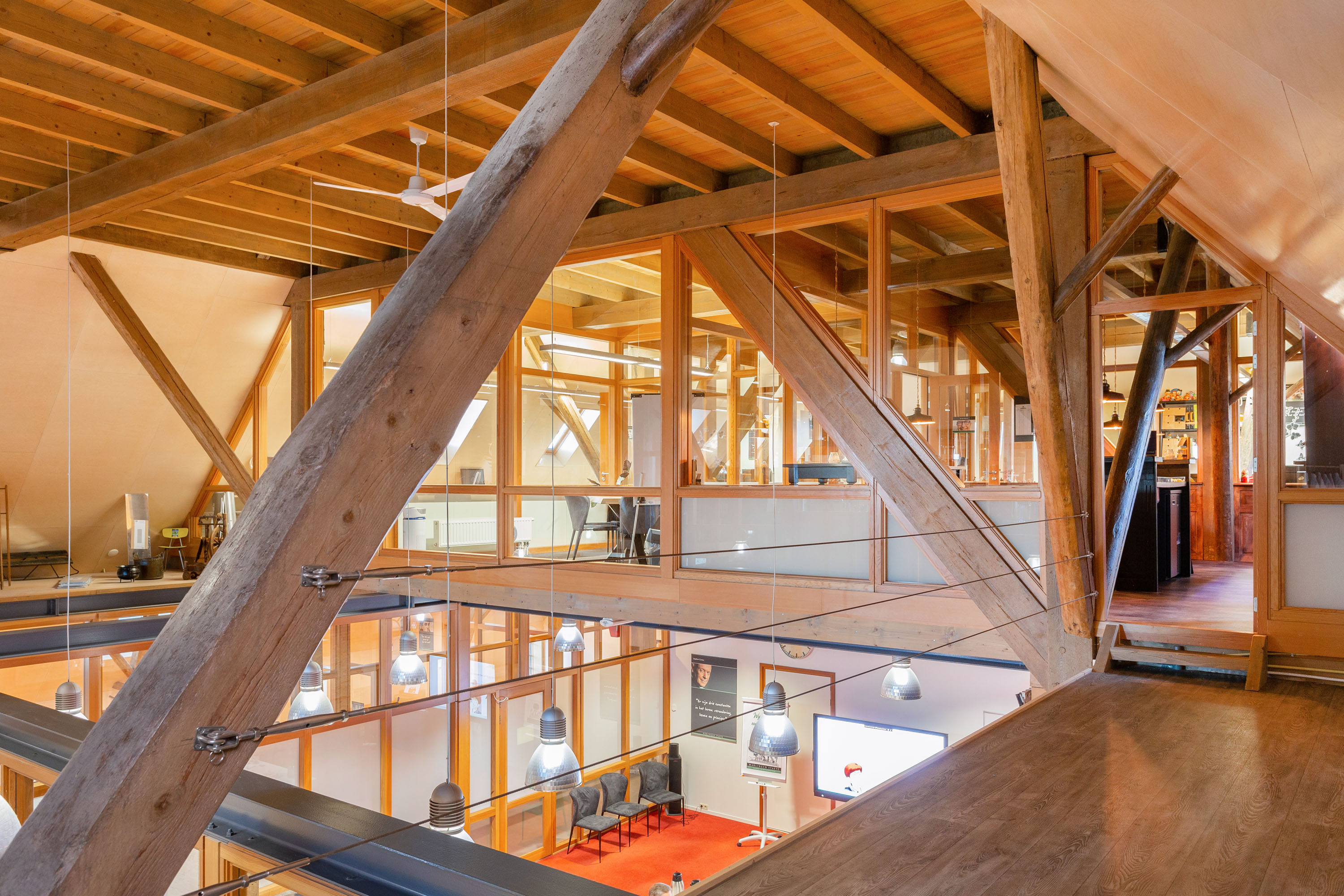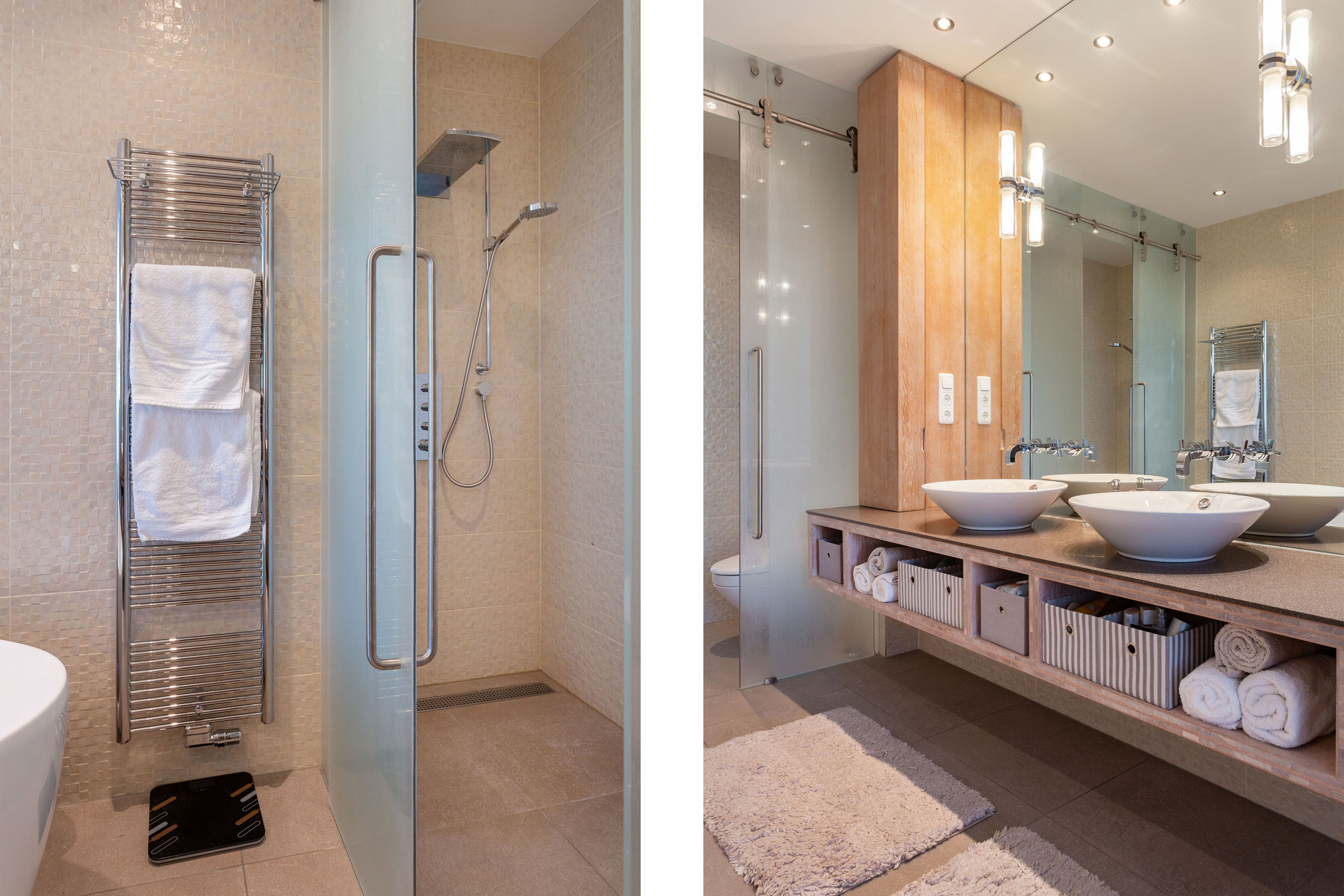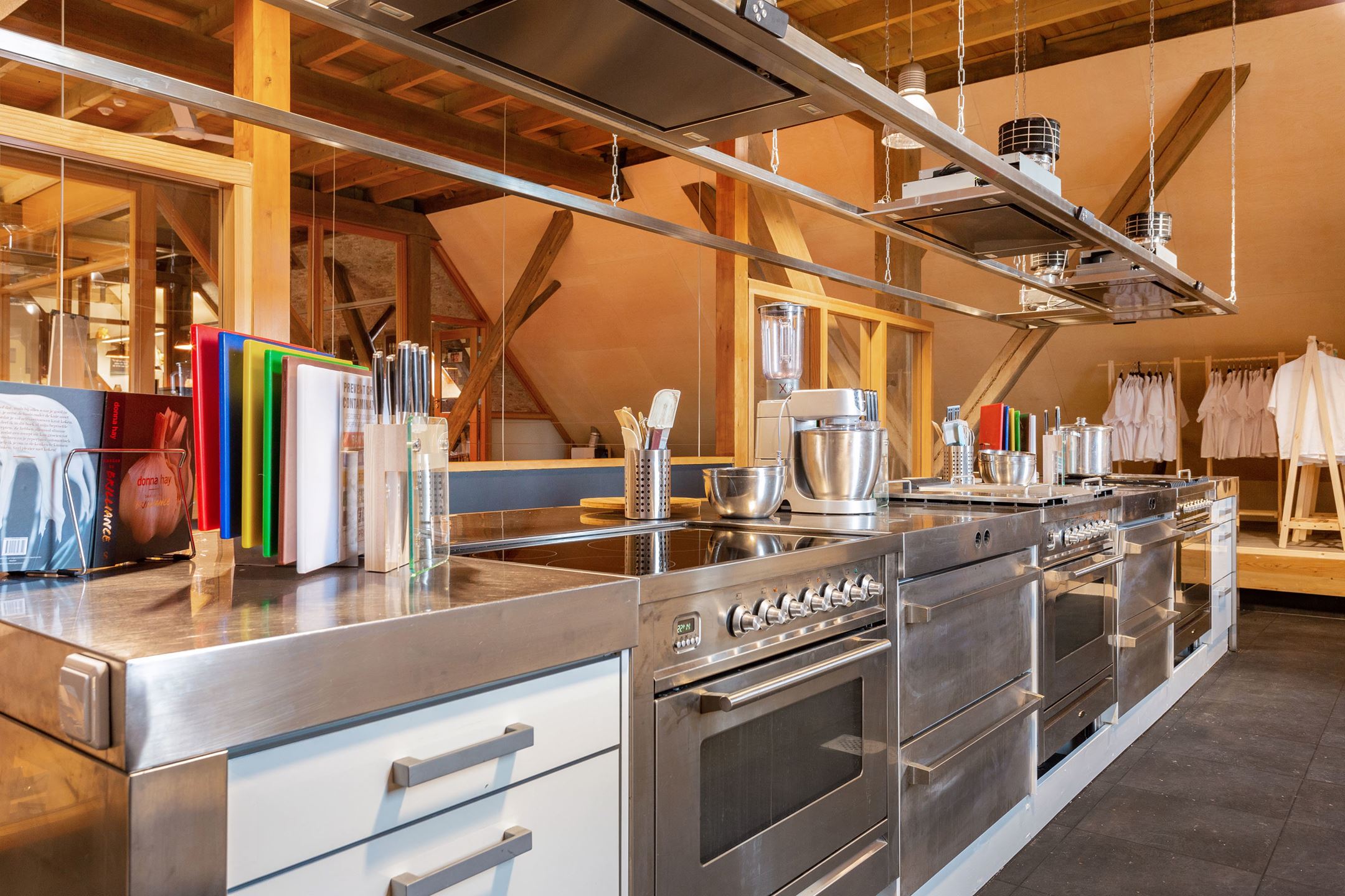 The meticulous renovation preserves the original wooden beams, stable doors, and farmhouse proportions while introducing underfloor heating, modernized kitchens, and high-spec bathrooms. The main house features a living room with panoramic views over pastures, an oak-floored kitchen with terrace access, and authentic details such as a traditional fireplace and box bed doors. The downstairs master suite enjoys a luxurious bath, private terrace, and walk-in wardrobe.