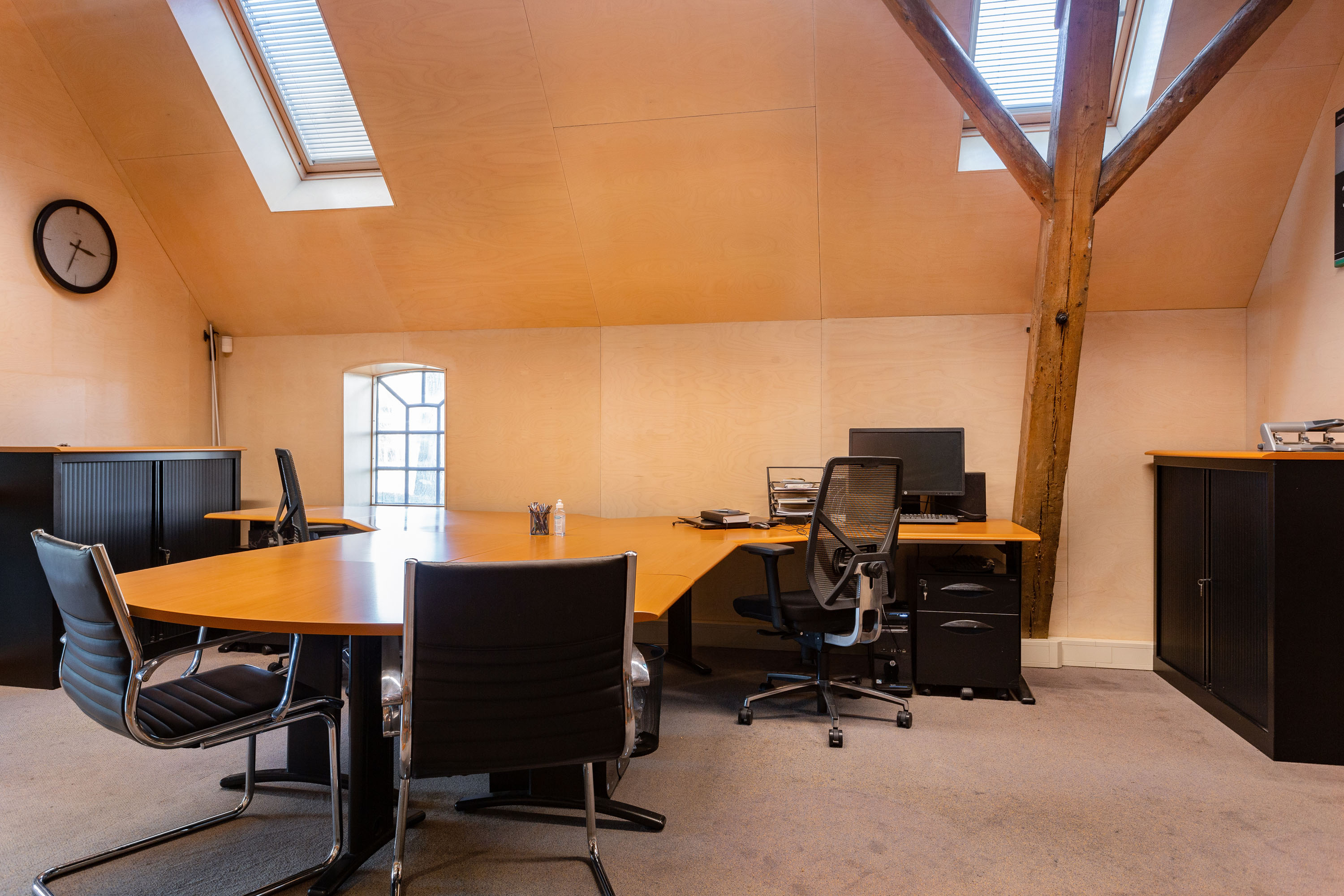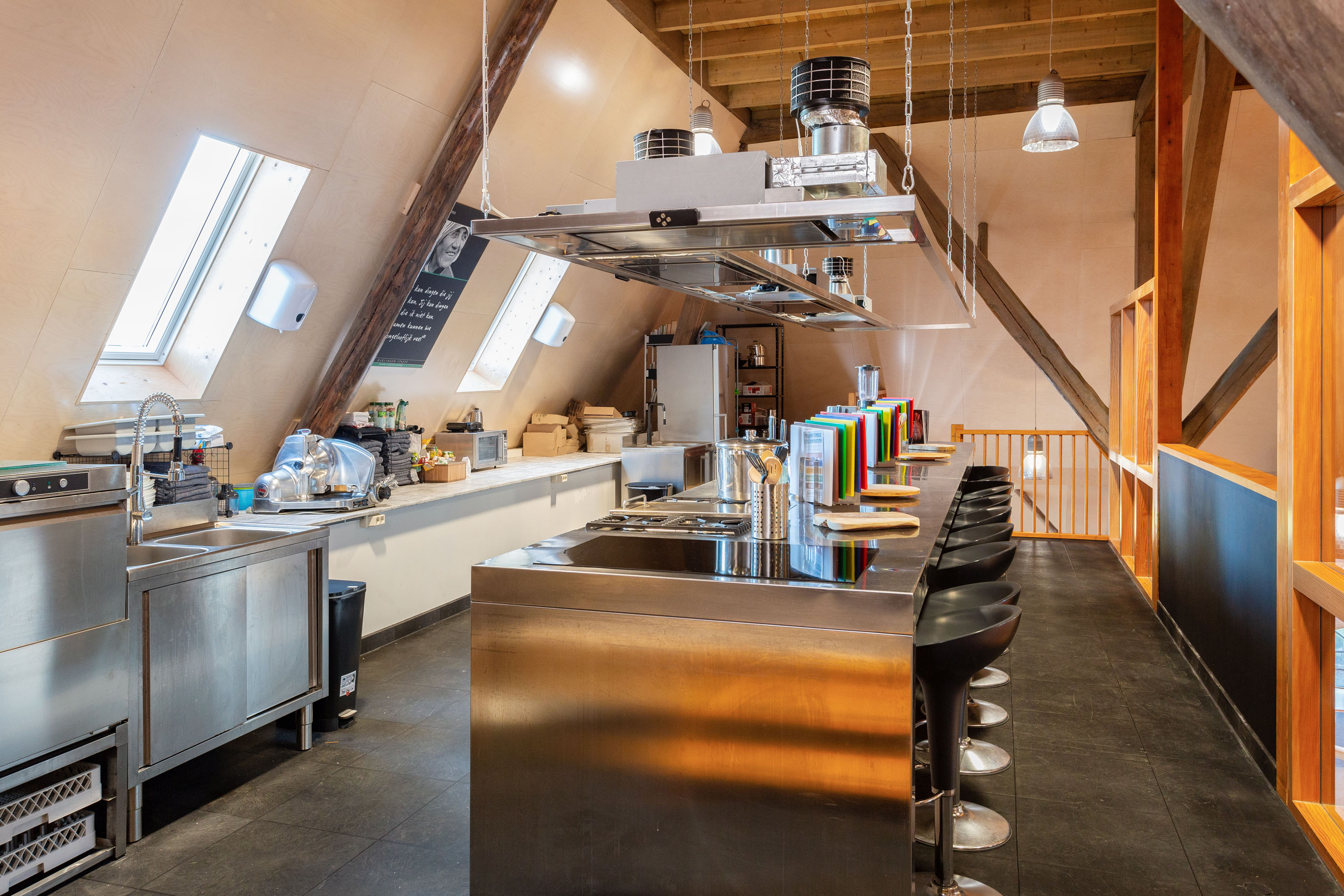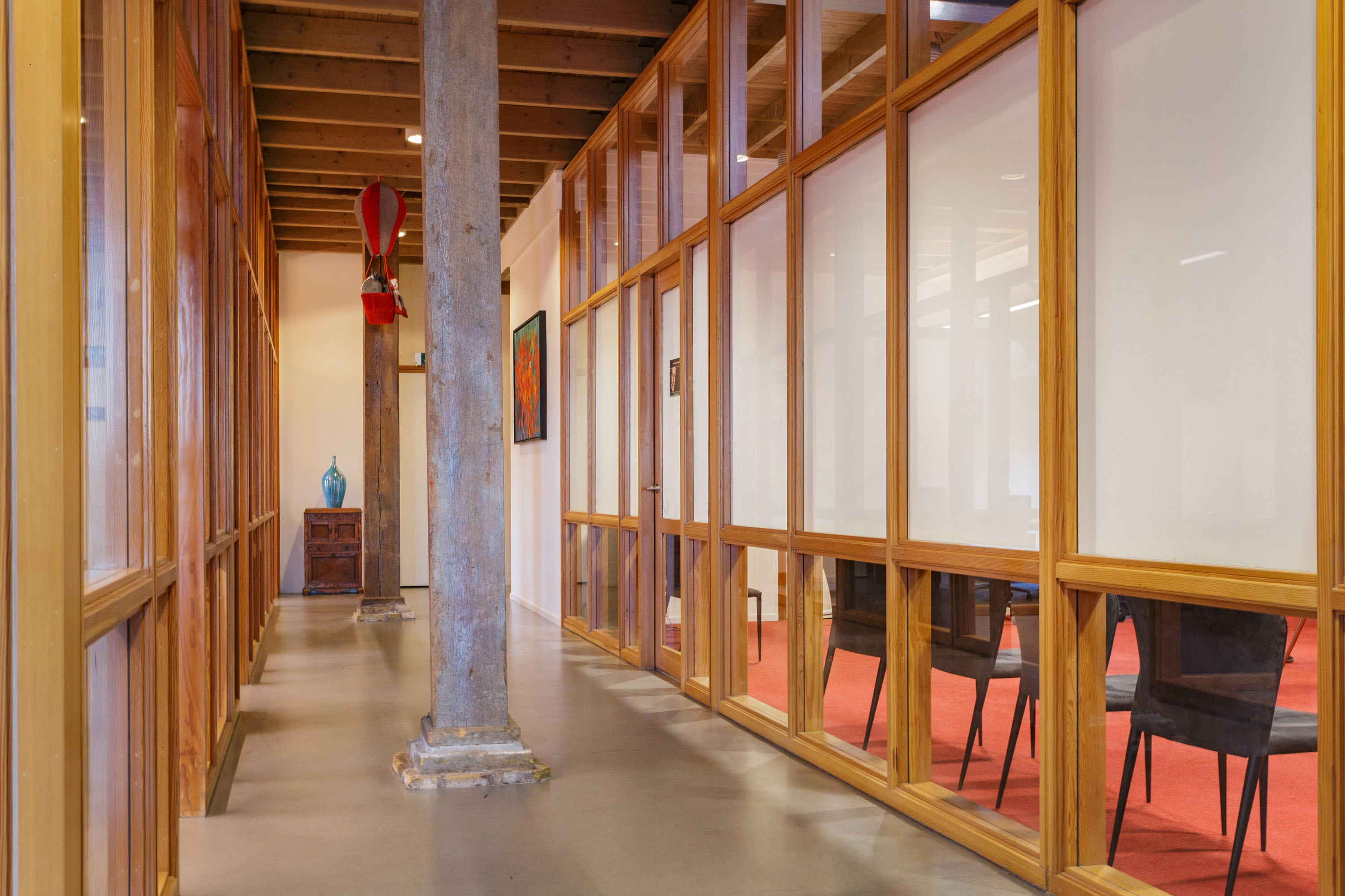Connected by a glass porch, the adjoining barn encompasses adaptable office spaces, a large multifunctional hall crowned by the barn’s original trusses, a professional cooking studio, a bar, and entertainment areas. Upstairs, skylit rooms offer privacy and light, each with independent staircases and ample storage. The barn’s lower floor may be transformed into a fully independent residence if desired.
