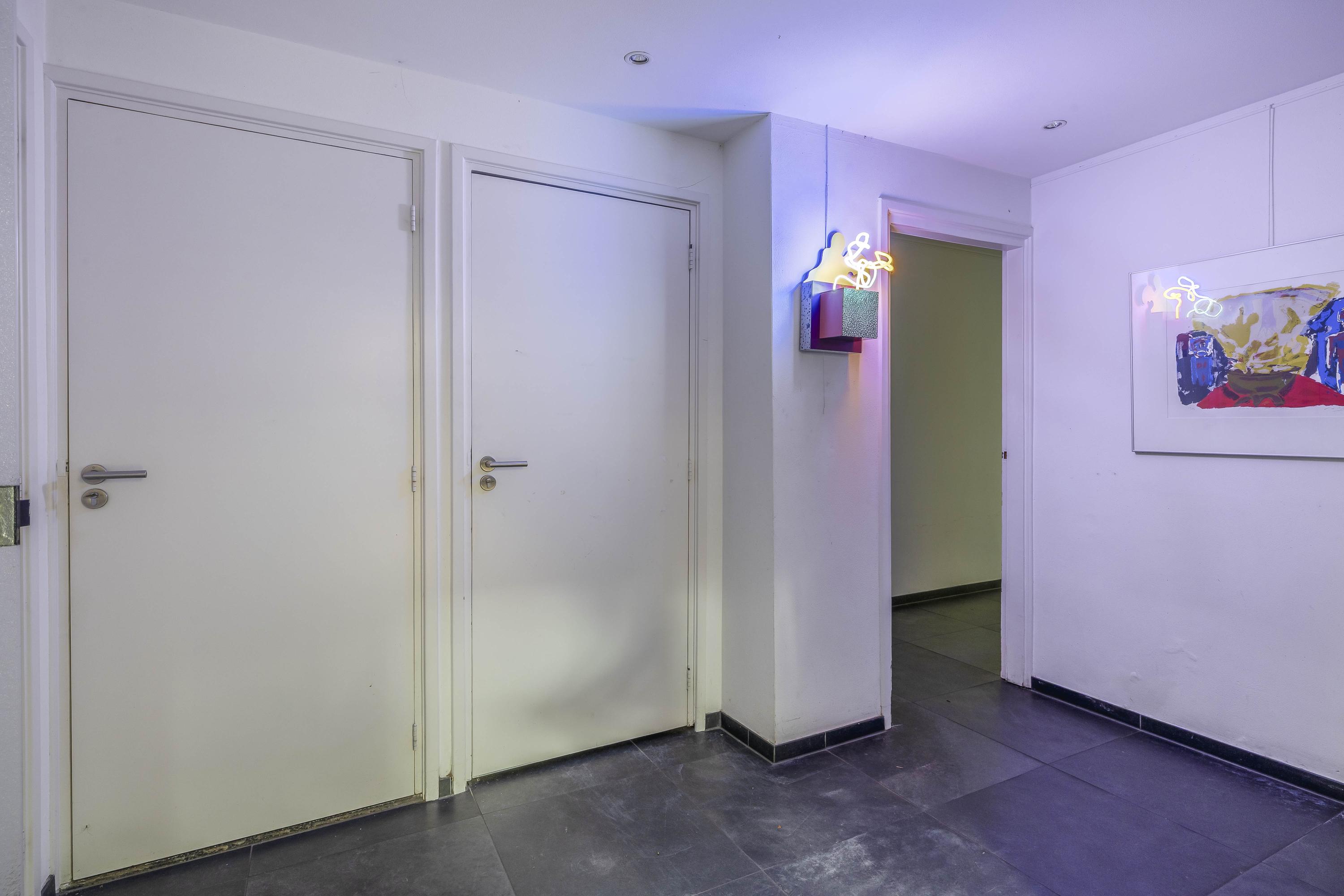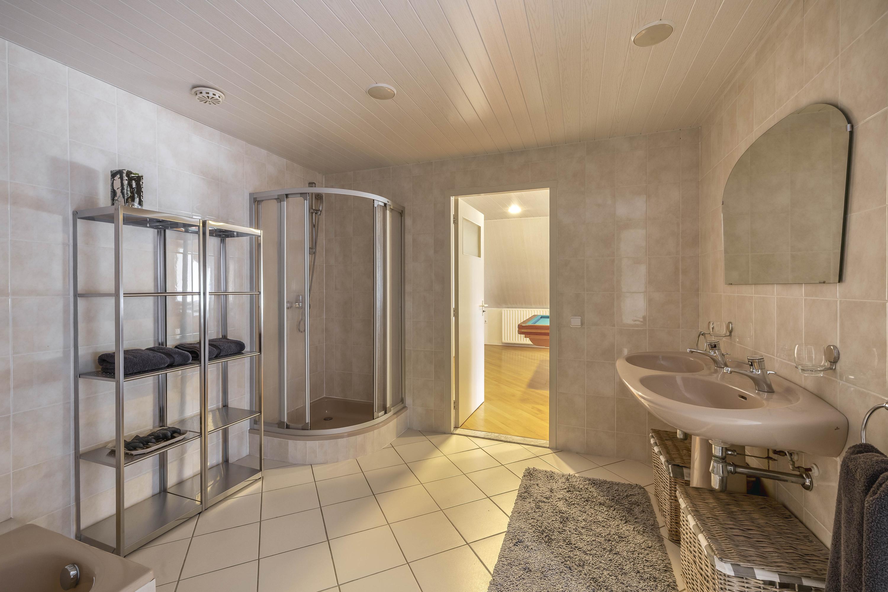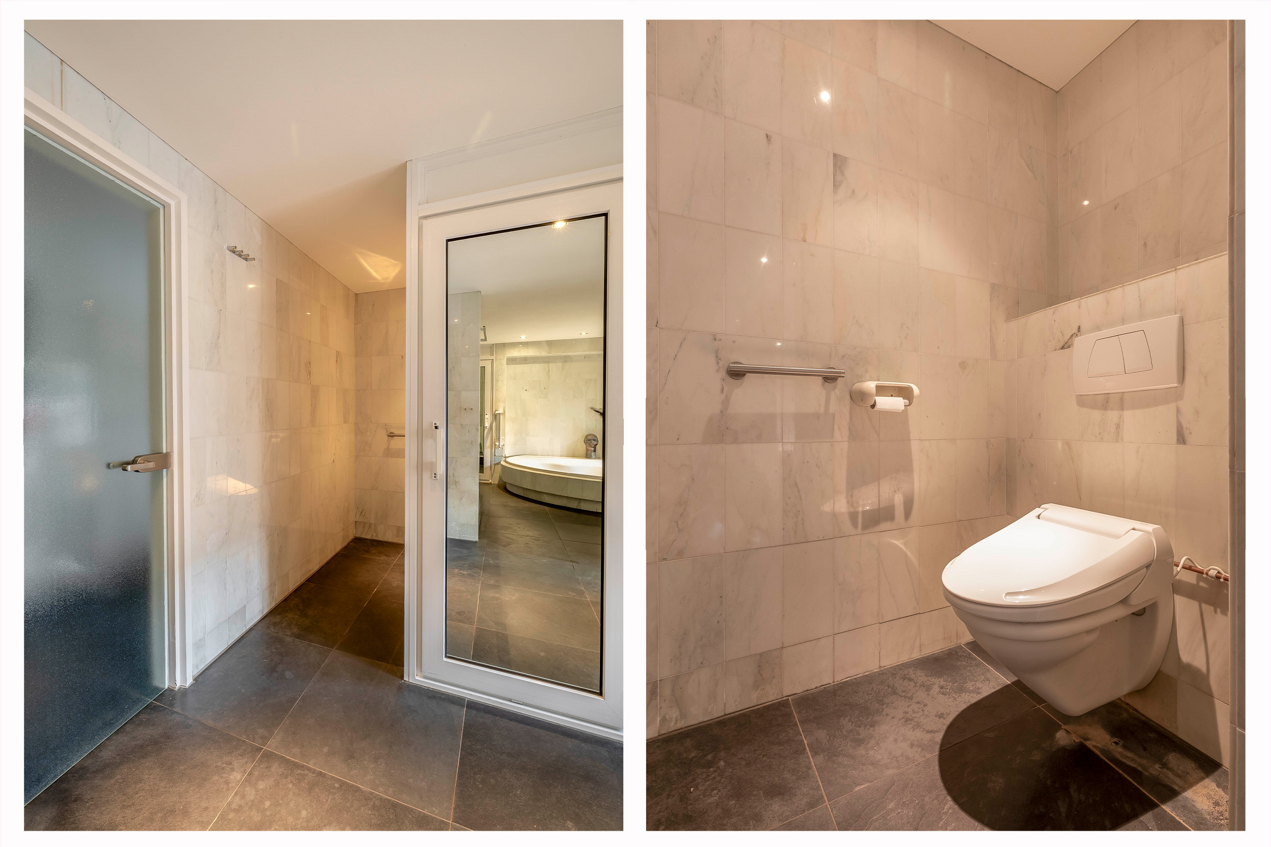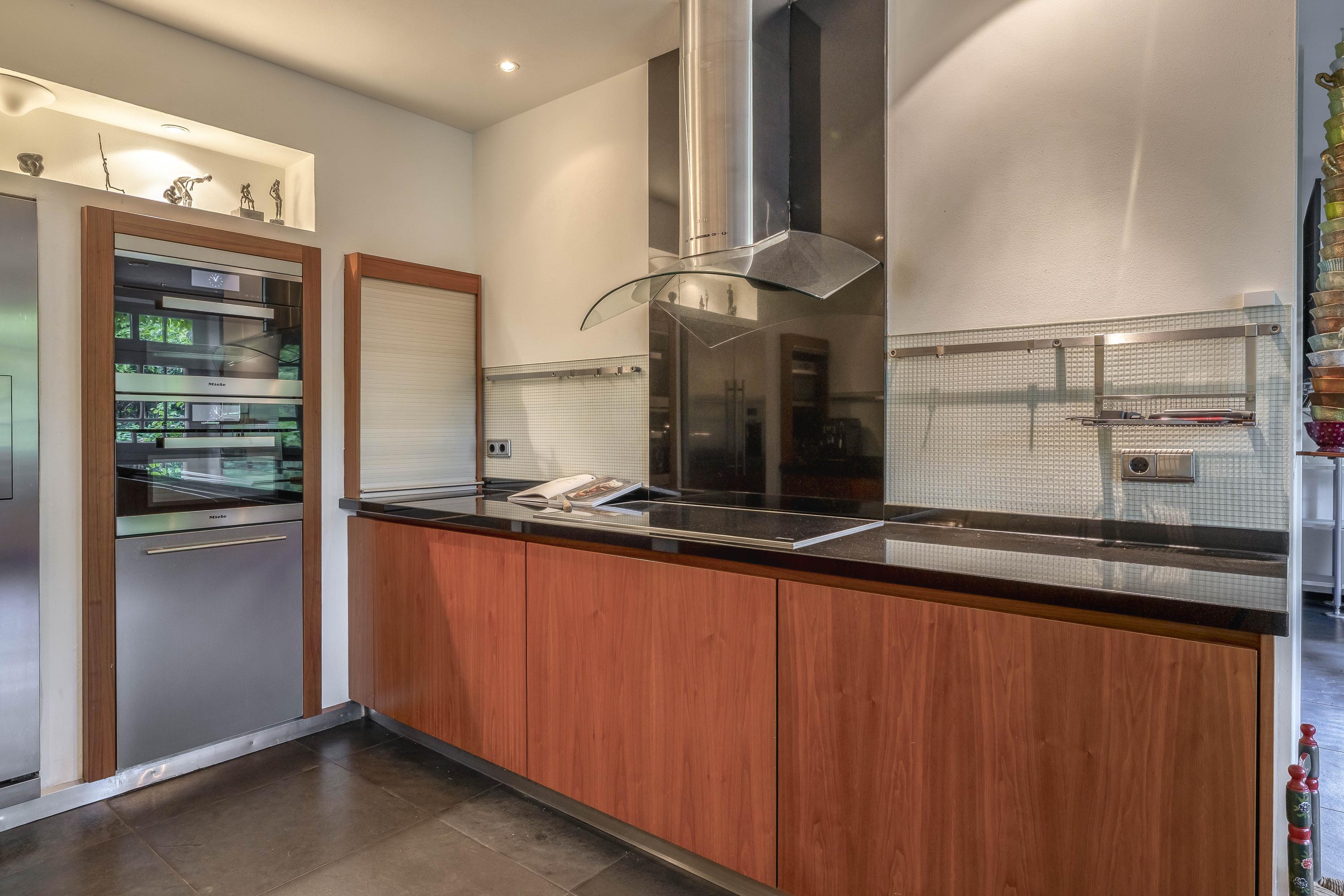 with a tiled floor. A wood-burning stove also provides extra atmosphere and warmth here. The spacious bedroom has a natural stone floor, stucco walls and a stucco ceiling with recessed lighting. A window provides natural light and ventilation. The room also has two built-in cupboards. The spacious bathroom is fully tiled with a stucco ceiling with recessed lighting. The bathroom is also equipped with a corner bath (whirlpool), shower, double wide washbasin with large vanity unit, bidet and separate toilet. The room also has two practical built-in cupboards. A second hall provides access to the kitchen, laundry room, two meter cupboards and a cellar cupboard. The spacious kitchen, a pleasant, light room with an adjoining dining area, is fitted with a double wall unit containing all the necessary high-quality appliances (Miele): two sinks with taps and a hot water tap (Quoocker), an American fridge (including freezer) with cold water tap and ice cube machine, microwave, dishwasher, steam oven, oven and a 5-burner induction hob. Various cupboards and drawers provide ample storage space. The kitchen has a natural stone floor with underfloor heating, stucco walls and a stucco ceiling. A practical built-in cupboard provides even more storage space. A door provides access to the garden. From the kitchen, a closed staircase provides access to the first floor. The connections for the washing machine and dryer are located in the laundry room. Next to the kitchen is a multifunctional room, which was previously used as a study, but could also serve as a playroom or chill-out room. This room has a tiled floor, stucco walls and a wooden beamed ceiling and offers a fantastic view of the trees.