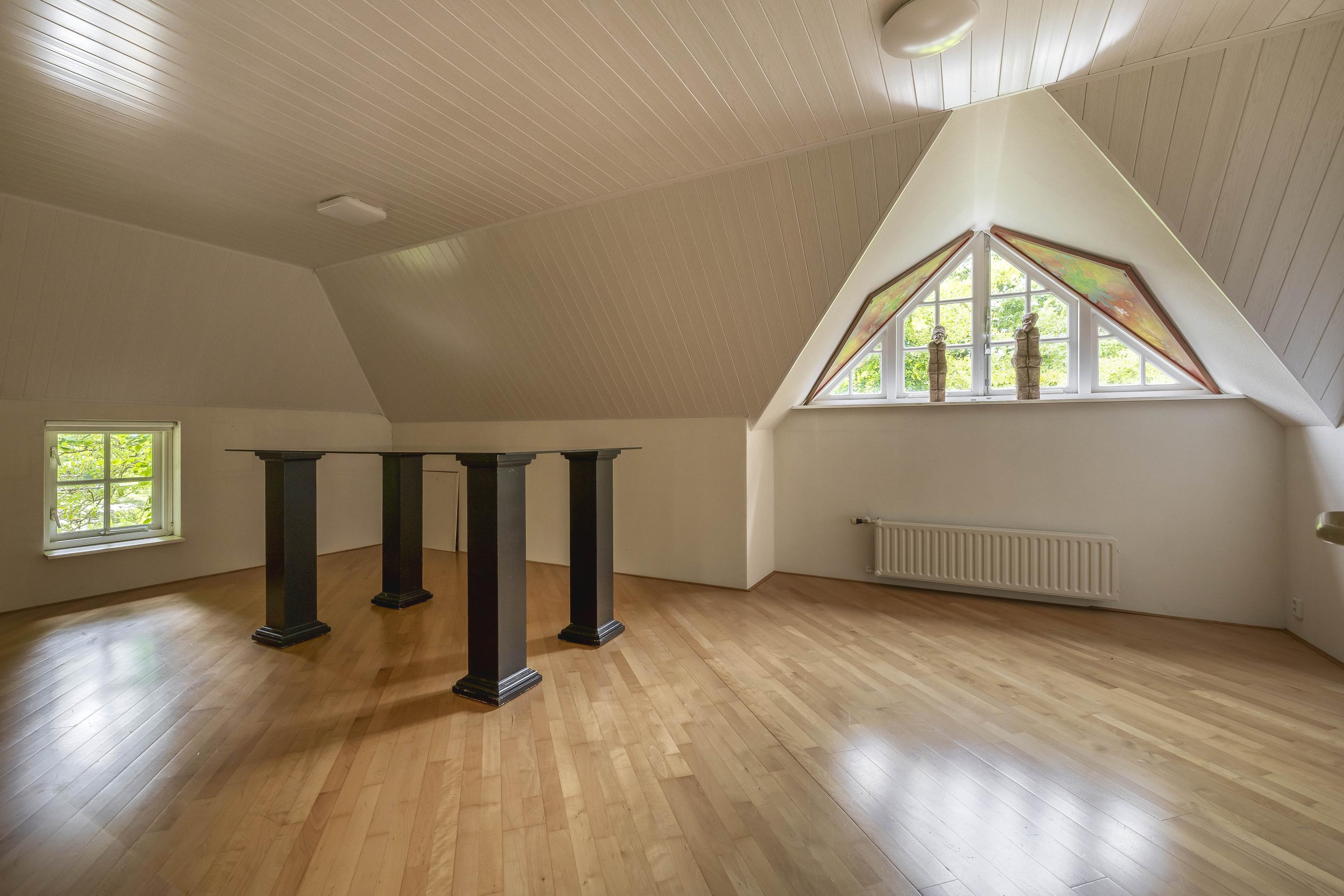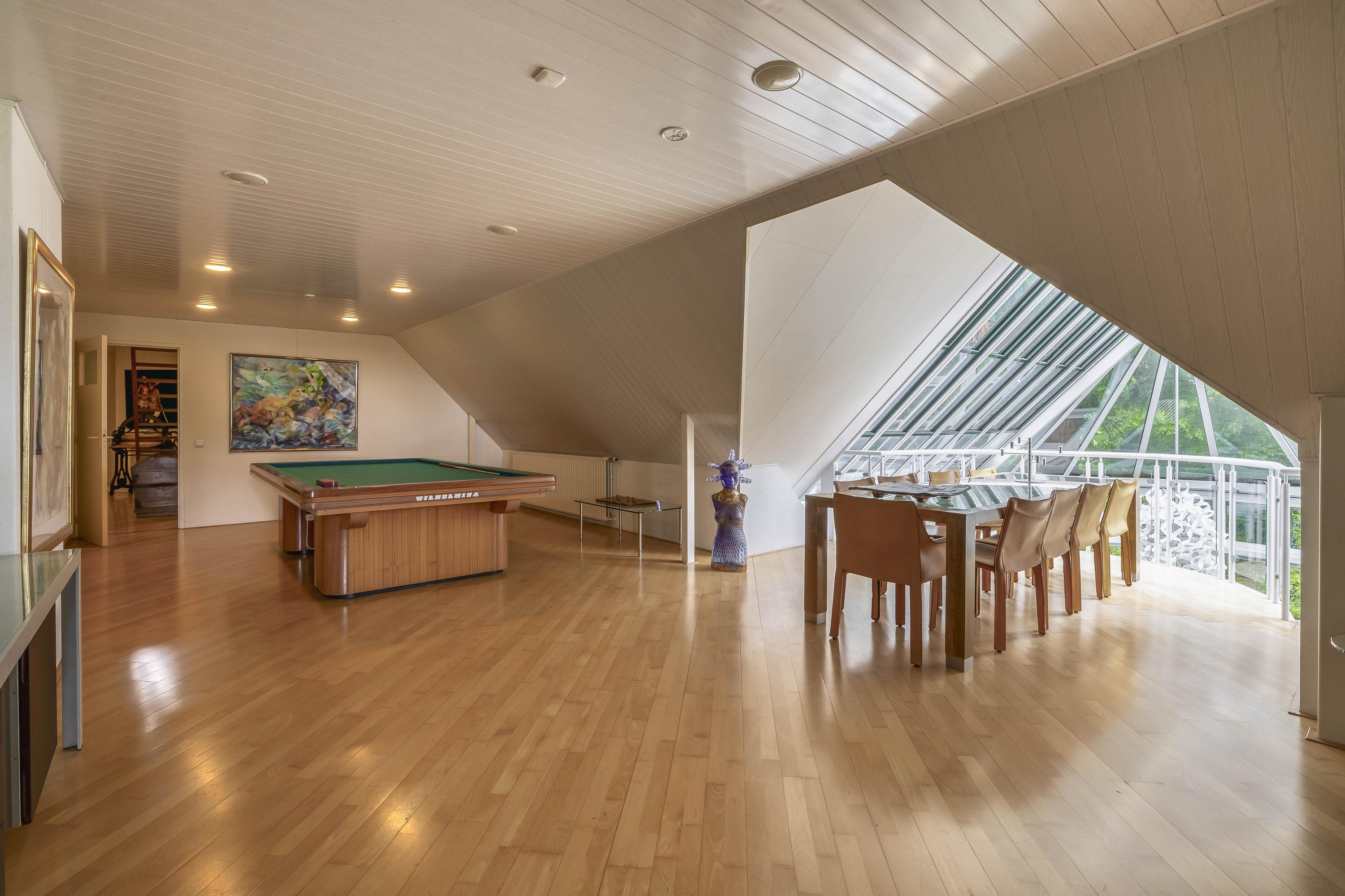 A spiral staircase leads from the living room to the first floor. The landing is finished with a parquet floor, stucco walls and a panelled ceiling. A landing provides access to a spacious room, which offers space for additional (bed)rooms, but due to the current layout can also be converted into a billiard room or chill-out room and, with an internal division of the house, can also serve as a living room.