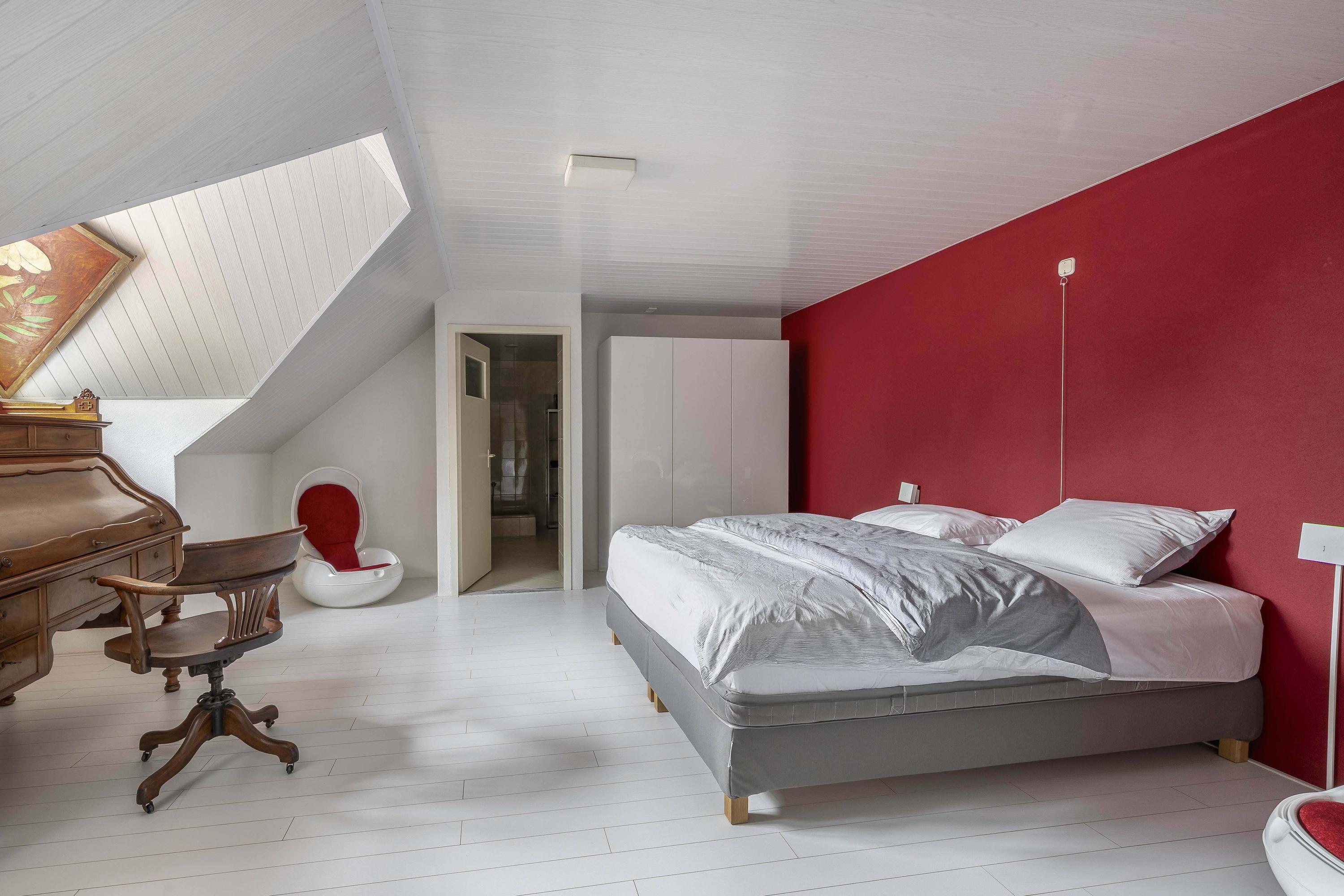 recessed lighting. A dormer window provides natural light and ventilation. A fixed staircase provides access to the attic. The storage room also has parquet flooring, stucco walls and a panelled ceiling. Bedroom II is finished with parquet flooring, stucco walls and a panelled ceiling. A dormer window and a window provide natural light and ventilation. Storage space has been created under the sloping roof. Bedroom III also has parquet flooring, stucco walls and a panelled ceiling. A window provides natural light and ventilation. Here too, storage space has been created under the sloping roof. The attic space has a wooden floor. Five skylights ensure that the space enjoys plenty of natural light. There is also an owl box. From the first floor, a second staircase provides access to the kitchen on the ground floor.
