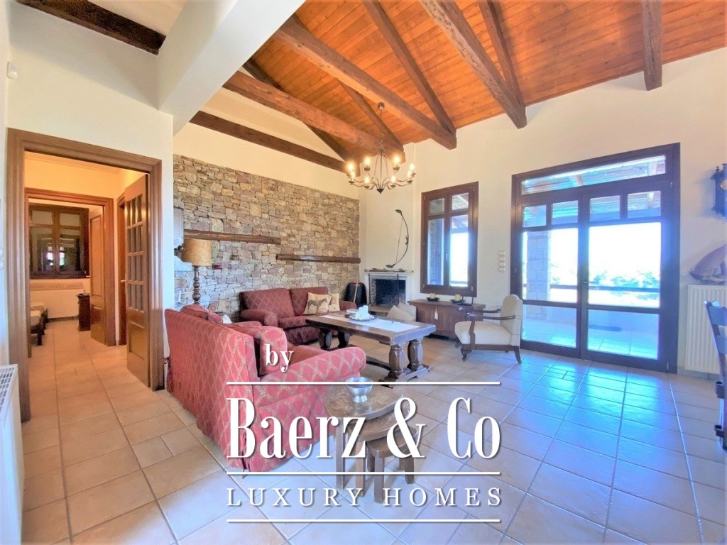 access to the terrace of the building from which one can enjoy the sea view. Continuing we find the two bedrooms, along with a bathroom and a small WC. On the lower elevation one finds two different apartments. Each has an open plan living and kitchen area, bathroom as well as bedroom areas. The surrounding area offers all amenities as it has been landscaped with a BBQ, a covered seating area by the pool and stone decorative details. This is a property of excellent construction and beauty that can combine both permanent home ownership and holiday home use.