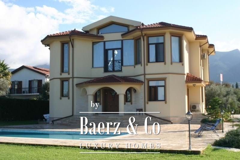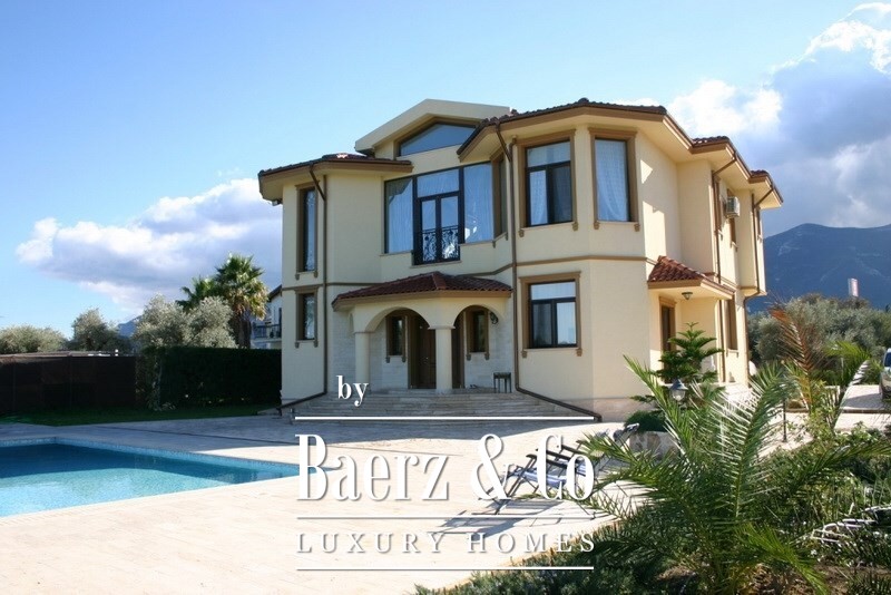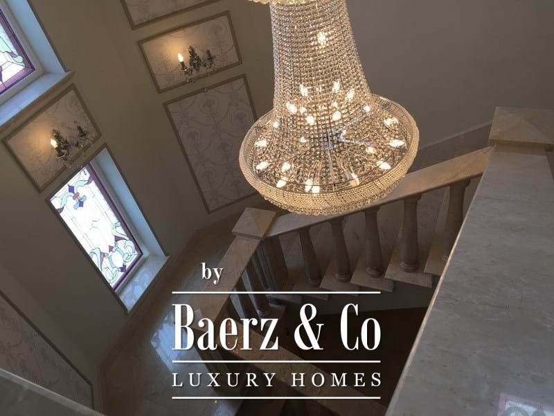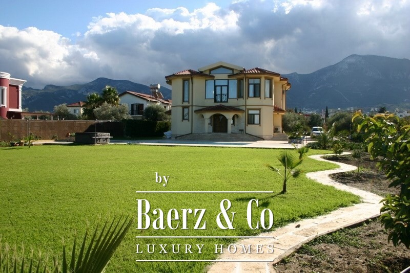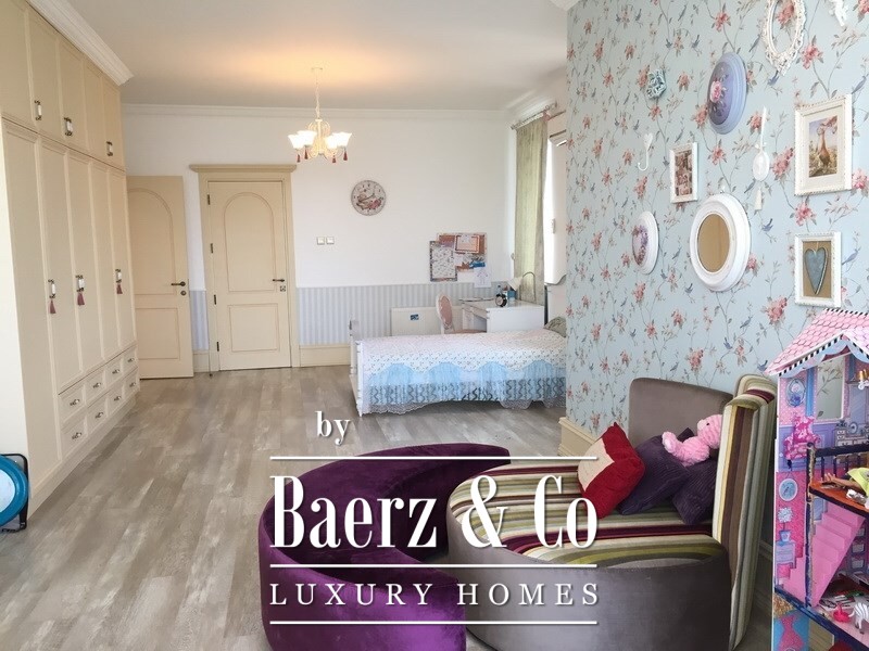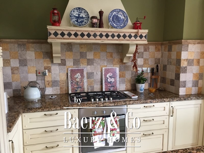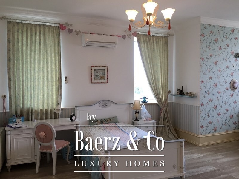 This is a beautiful elegant villa located next to the sea with a very spacious 450m2 internal size and posing high ceilings. The villa has 5 bedrooms, 3 ensuite bathrooms, 3 bedrooms having fitted wardrobes. Spacious living room, kitchen with fully fitted kitchen units, white goods, central isle and granite worktops, and is open plan to the dining room. An Impressive marble stair case of a best quality leads up to a landing area which is fully lighted up by a crystal chandelier. The landing is very spacious with large windows offering lots of natural light and has a lovely view to the sea. The garden is mature with a lovely green lawn, different fruit trees