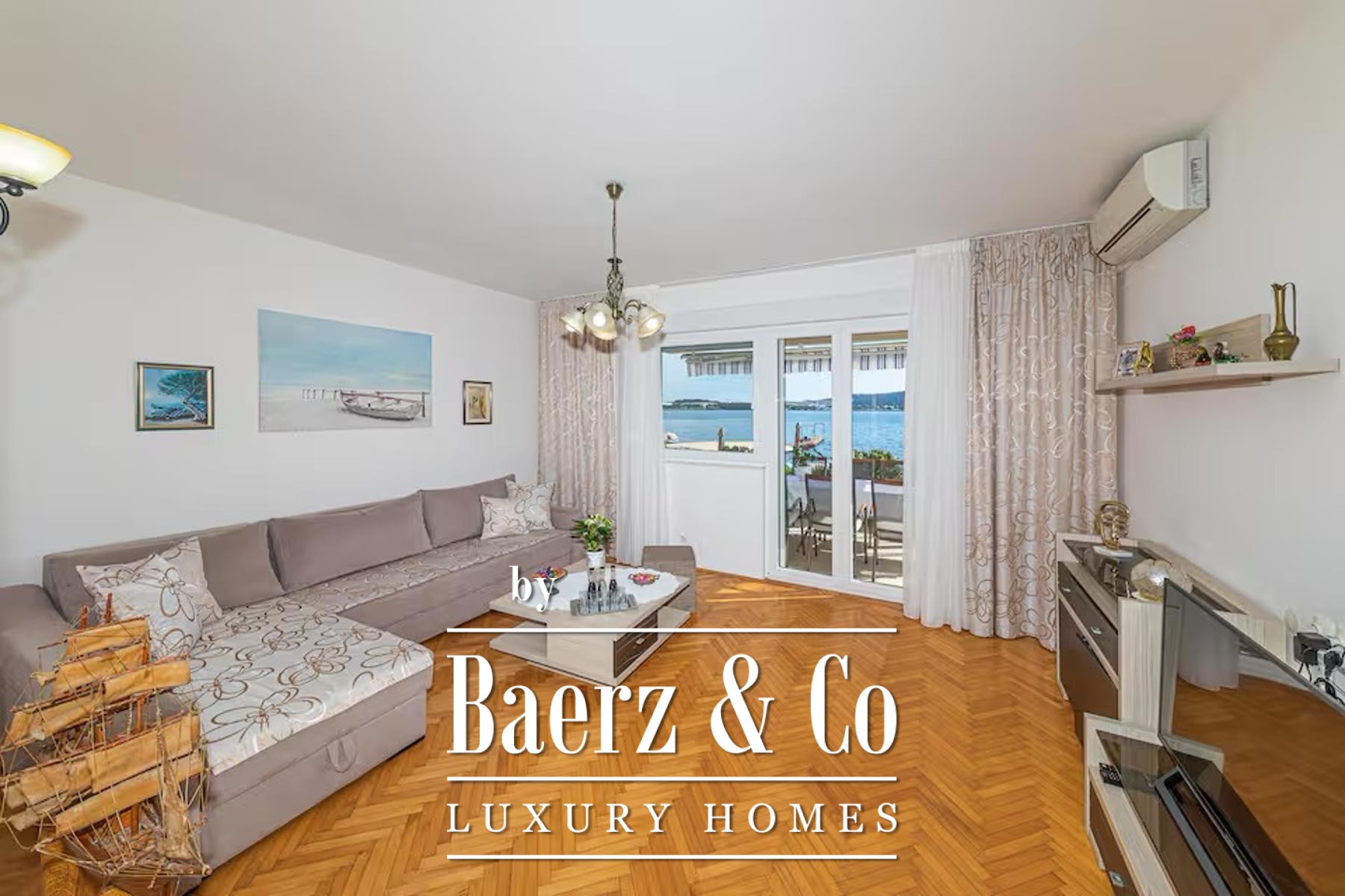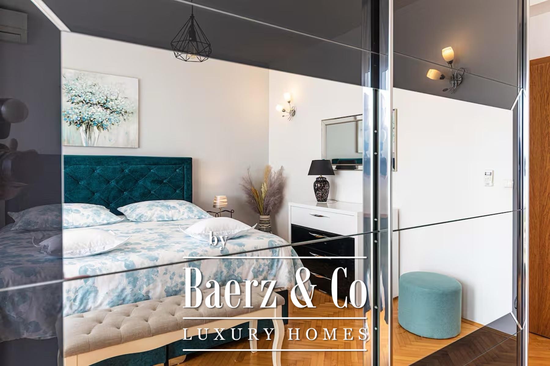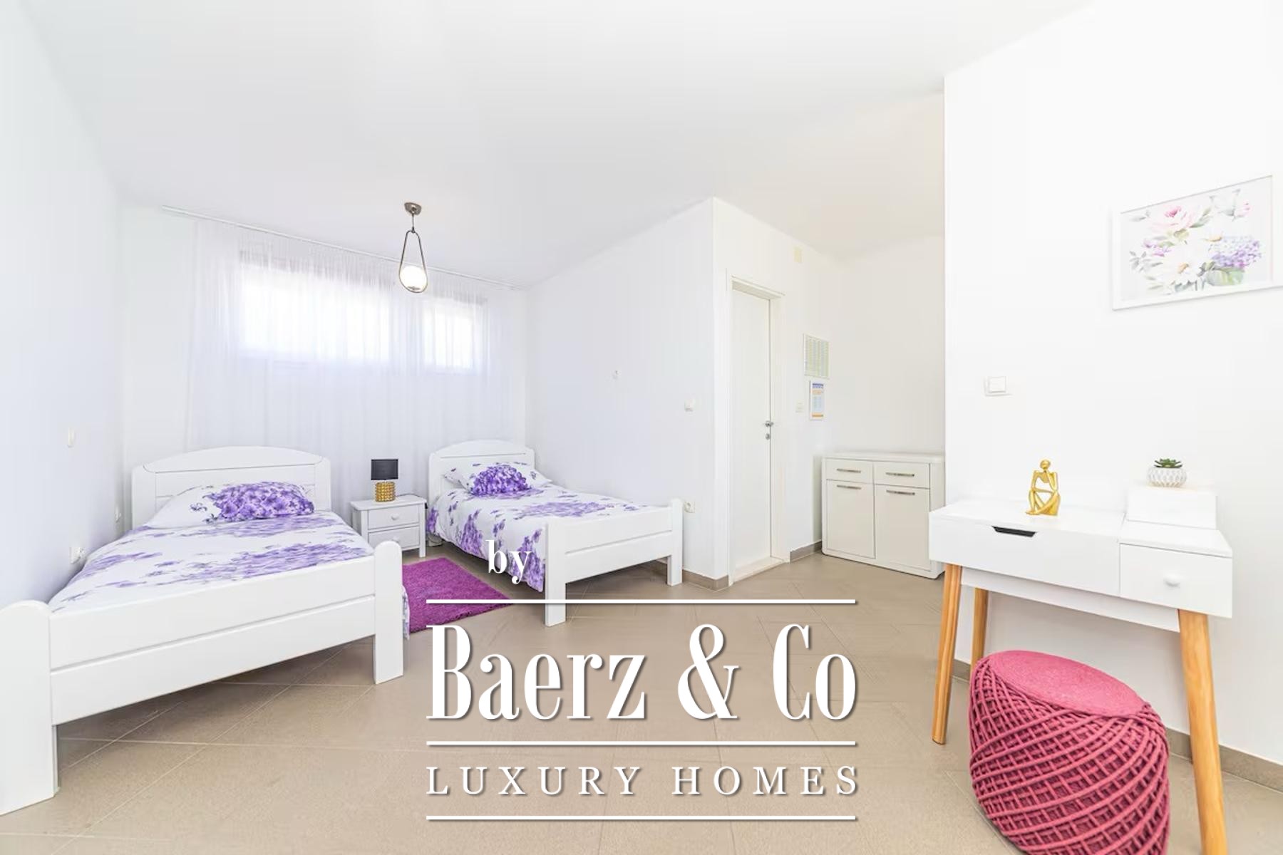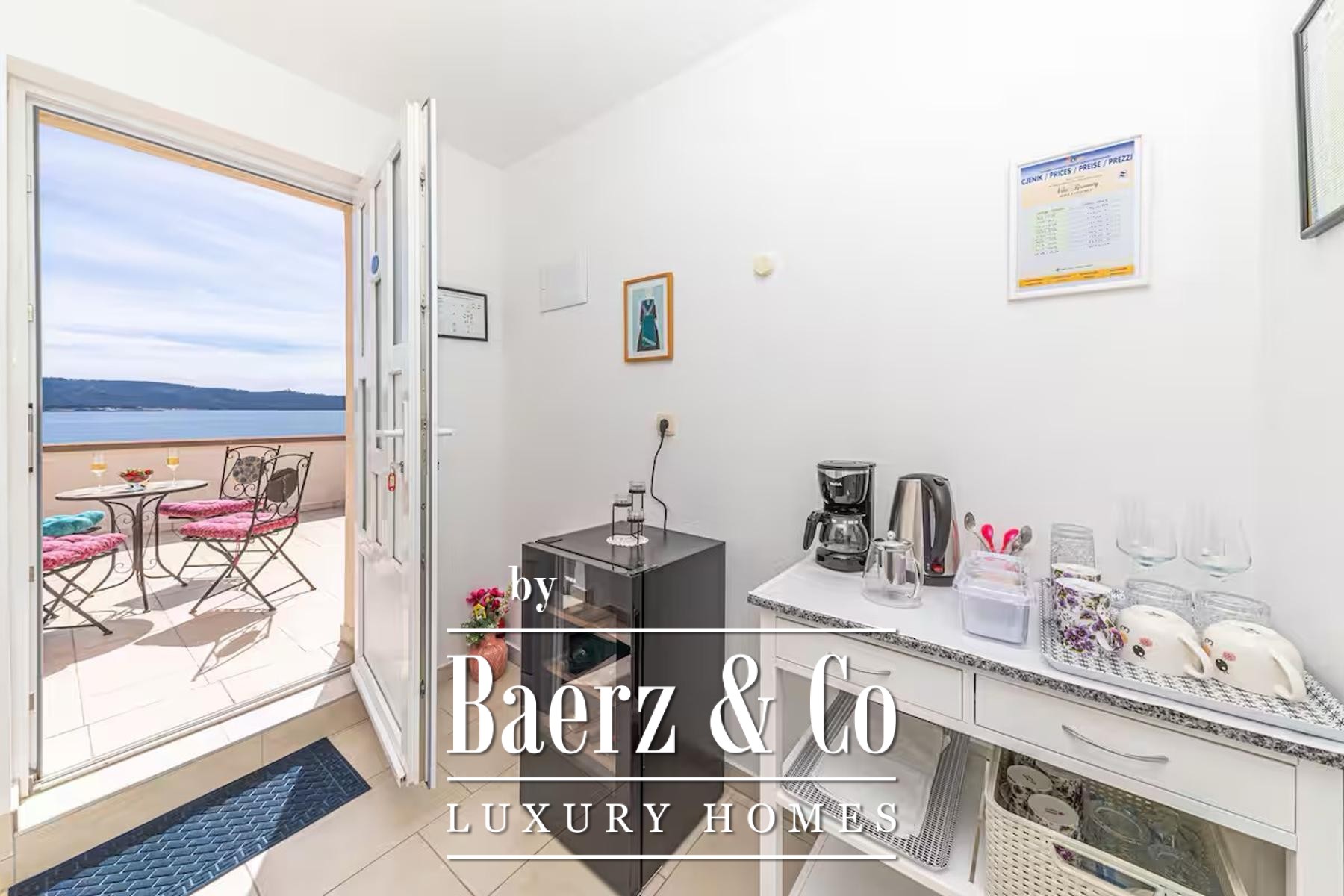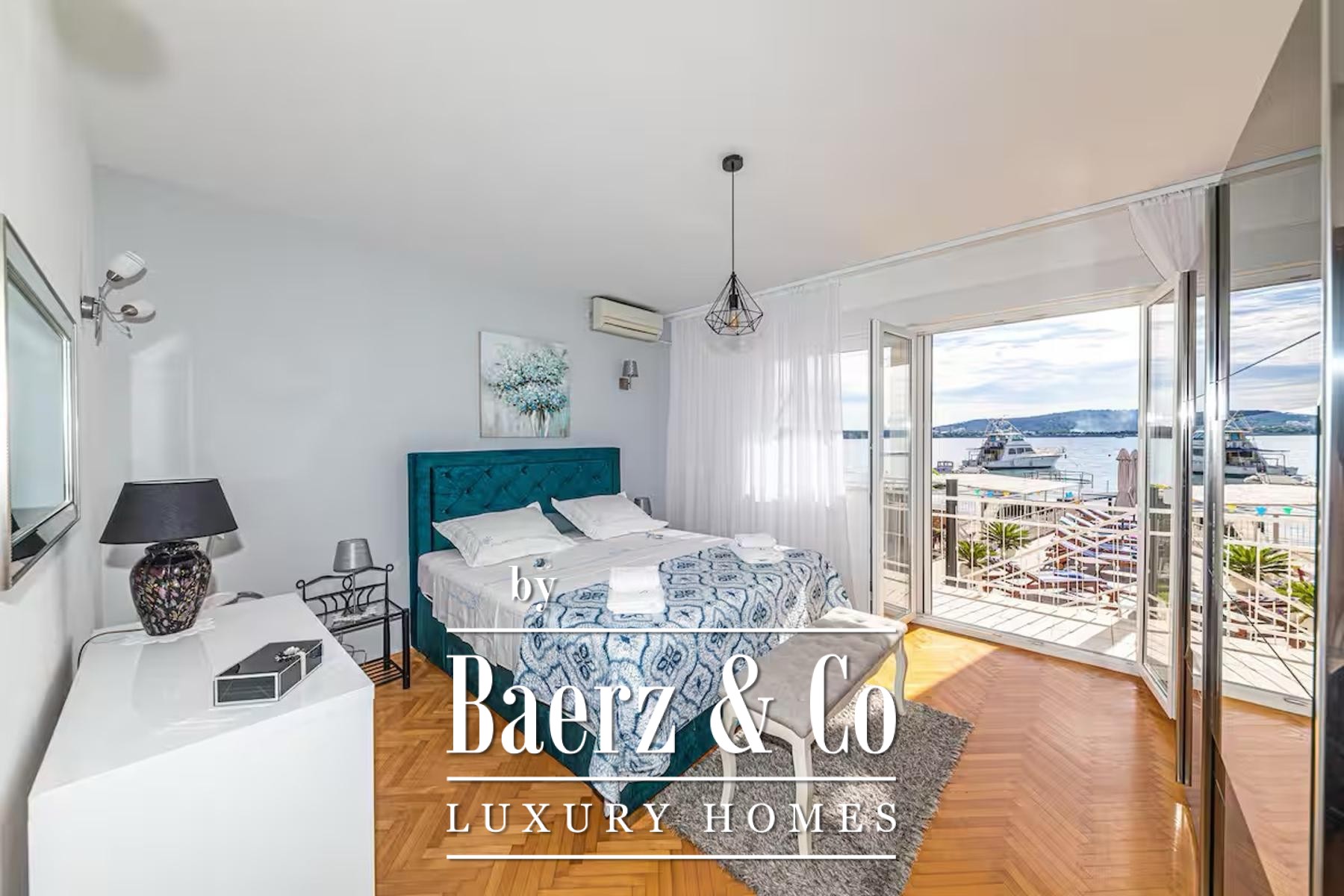 Wellness and leisurely pursuits are prioritized, with a basement offering a private garage, fitness zone, and games space. Outdoors, the south-facing private pool and jacuzzi promise peaceful afternoons, while a stone-clad, covered entertaining area with fireplace sits gracefully at the water’s edge. This house is defined by its uninterrupted sea views and a pace of life where every moment feels considered—a rare seafront house for sale in Kaštela where elegance speaks softly.