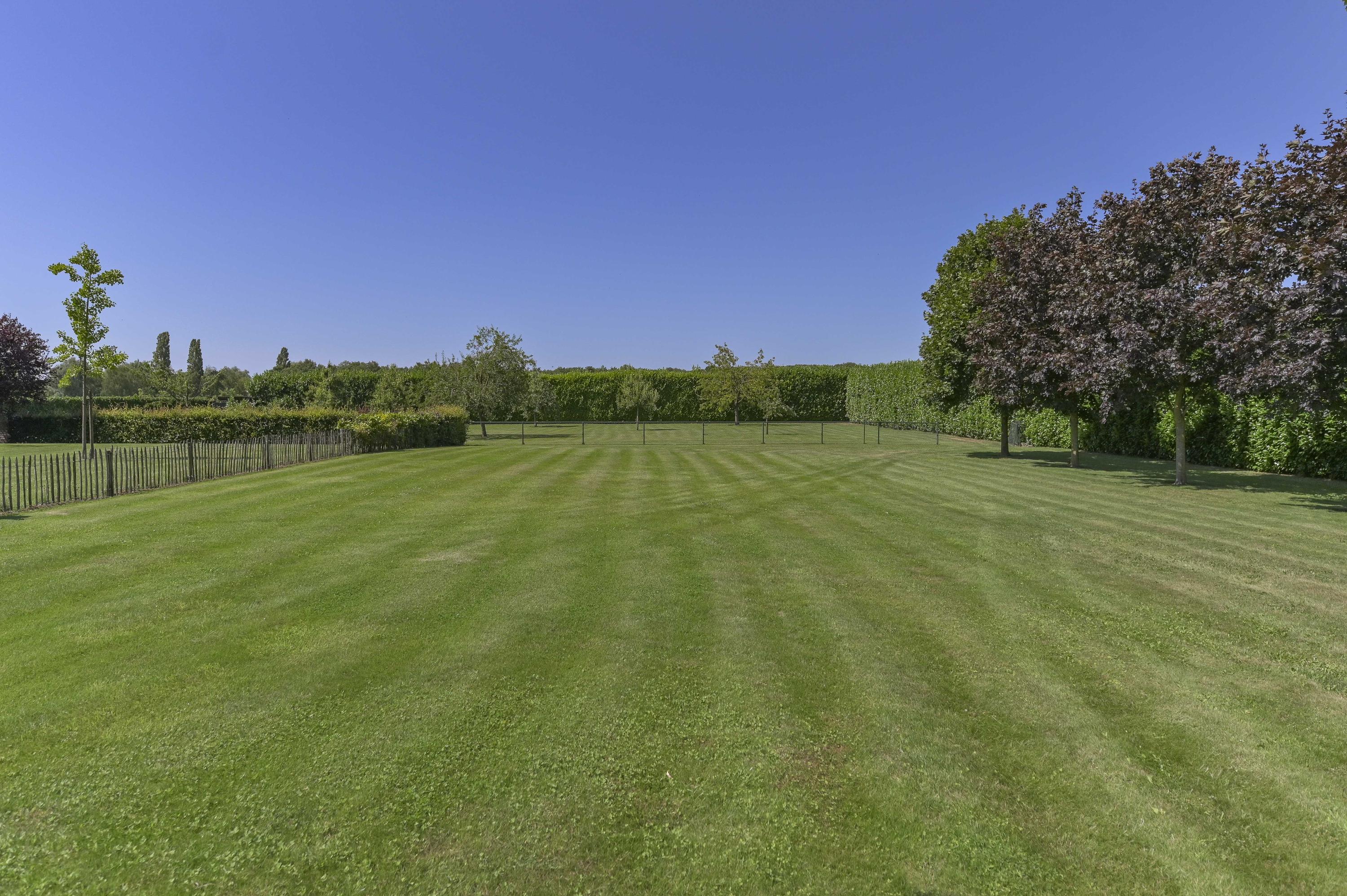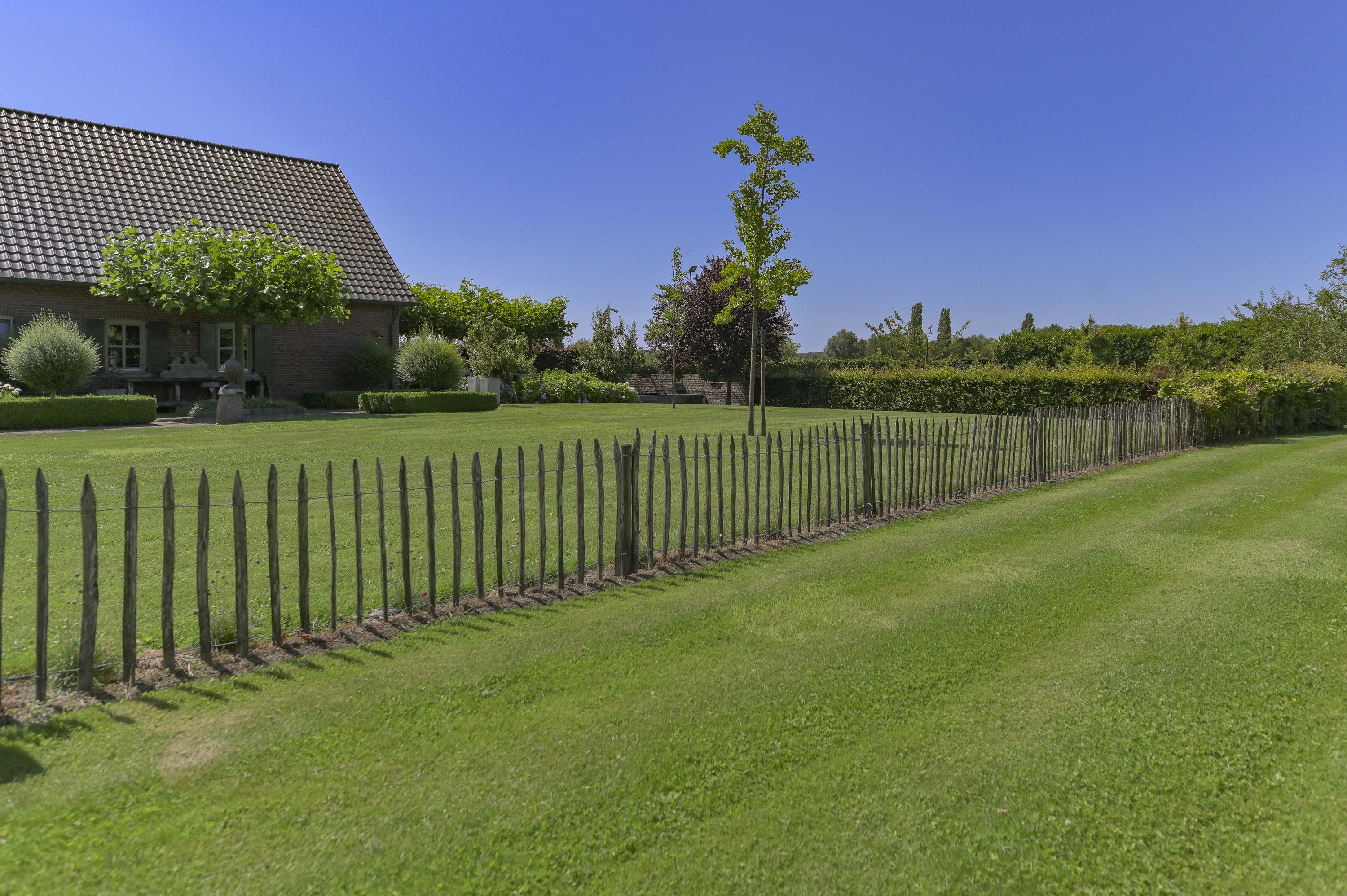 The villa sits on a large plot of 8,832 m² with a beautifully landscaped garden surrounding the house. Expansive lawns, fruit trees and mature plantings create a lush, green setting. At the front, the view stretches across meadows and the river.