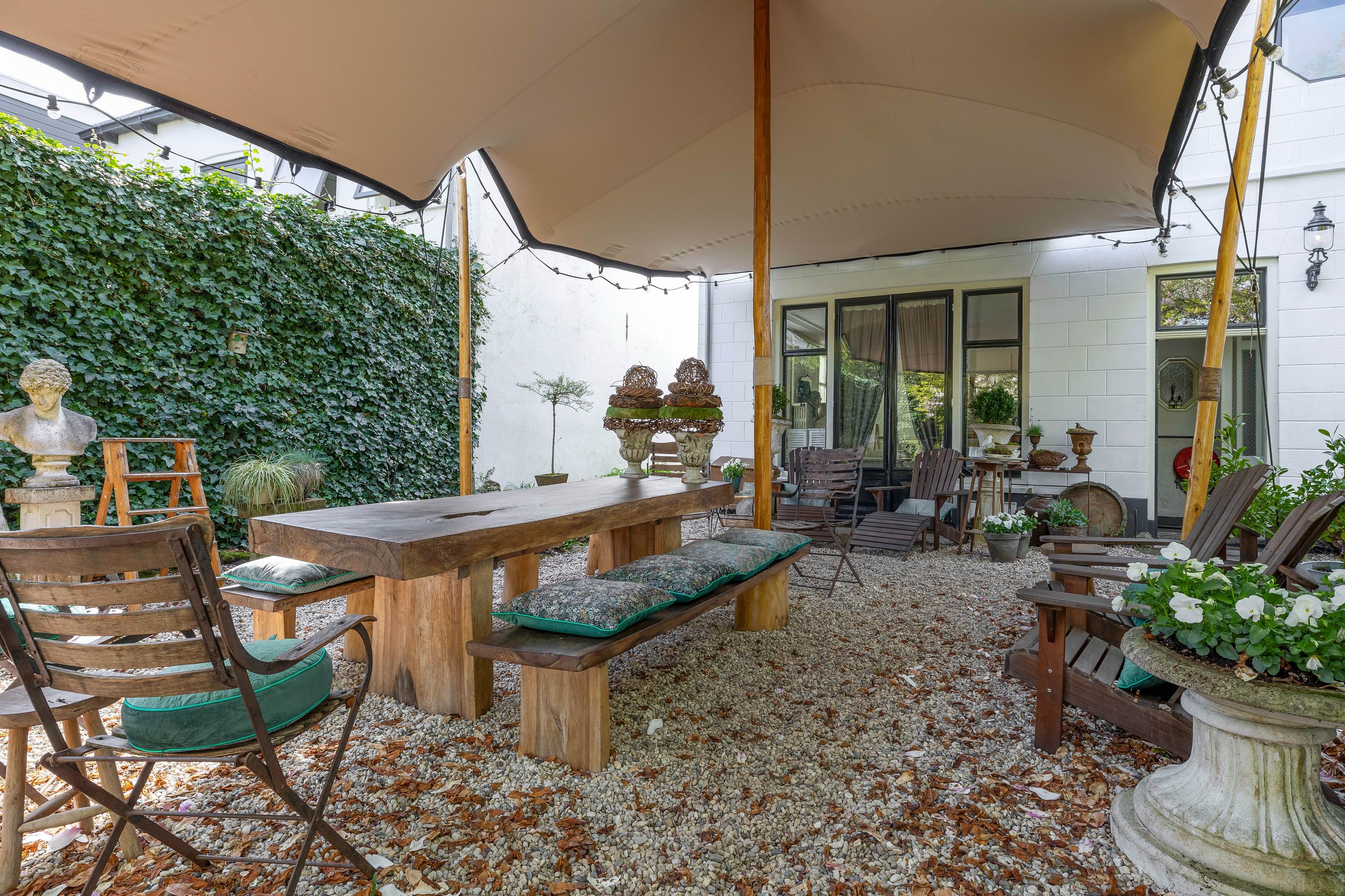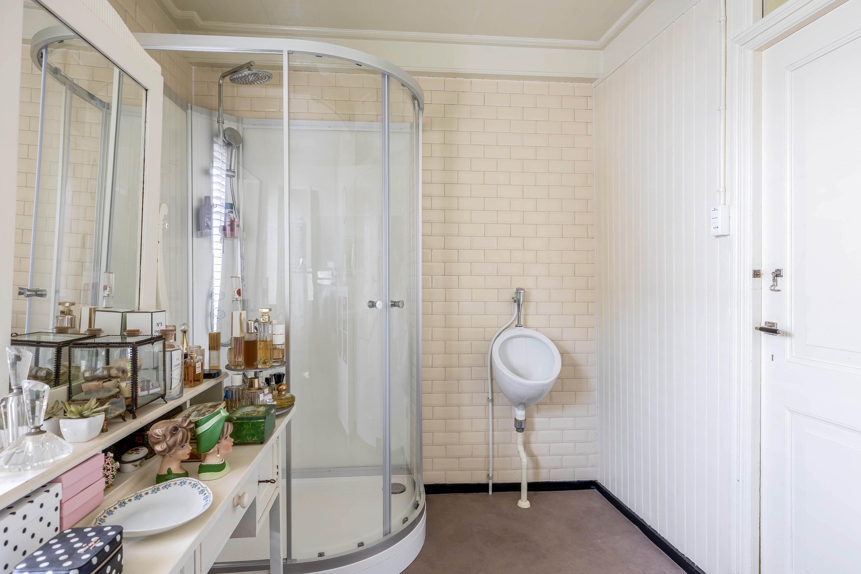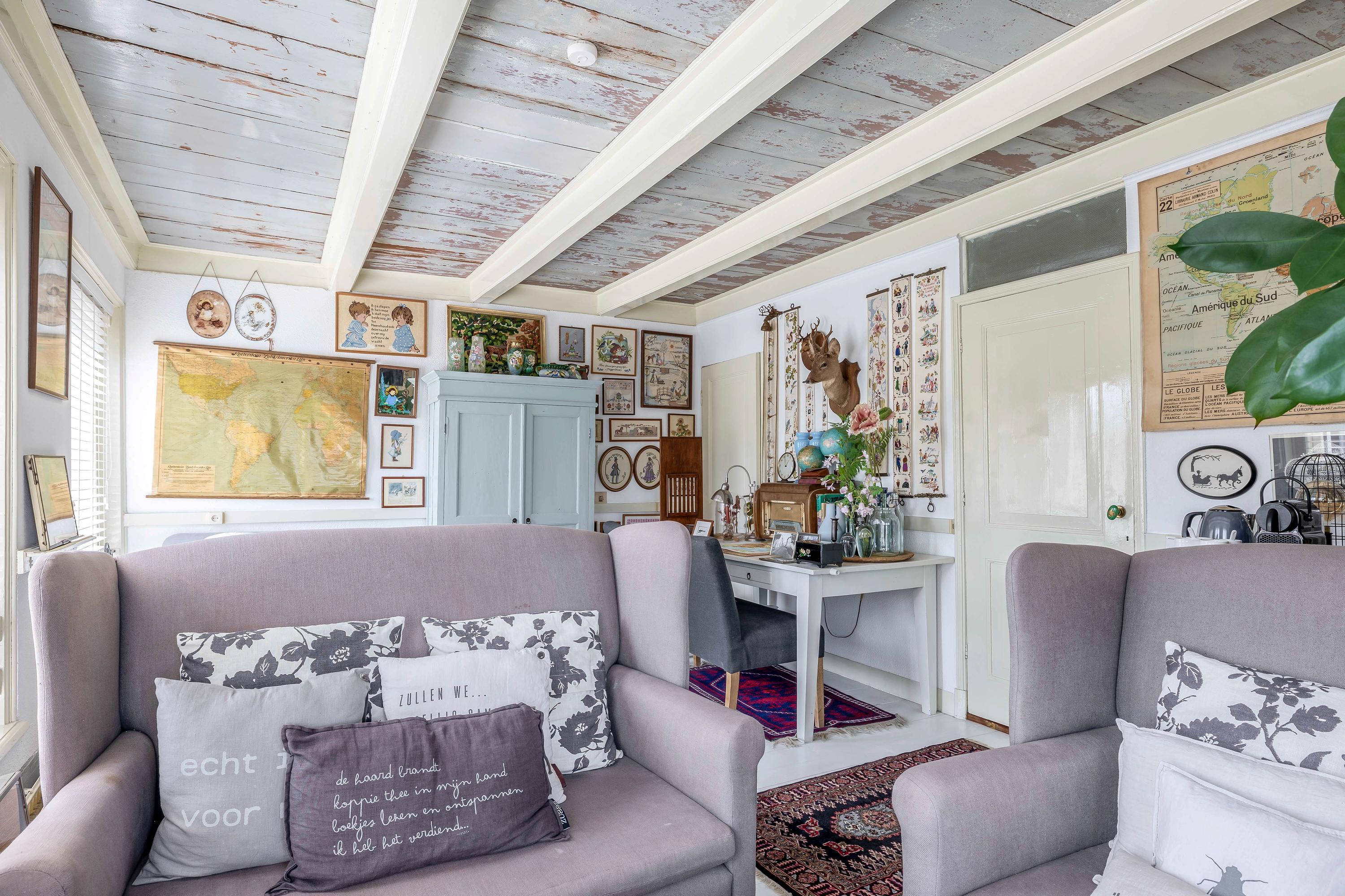 At dike level, you’ll find the charming living room with fireplace and ceiling mural, a dining room connected to the stunning conservatory via sliding doors, a bedroom, and a bathroom with an antique bathtub.