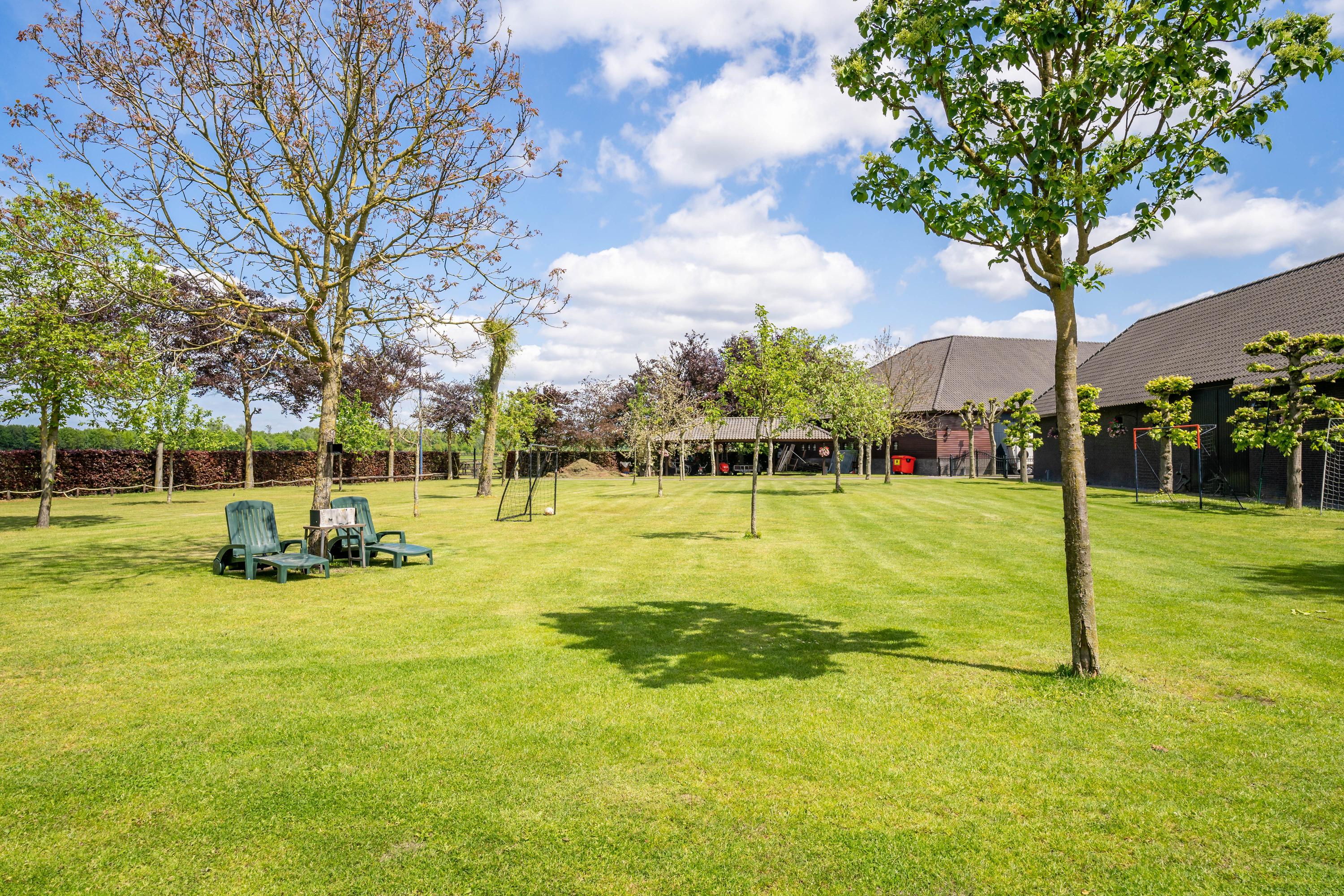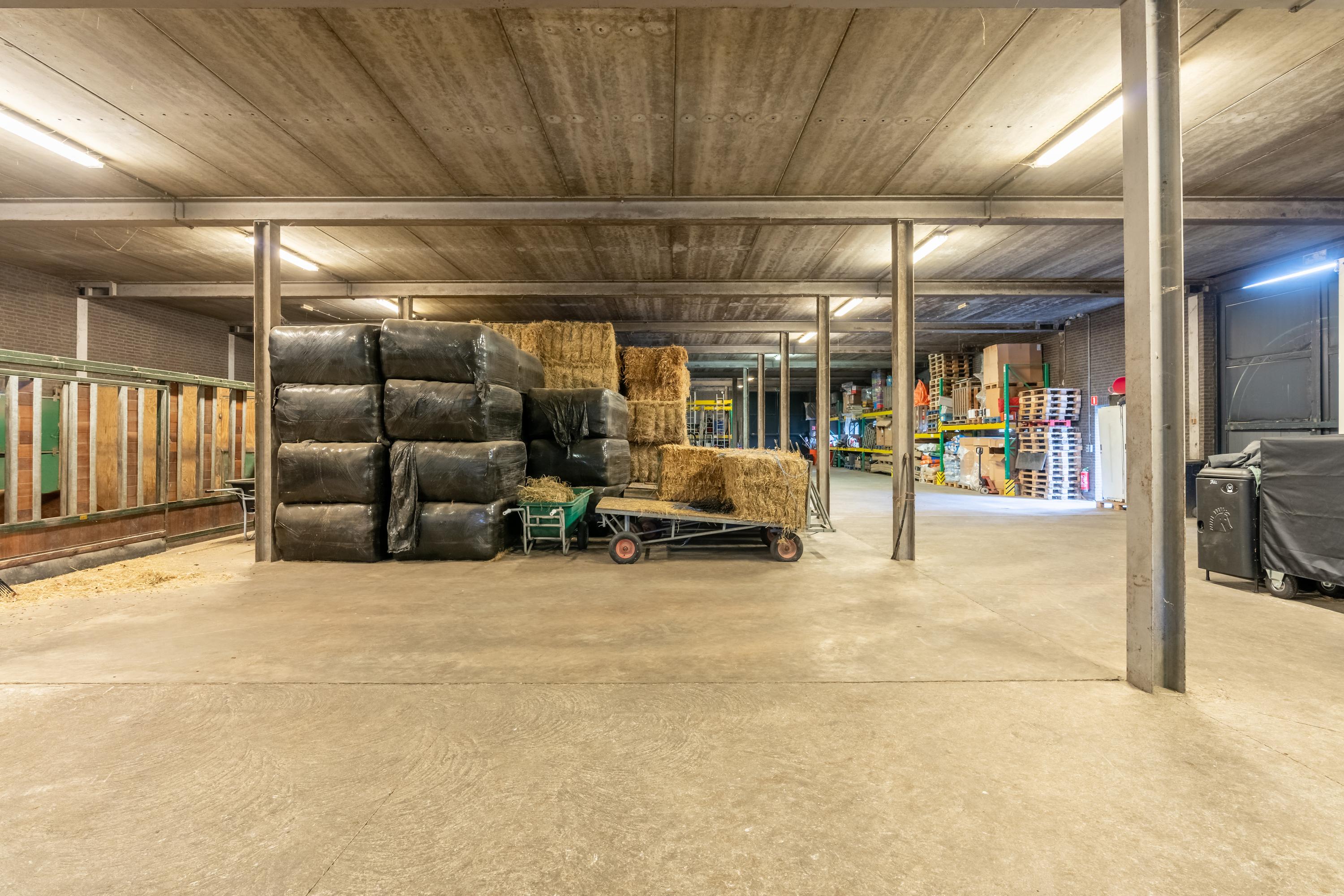 The very spacious shed is currently used as storage space and is partly furnished with five horse stalls and two walk-in stalls. Of course, the shed is suitable for multiple purposes. The brick facades of the fully insulated shed are largely clapboard on the outside. The roof is covered with tiles.