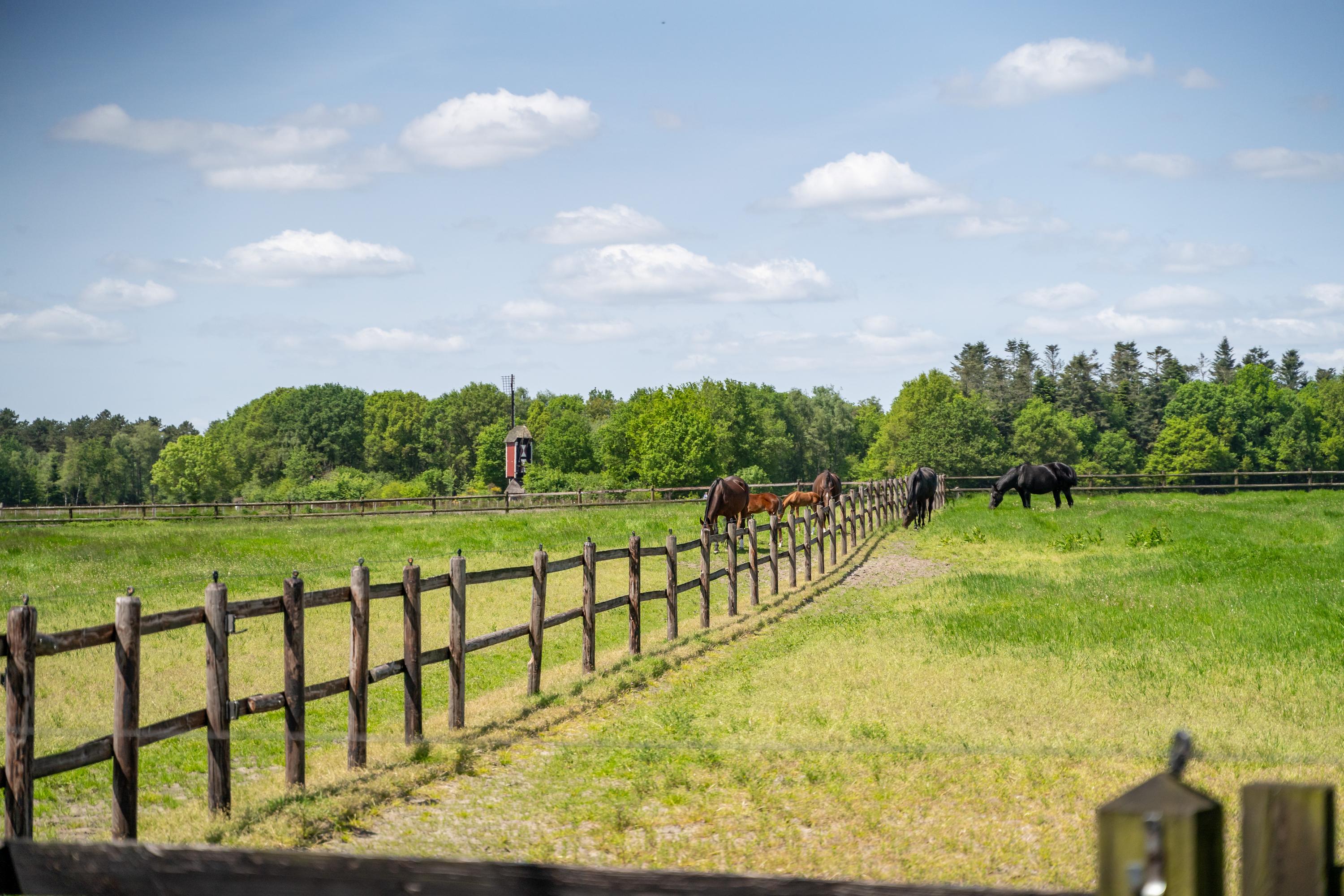 There are three paddocks, which have a sand floor and a wooden fence. The paddocks are also accessible via a rear entrance to the plot. The surrounding meadows are also fenced with wood.