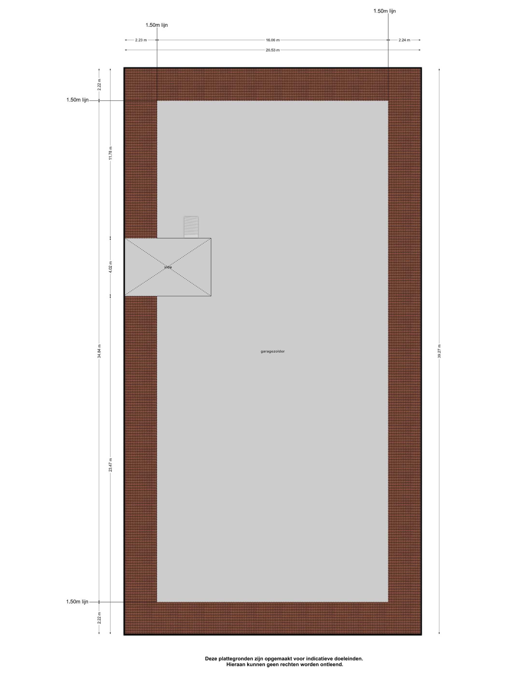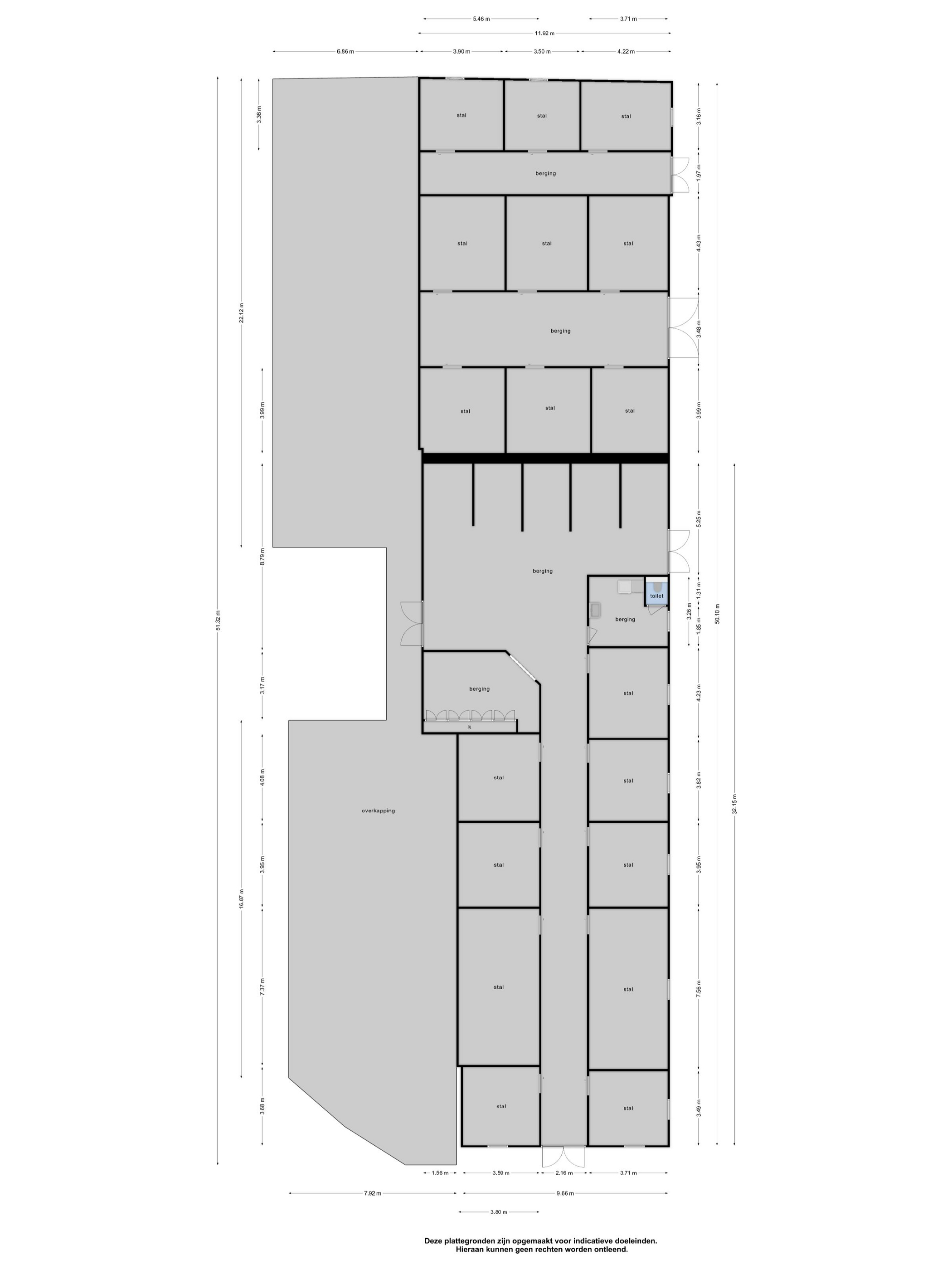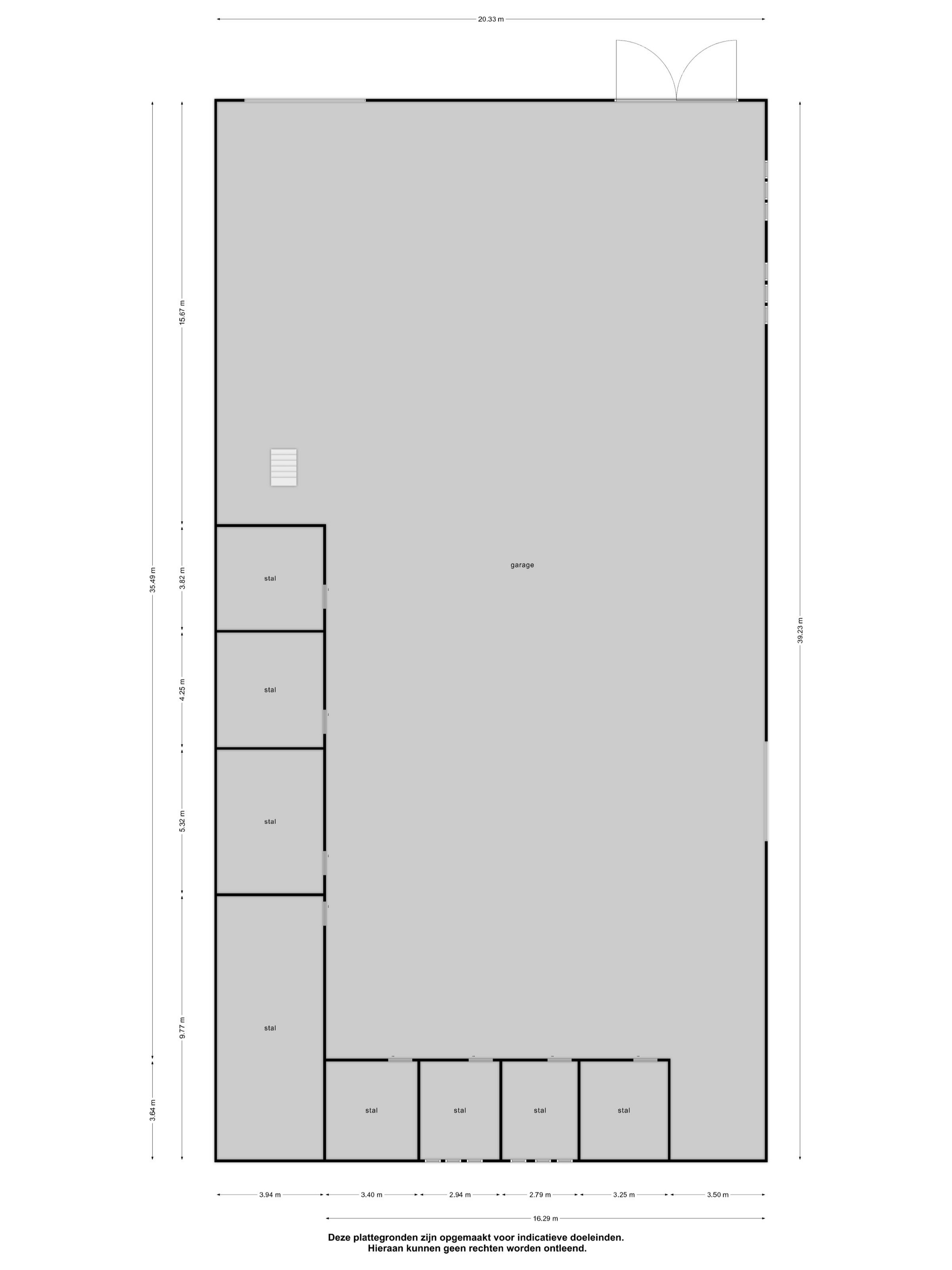 French doors in the front and side walls provide access to the yard. The mare/foal stall measures approximately 5x5 metres and the other 4 stalls measure approximately 3x3.5 metres. The stalls are fitted with partly plastic and partly galvanised front walls with sliding doors and plastic partition walls. A fixed staircase provides access to a spacious attic, which covers the entire surface area of the shed.