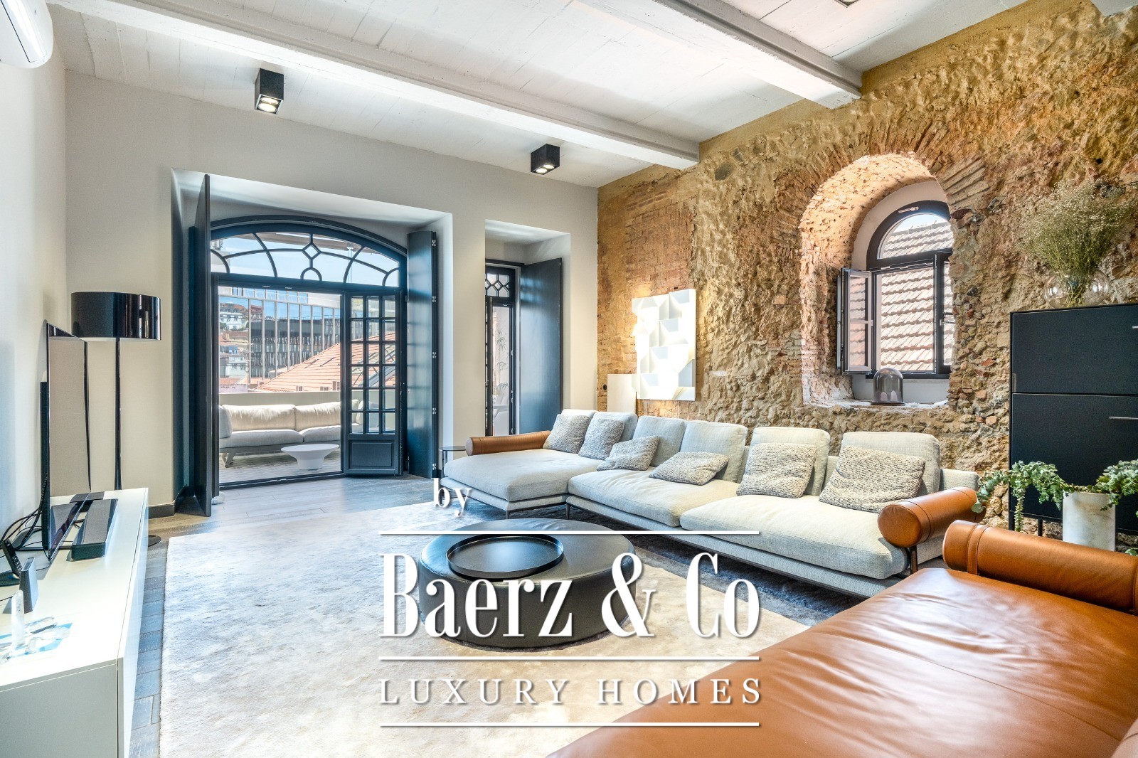The main living space is anchored by 3.7 m ceilings and a striking 14 m exposed stone wall. South and east exposures ensure light moves through large arched windows, drawing attention to the room’s height and scale. Oak cabinetry, stainless steel worktops, statement lighting, and seamless integration of the kitchen craft a functional yet welcoming central space. A private terrace, accessed from both the living room and a bedroom, invites quiet outdoor moments or meals under Lisbon’s soft light.