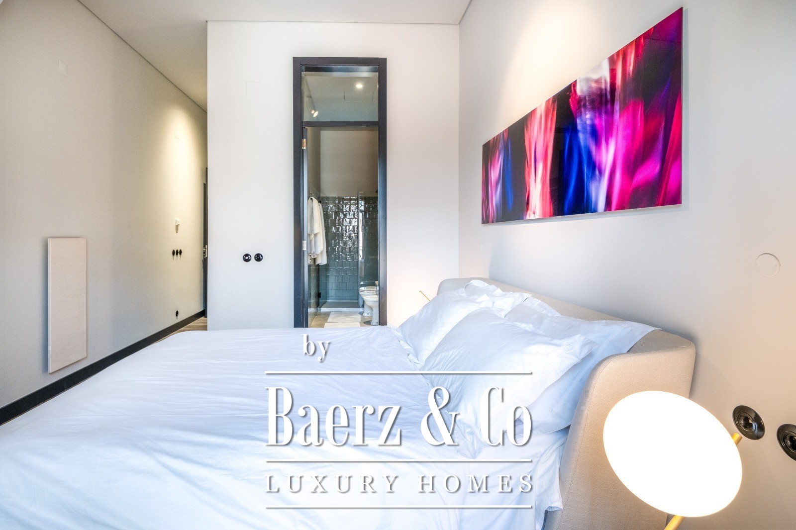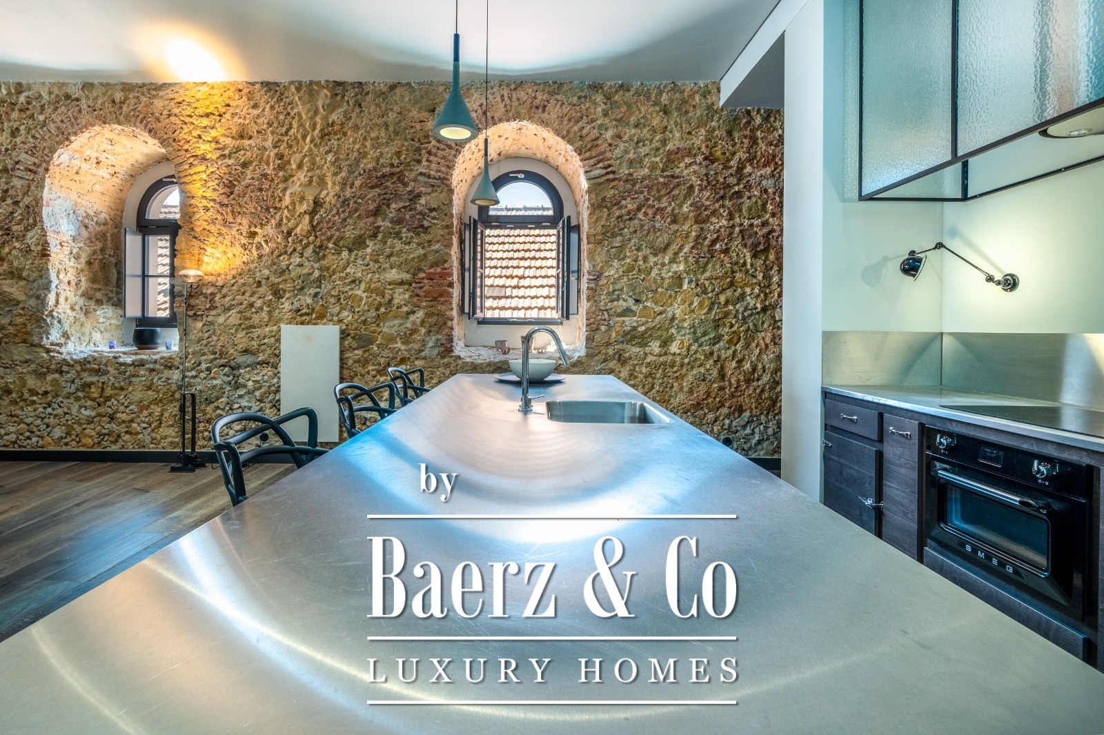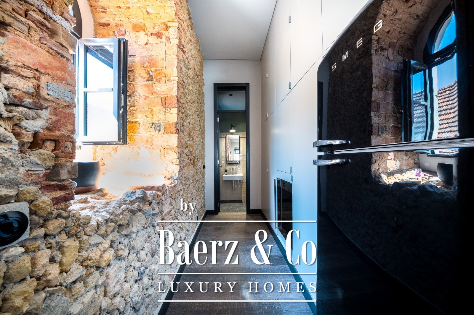 Two bedrooms and three bathrooms are enhanced by underfloor heating in the wet zones and built-in storage throughout. Materials and systems—SMEG appliances, Hager electrics, double-glazing with acoustic and thermal insulation, as well as a Scandinavian-inspired climate system—reflect a commitment to comfort and efficiency.
