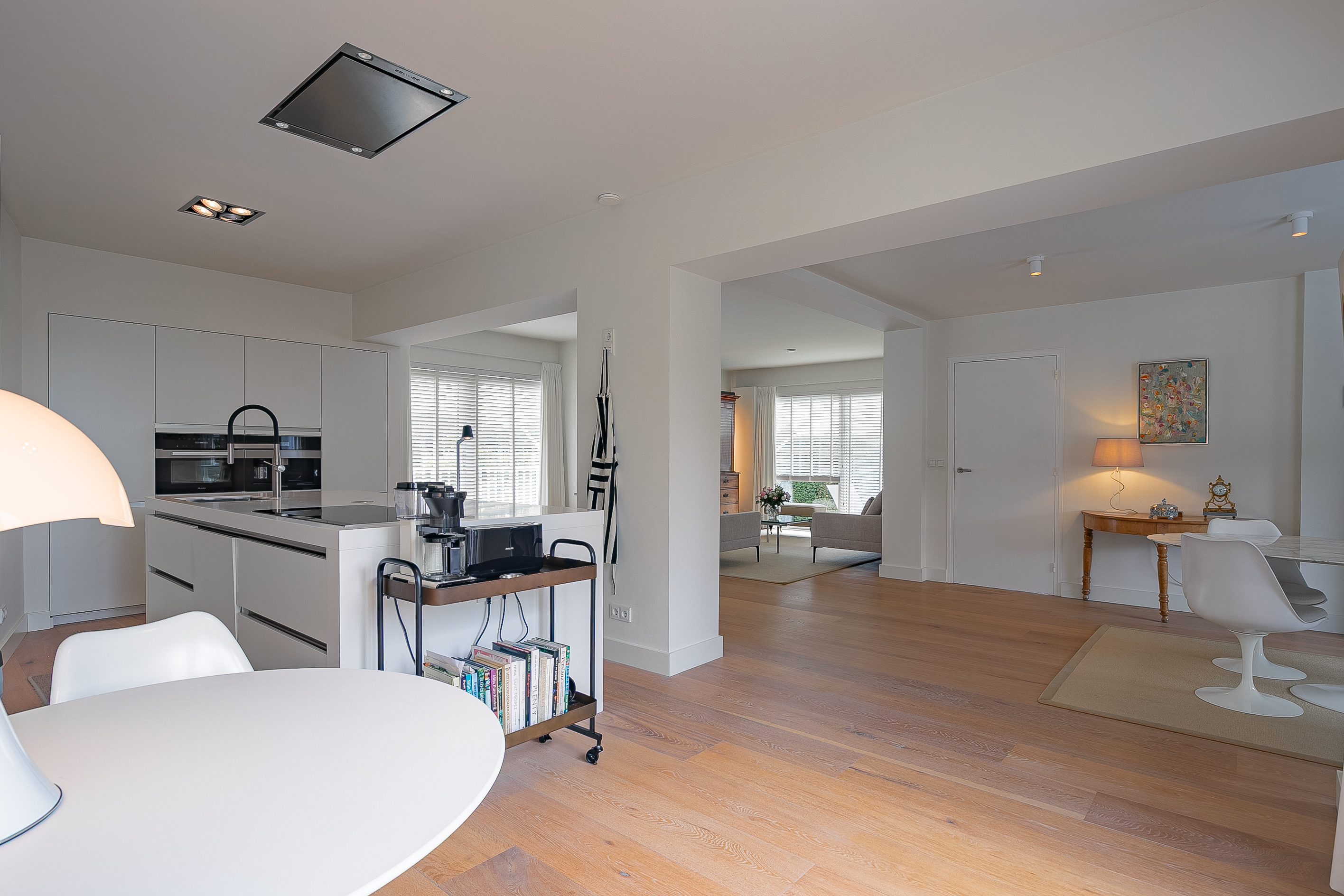 The open kitchen with large cooking island has a luxurious, handle-free design and is equipped with high-quality built-in appliances: a 5-zone induction hob, ceiling extractor, dishwasher, fully automatic coffee machine, convection oven, refrigerator and sink.