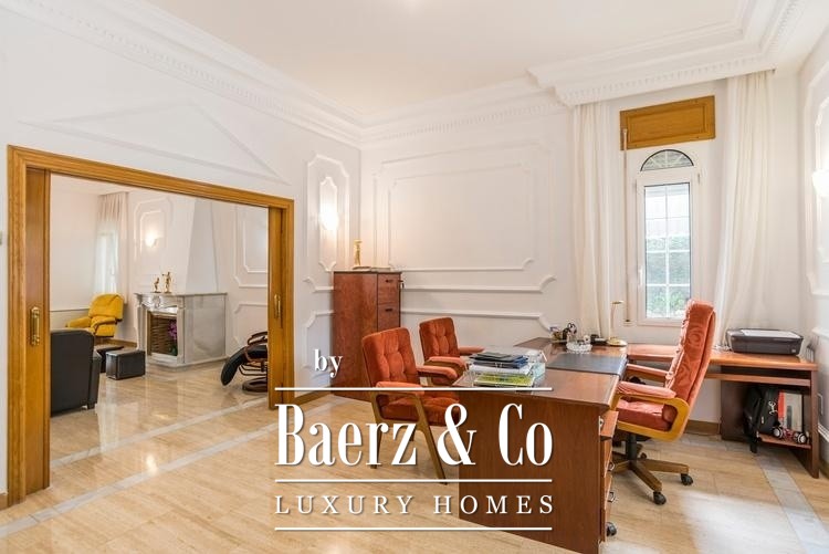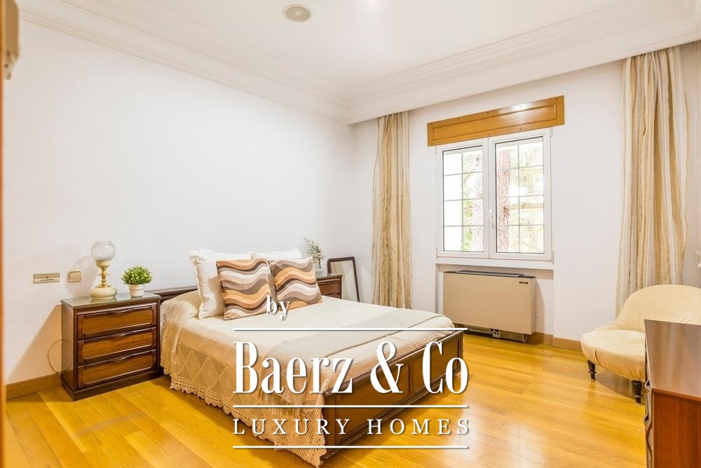 Outdoors, mature trees and layered gardens surround the large swimming pool and an expansive entertainment terrace appointed with a barbecue and wood-fired oven. Recreational enthusiasts will appreciate professional-grade tennis and fronton courts, while an independent guest apartment and extensive garage space provide further distinction. Security systems, climate control, and storage reinforce the villa’s readiness for both family living and high-value investment. This is a luxury villa for sale in Madrid where privacy, stature, and connectivity coalesce.