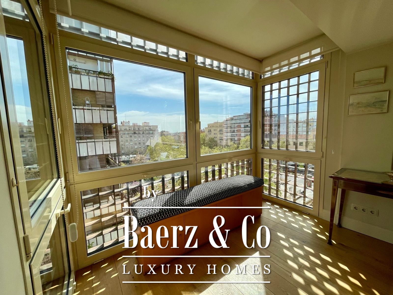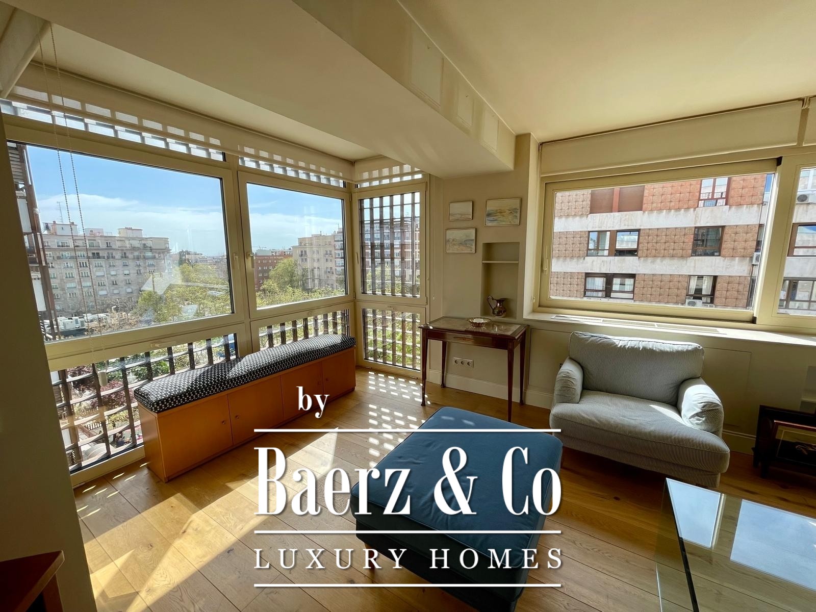 Apartment Madrid Salamanca district with panoramic city views forms an exemplary intersection of design and location. Situated on the sixth floor along Calle de Maldonado, this residence encompasses approximately 102 m², presenting two bedrooms and two bathrooms in a thoughtfully planned layout. The independent kitchen is fully equipped, while the expansive living and dining area is surrounded by sweeping 360° vistas over Madrid’s skyline, lending a sense of openness and rhythm that is both rare and refined.
