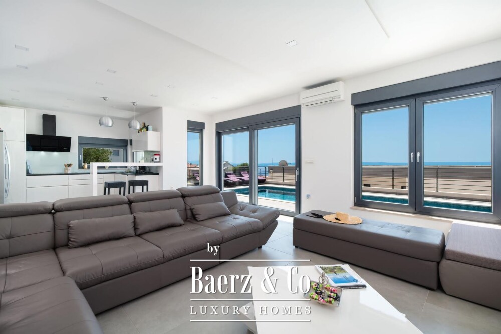 Villa Makarska occupies an elevated position, delivering panoramic views across the sea and the historic town below. This villa in Makarska stretches across 450 m² of living space, integrated into a 448 m² plot that articulates a clear connection between interior and exterior living. The south-facing orientation ensures constant natural light in every principal room, enriching daily life with views that shift from dawn to evening.