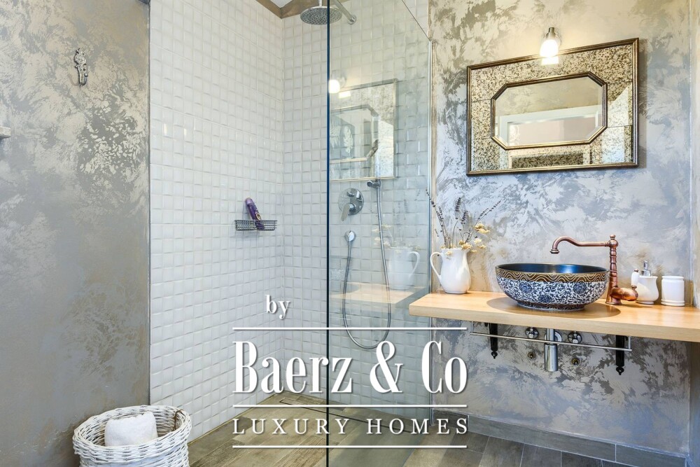 Ascending to the first floor reveals two more bedrooms, both with en-suite bathrooms and access to a balcony that offers views across the pool, olive trees, and the surrounding Mediterranean landscape. The outdoor rhythm of the property resonates with a covered terrace for open-air cooking and dining, overlooking a heated pool of 50 m², a tennis court, golf putting green, and multiple sports fields. Children’s play areas and a football field provide space for leisure for all ages.