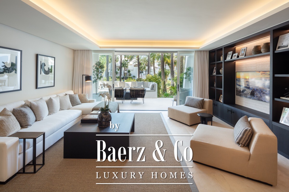 Apartment Marbella is presented at the heart of the five star Puente Romano resort, distinguished by a meticulous renovation that elevates everyday living. The living area spans 138 m², designed with an open plan arrangement that channels natural light throughout the south facing interior. A custom kitchen, crafted with oak cabinetry and Gaggenau appliances, merges seamlessly with the lounge, flowing onto a private terrace set against curated communal gardens.