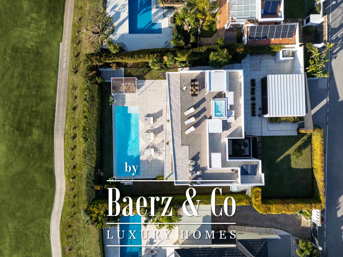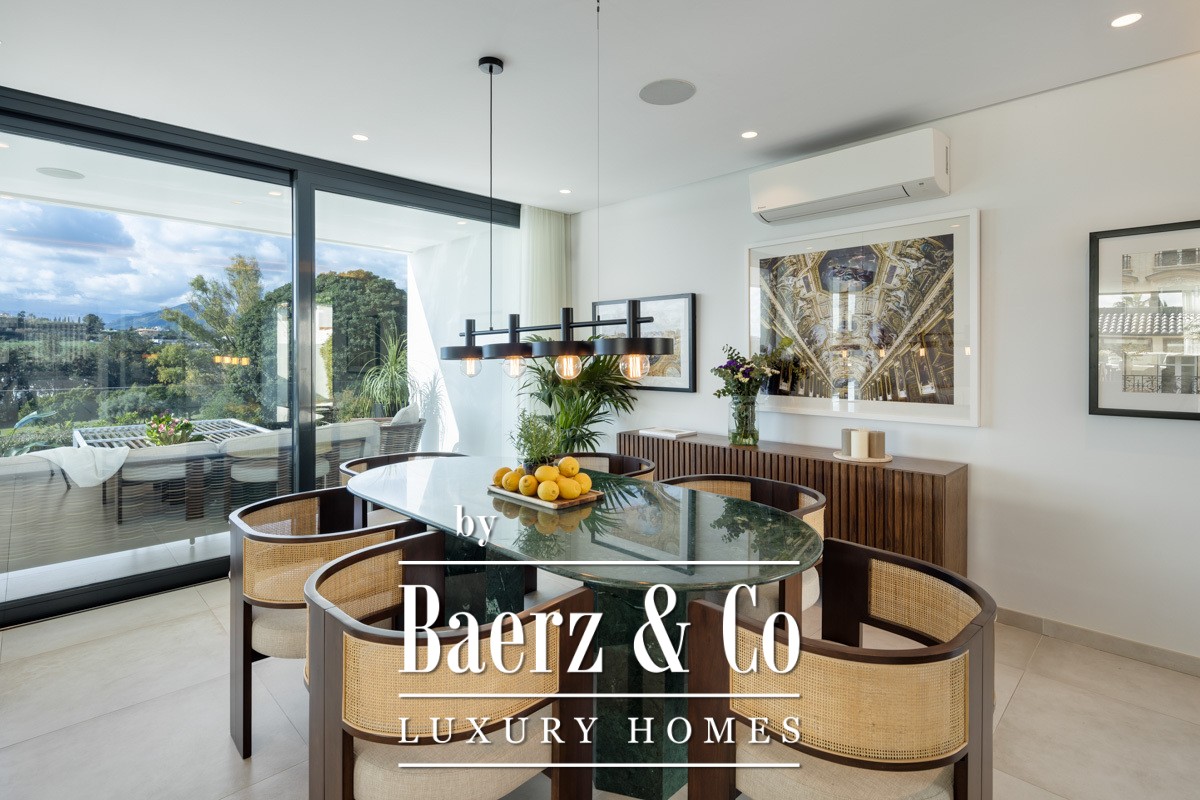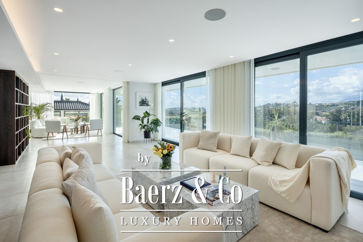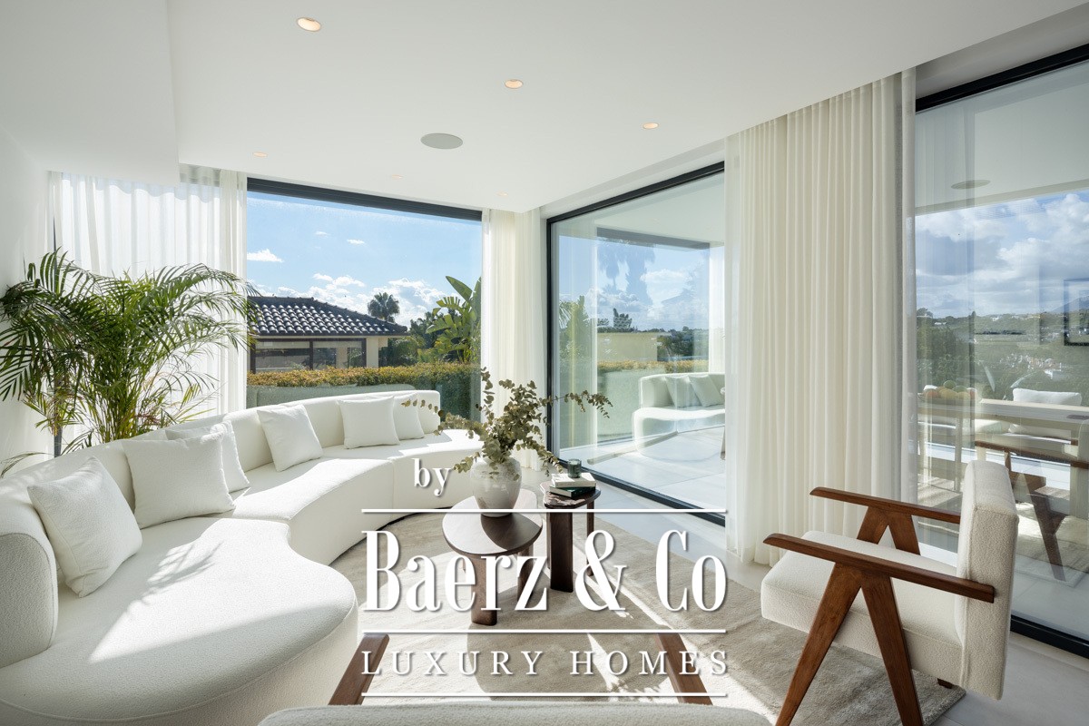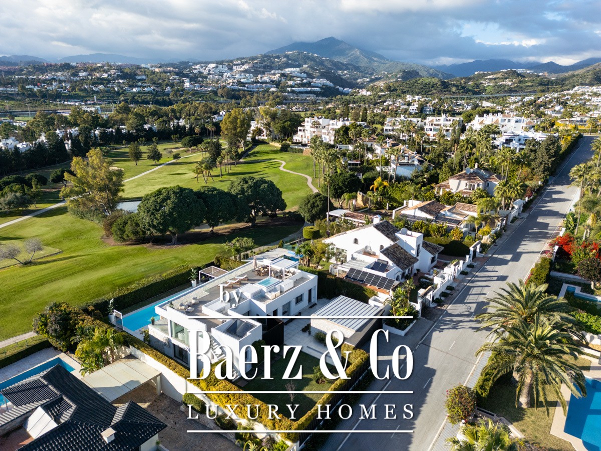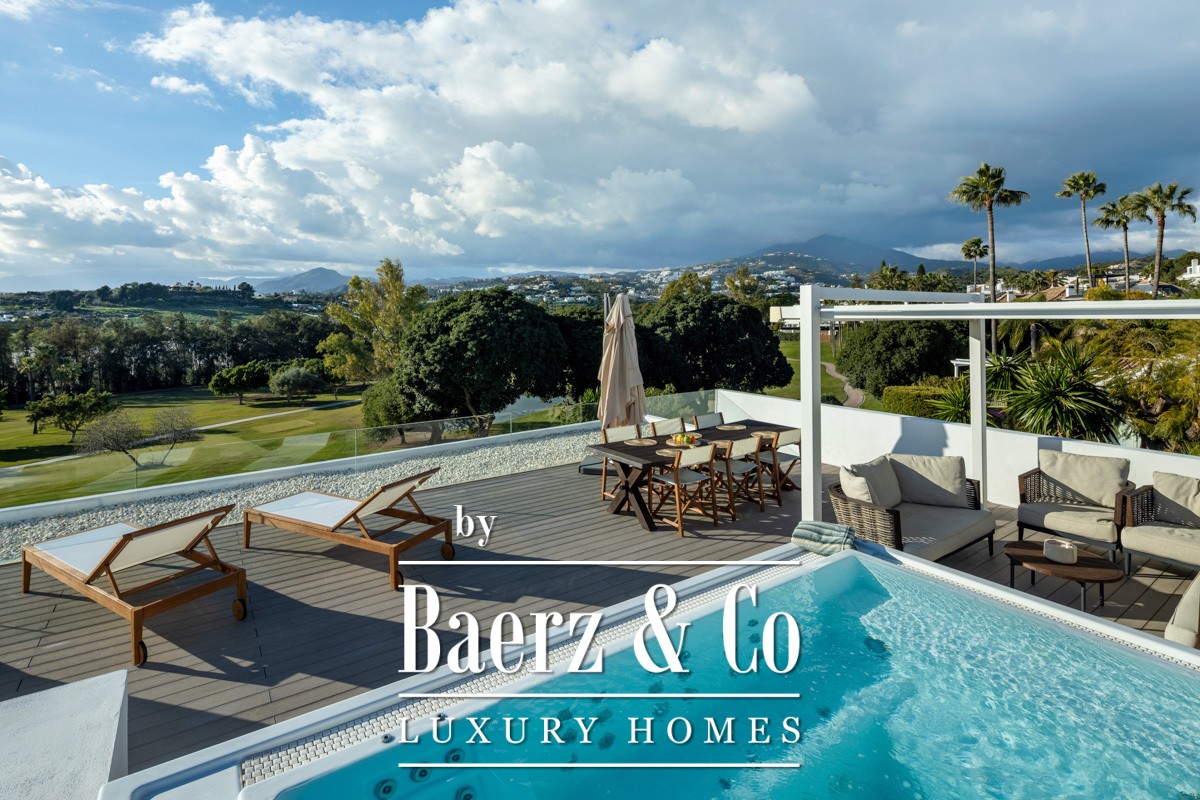 Villa Marbella Frontline Golf Nueva Andalucía embodies the rare confluence of modern design and privileged location. This contemporary six-bedroom, four-bathroom villa spans 342 m², set on a 1,090 m² plot. Sunlight fills expansive open-plan interiors, where each line and surface reflects refined sensibility. Private terraces flow outward, framing views across the golf course and surrounding mountains. The solarium, complete with jacuzzi, invites unhurried afternoons while the private pool and BBQ terrace encourage gatherings or quiet respite.