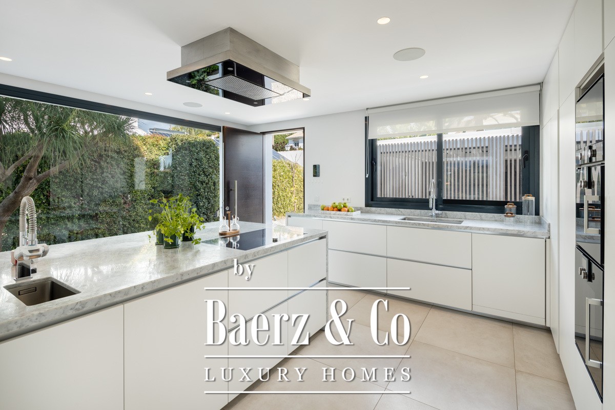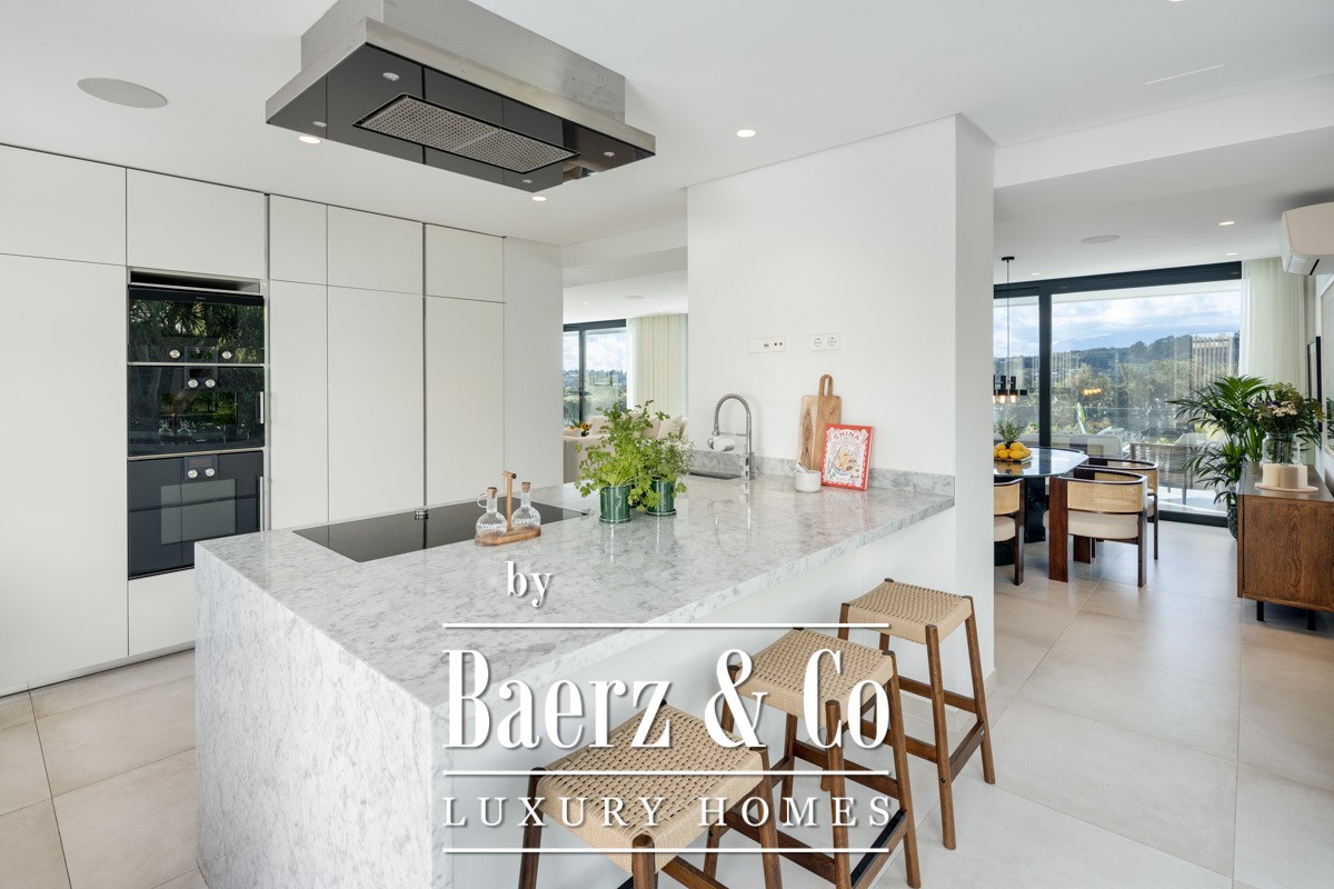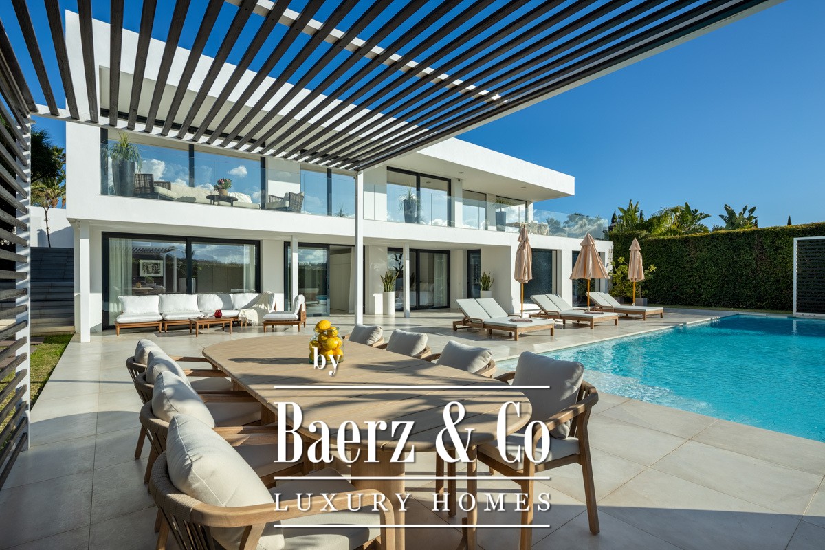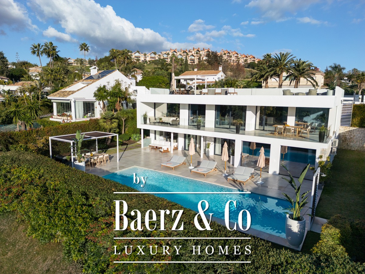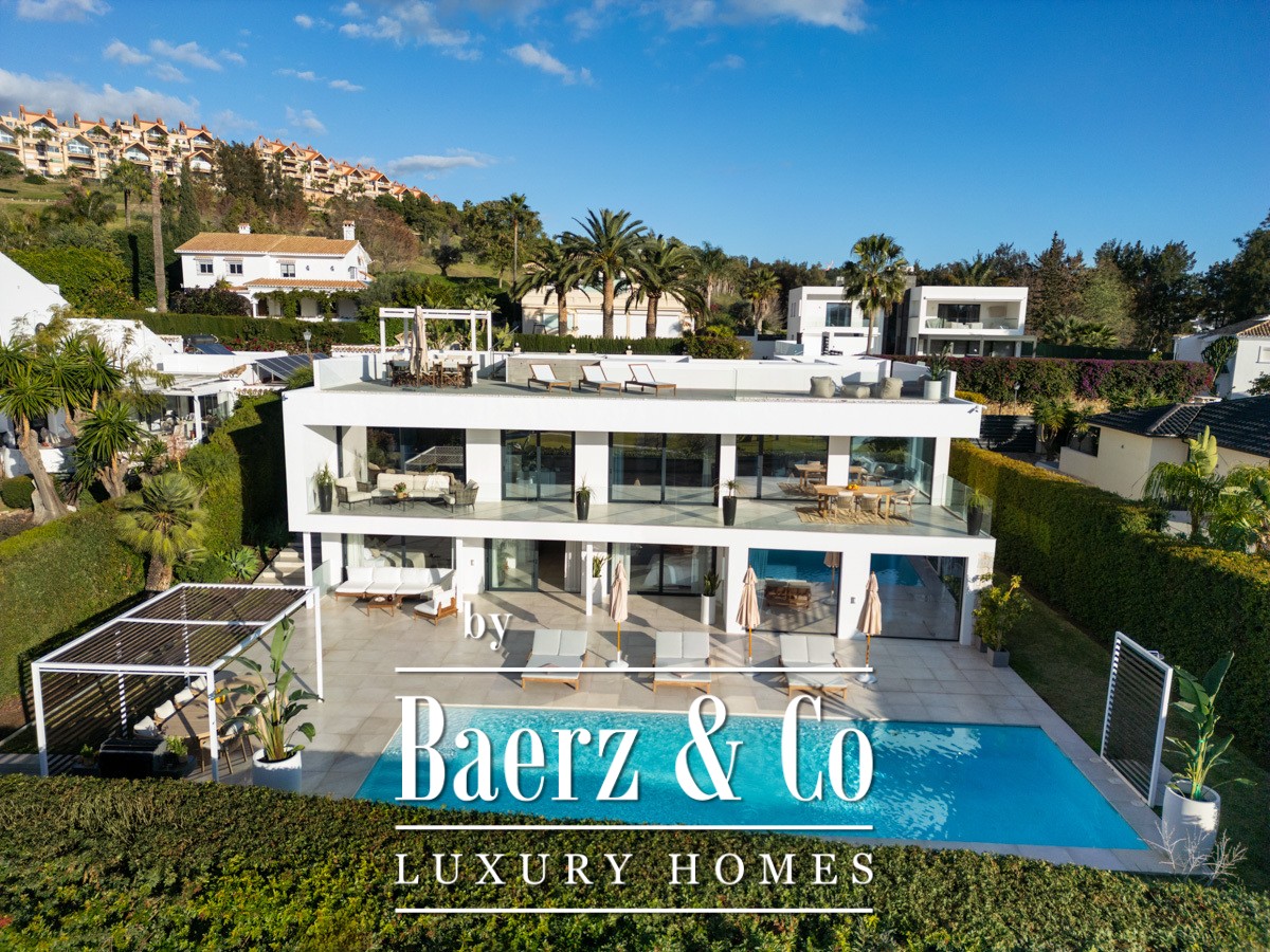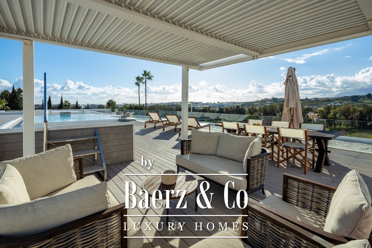 Villa Marbella Frontline Golf Nueva Andalucía embodies the rare confluence of modern design and privileged location. This contemporary six-bedroom, four-bathroom villa spans 342 m², set on a 1,090 m² plot. Sunlight fills expansive open-plan interiors, where each line and surface reflects refined sensibility. Private terraces flow outward, framing views across the golf course and surrounding mountains. The solarium, complete with jacuzzi, invites unhurried afternoons while the private pool and BBQ terrace encourage gatherings or quiet respite.