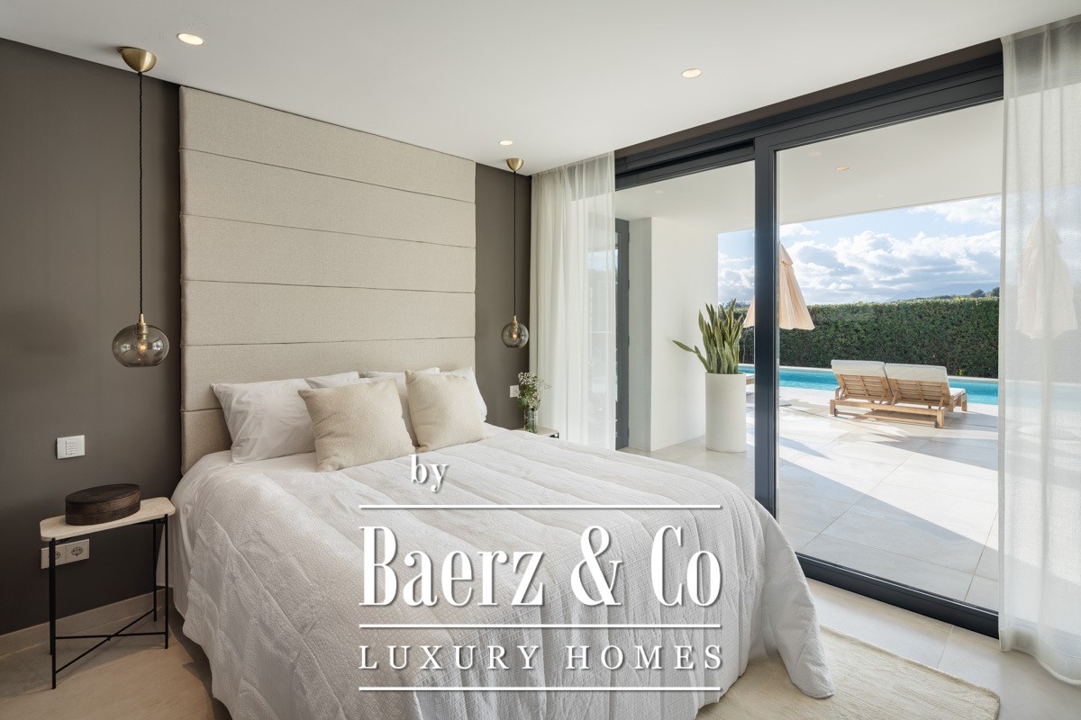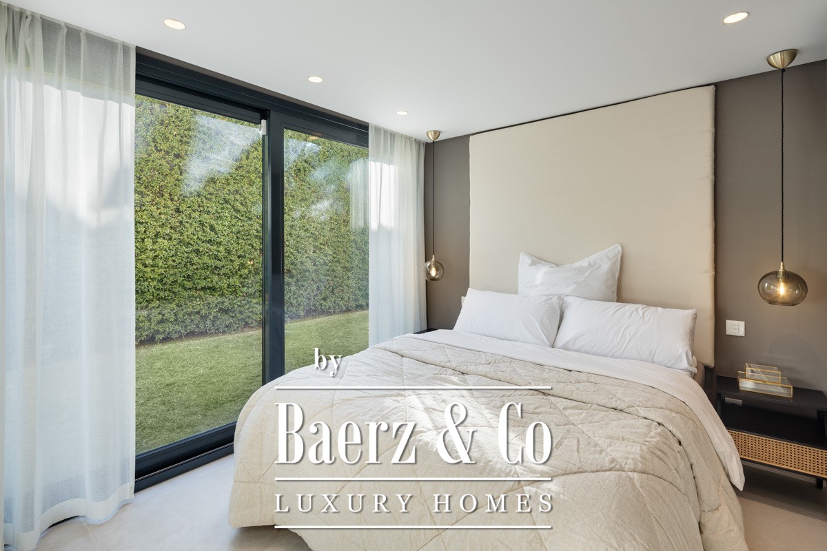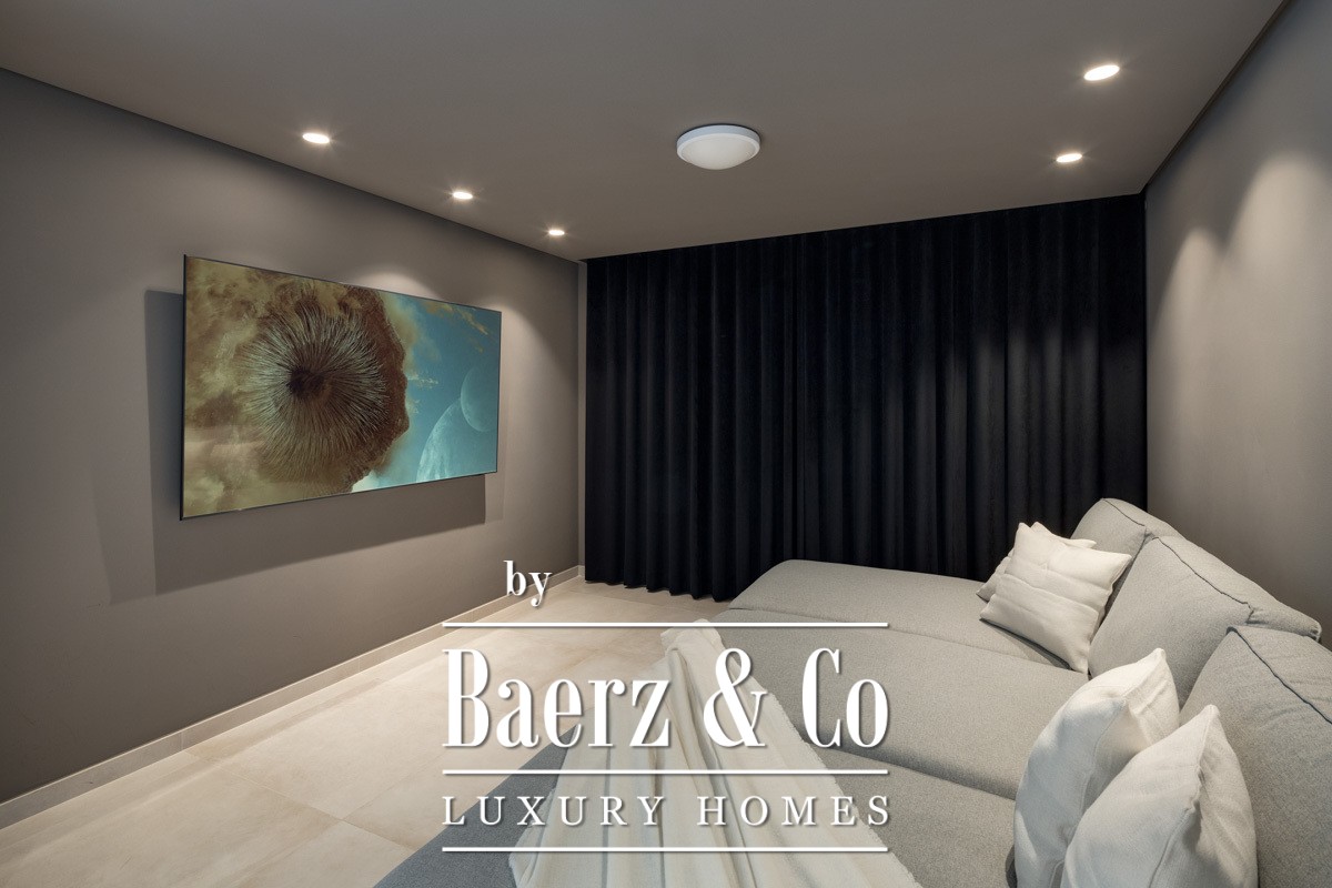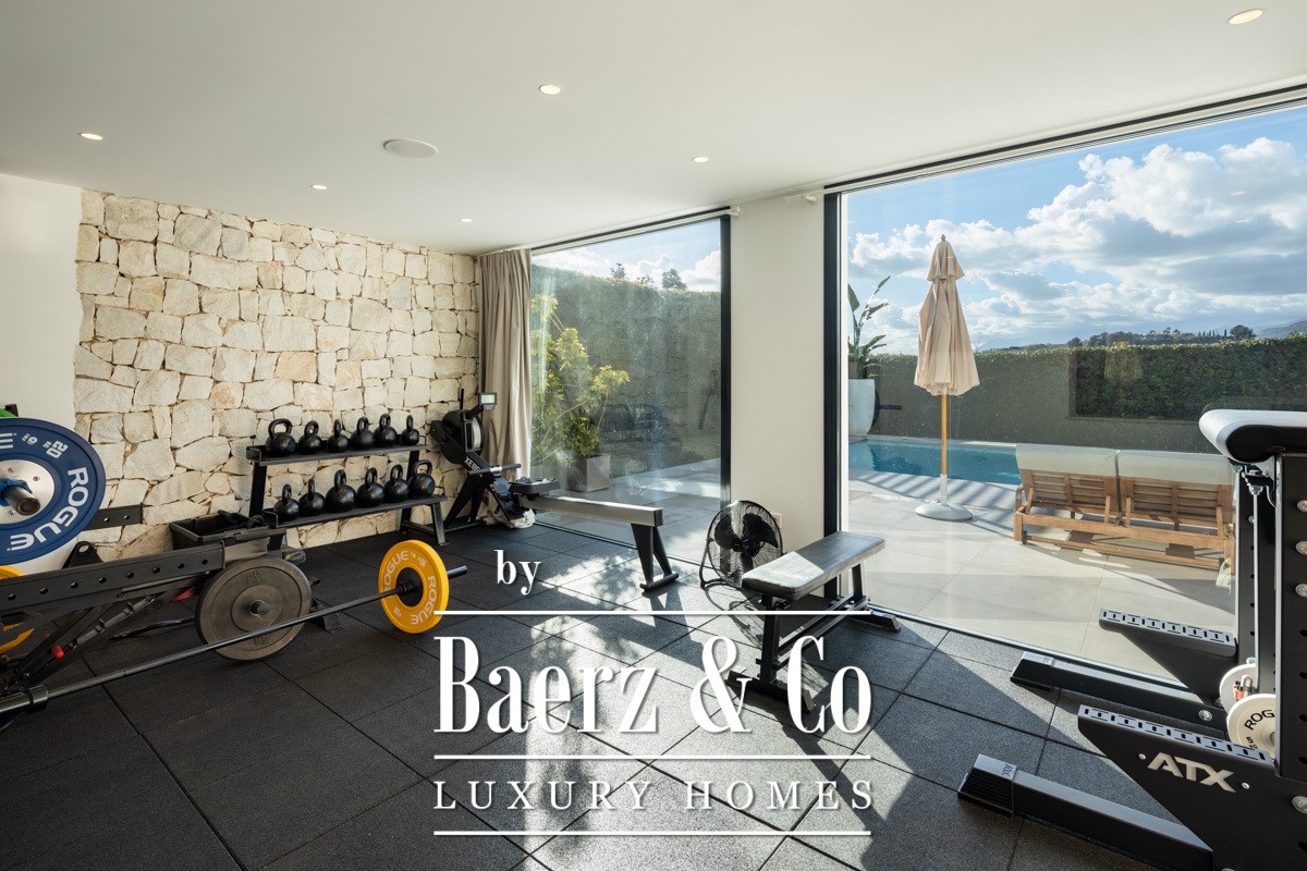 A state-of-the-art home gym and private cinema room advance the rhythm of daily life, balancing wellness with entertainment. The master suite opens onto a terrace, matched by a master bathroom of measured elegance. Gated access and security are discreetly integrated, supporting genuine privacy.