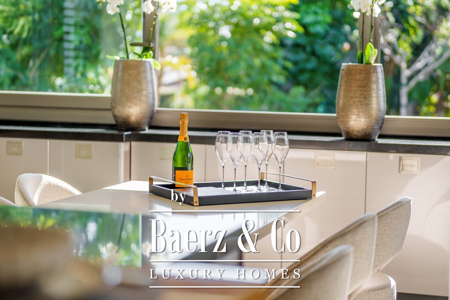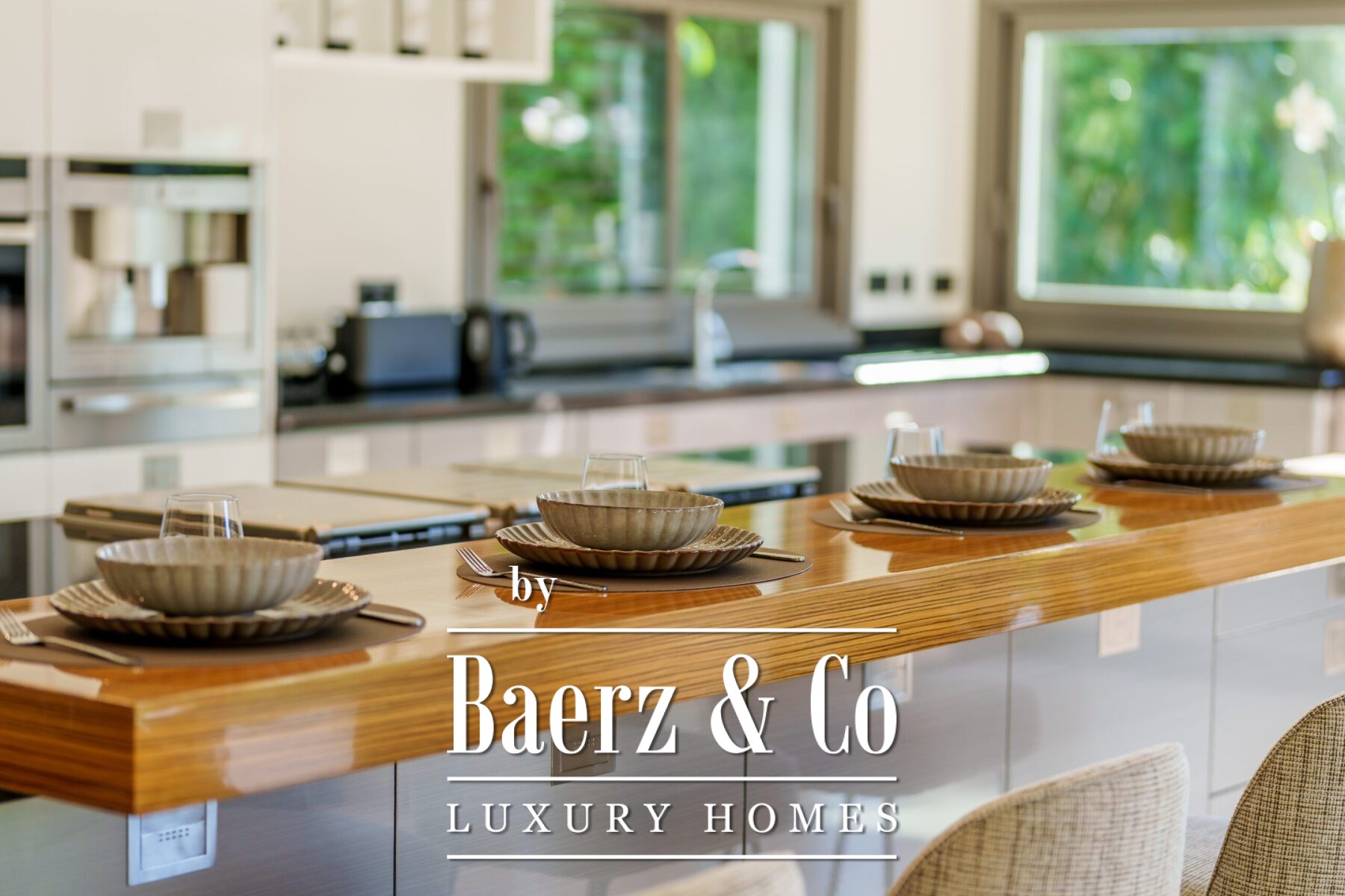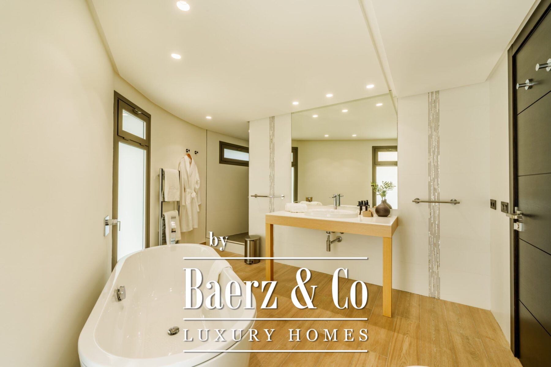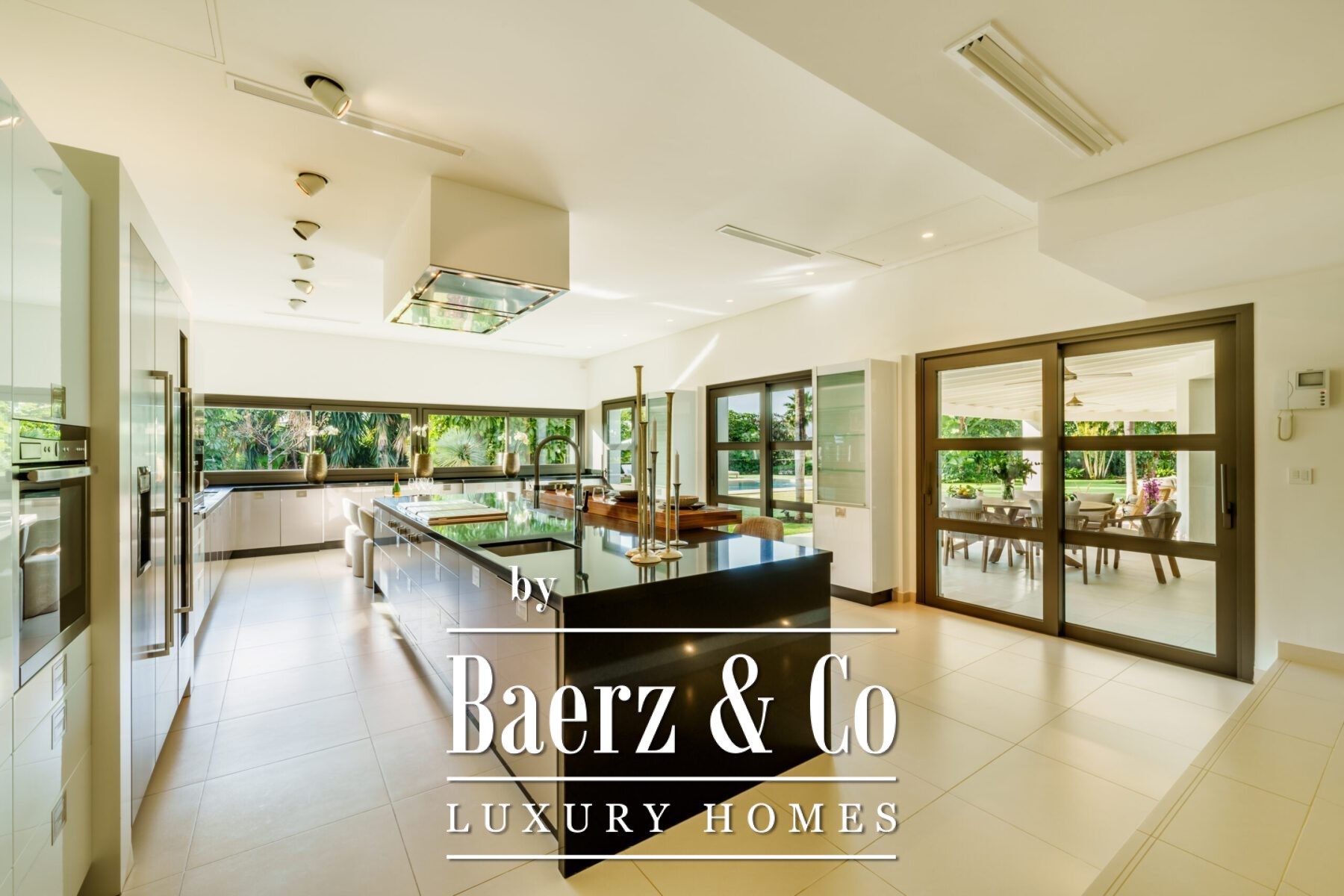 The villa offers 5 serene bedrooms and 5 bathrooms, including two spacious en-suite bedrooms with direct garden access. Additional highlights include 2 very large living rooms, a home library and home office. Additional features include a garage for up to 4 cars, a water tank, Lutron lighting, and Technal security windows, ensuring unparalleled comfort and safety in this magnificent home.