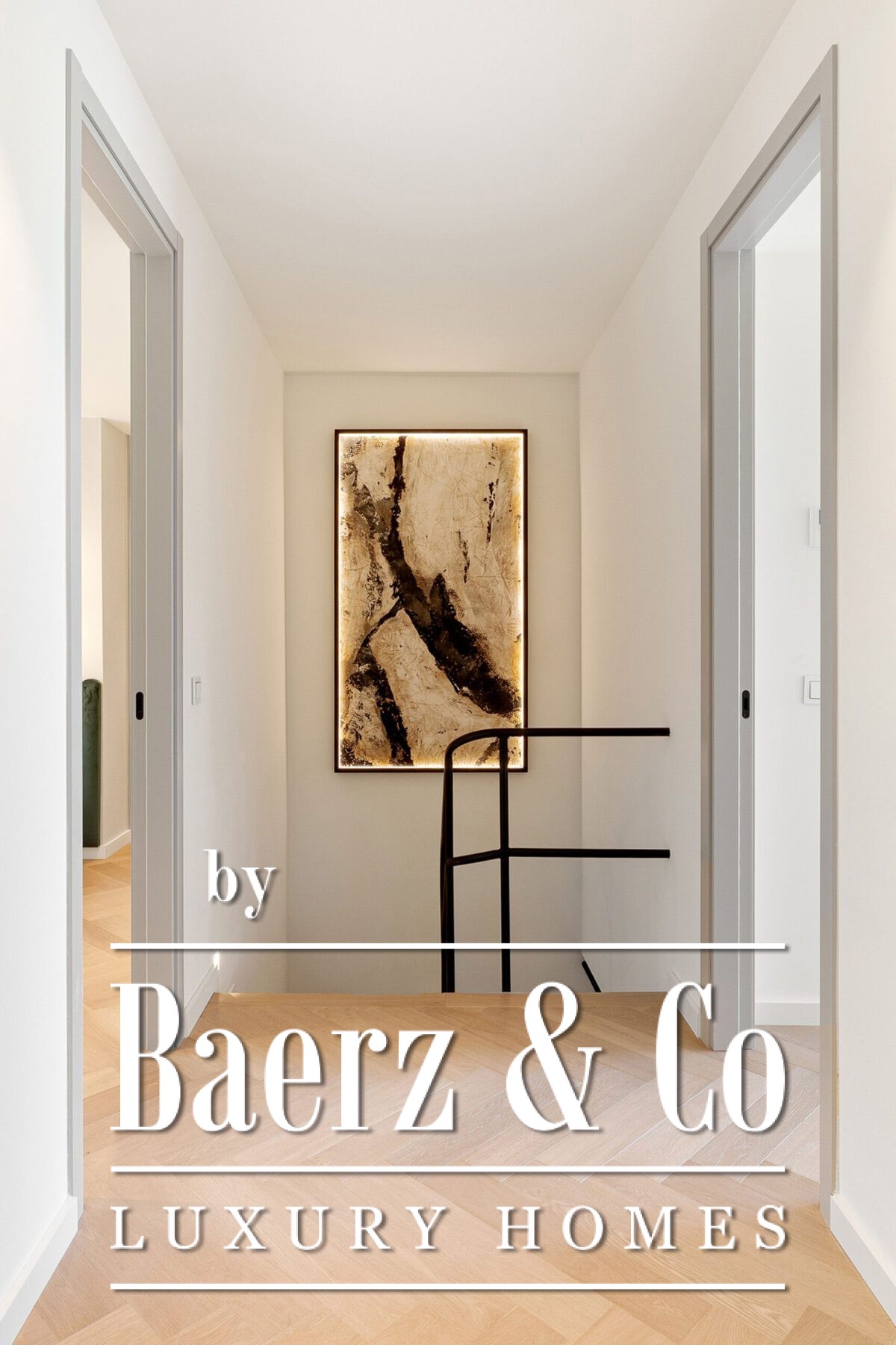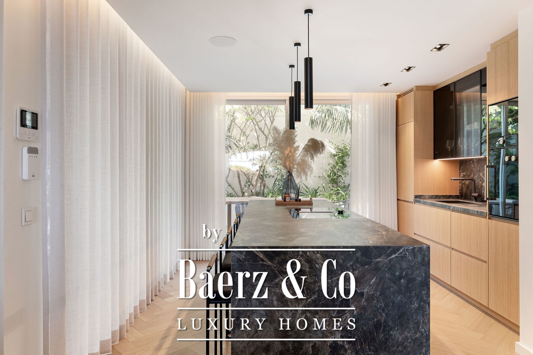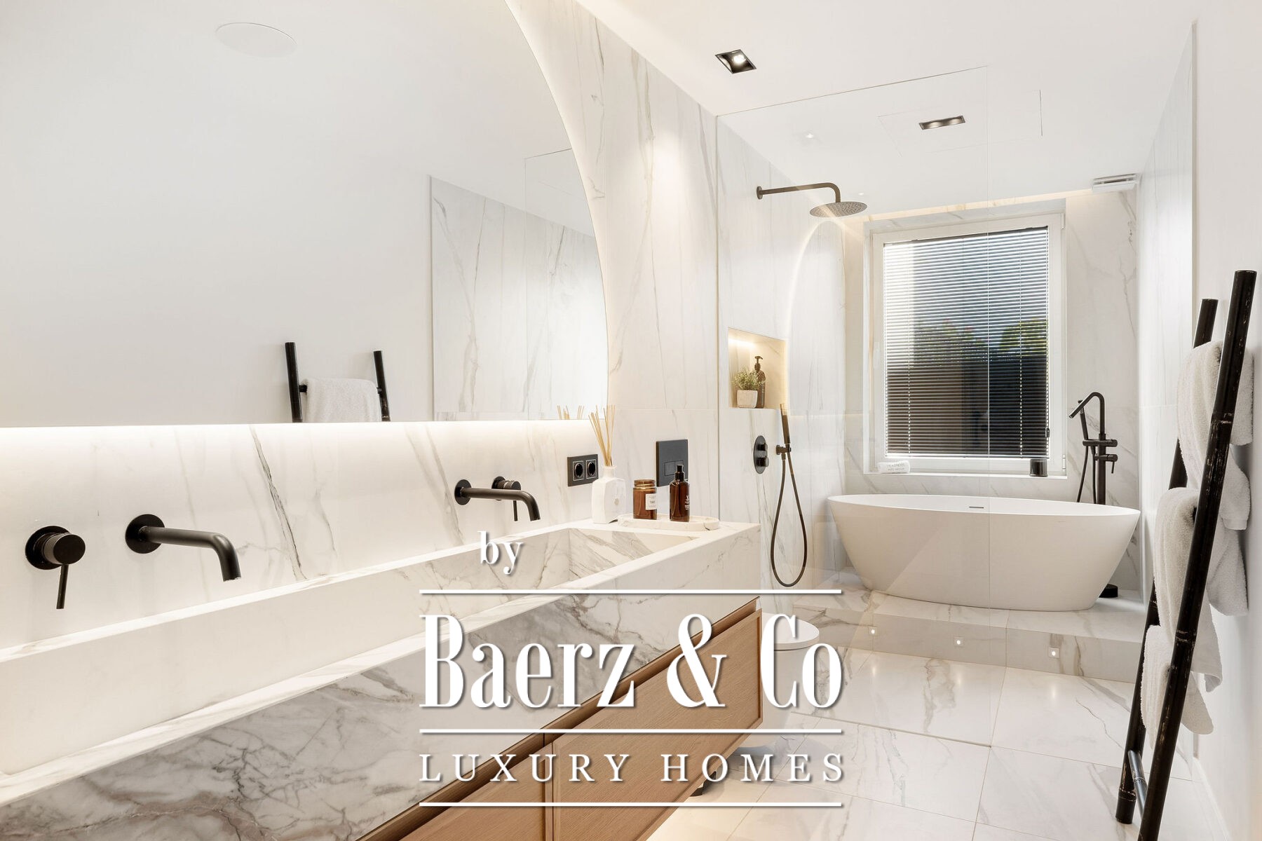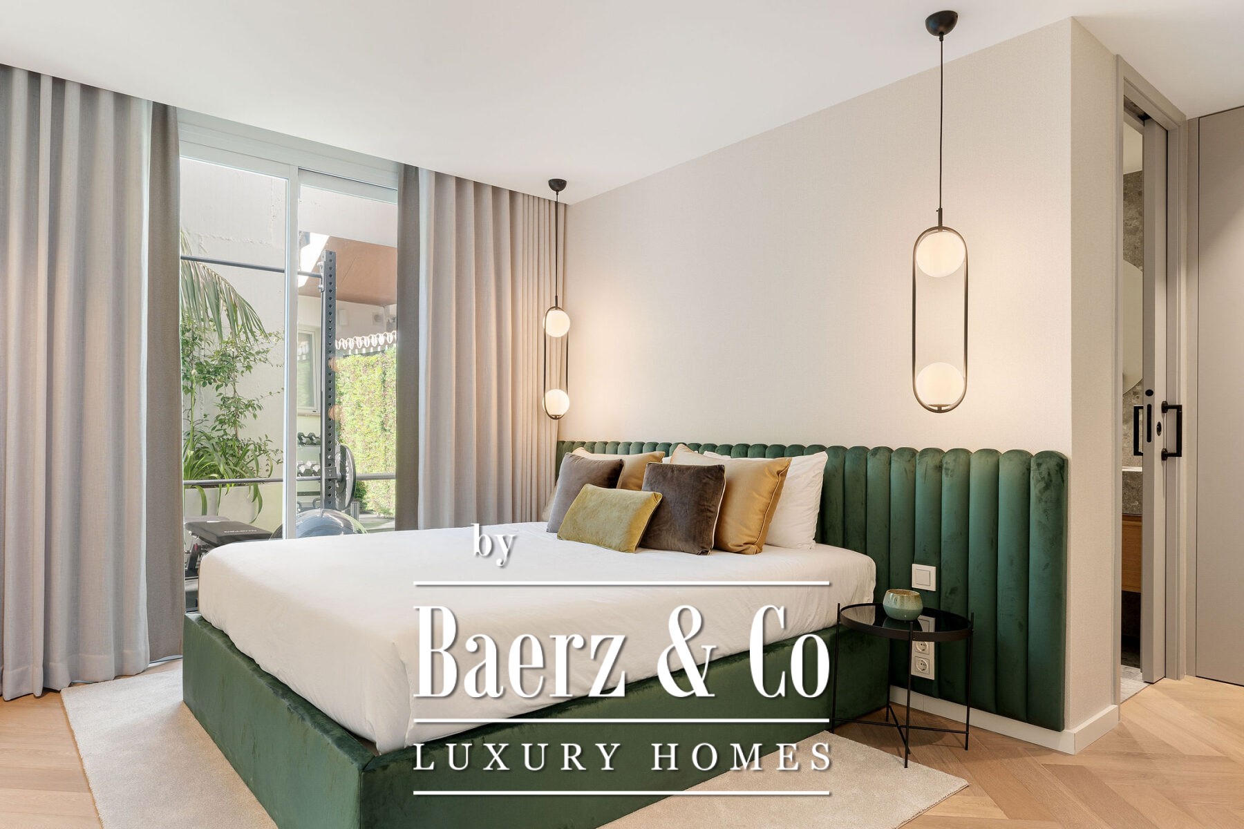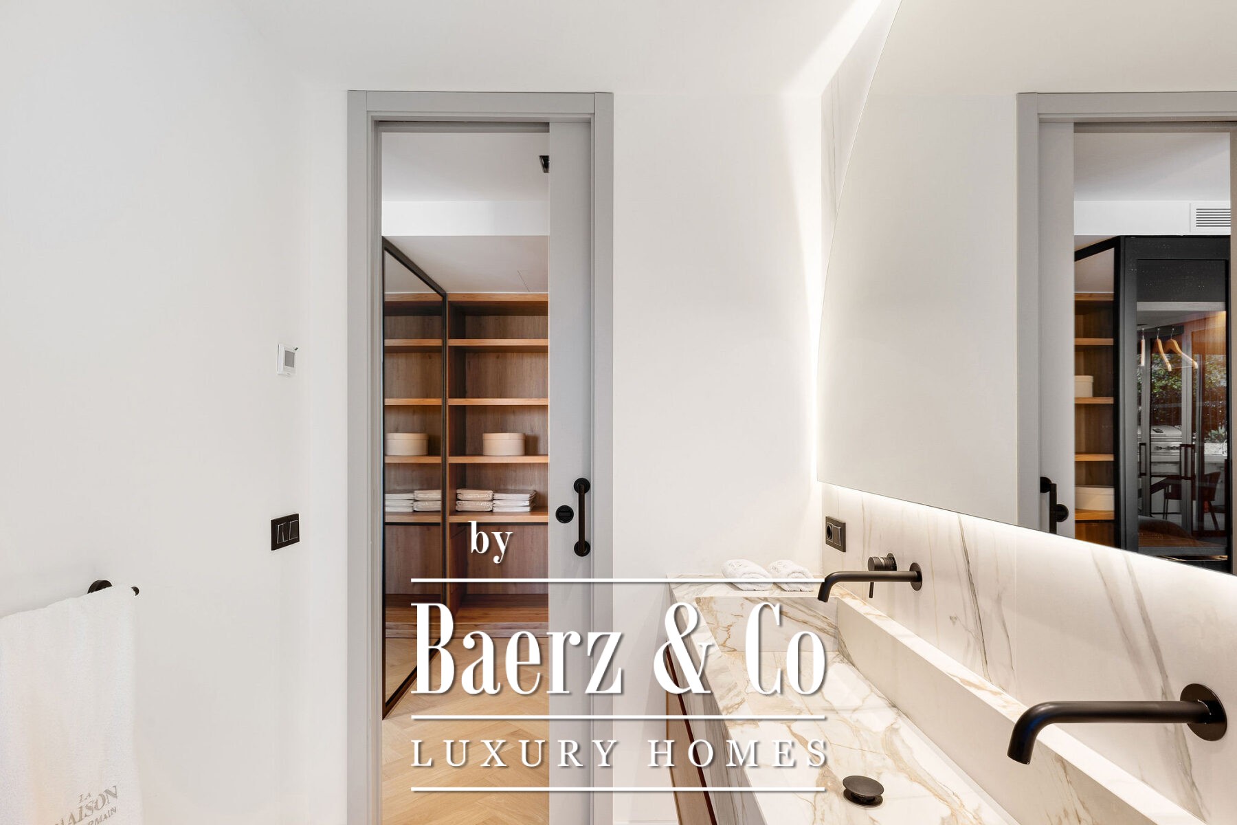 On the ground floor, natural light accentuates the open-plan living, dining, and state-of-the-art Gaggenau kitchen, each defined by premium wood and marble finishes. Herringbone floors and a neutral color palette impart warmth and understated sophistication. Extending from the living area, a private patio invites alfresco dining and moments of quiet retreat. The opulent principal suite features an expansive closet, a freestanding bathtub overlooking the terrace, and an en-suite bathroom. An additional bedroom on this floor ensures flexible accommodation for family or guests.