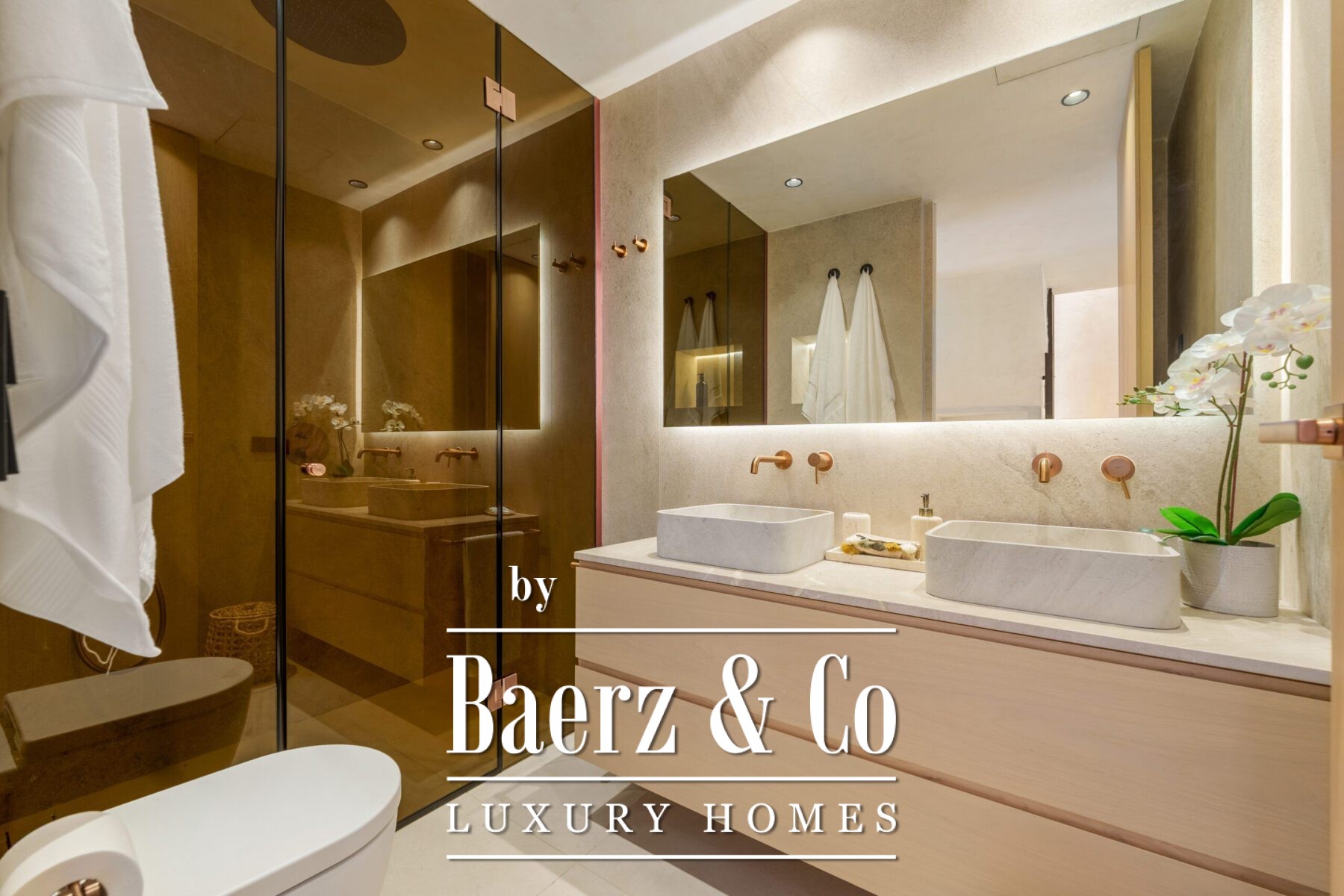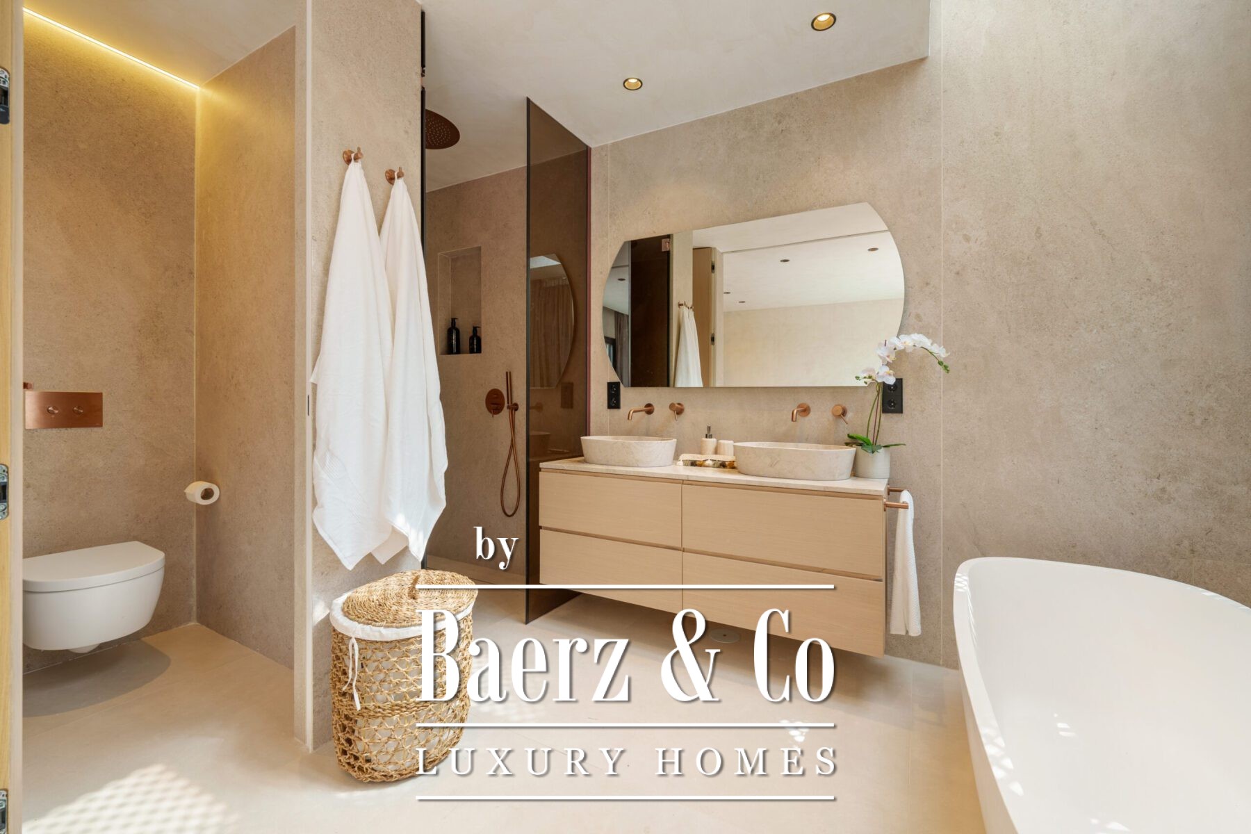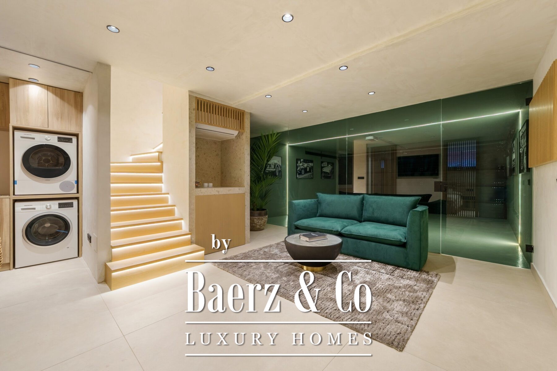The upper floors host spacious bedrooms, including a master suite with a walk-in wardrobe and an en-suite bath designed with precision. Multiple terraces across levels offer choices for quiet mornings or lively evenings, culminating in a rooftop solarium appointed with built-in BBQ, jacuzzi, and panoramic views across mountain and garden landscapes. A private garage, 24h security, and advanced amenities such as air conditioning and underfloor heating reflect a commitment to comfort and ease.