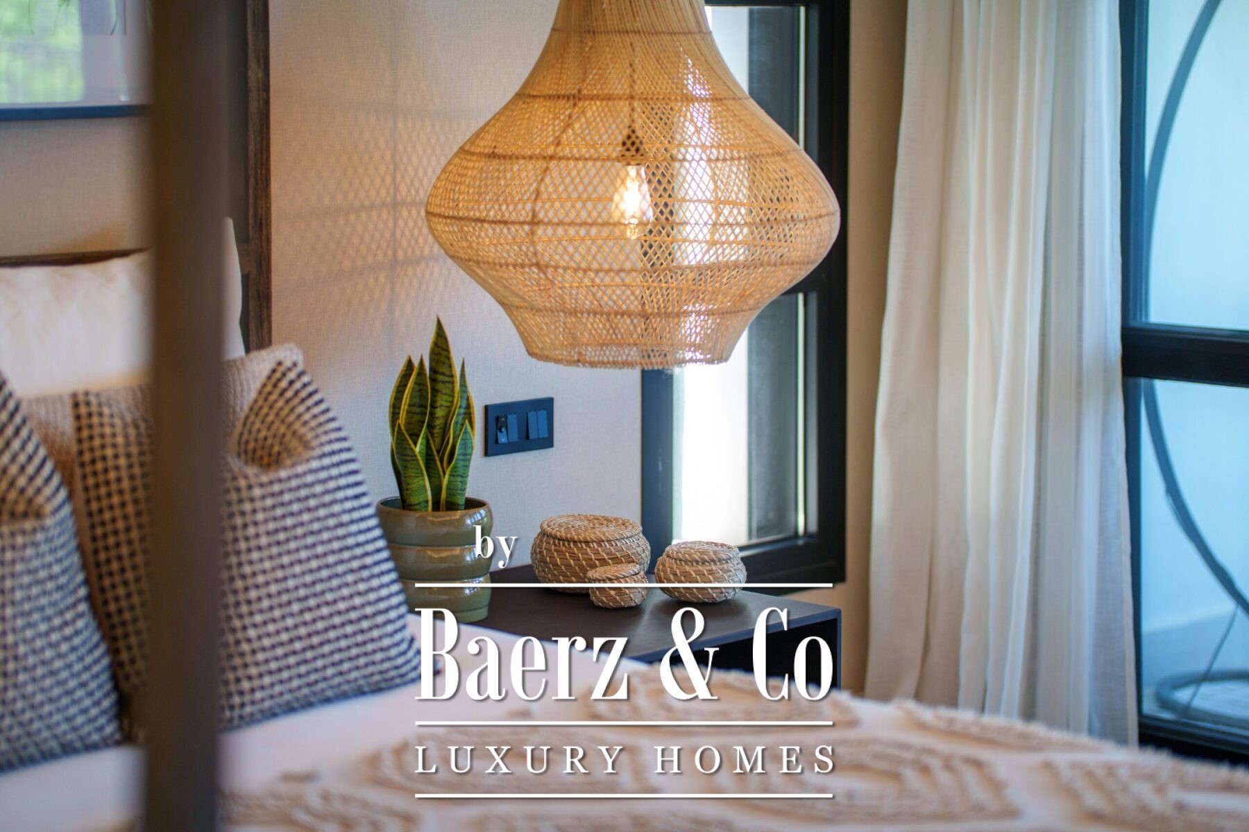 The interior design is a harmonious fusion of sophistication and warmth, combining neutral tones, natural textures, and bespoke furnishings to create a serene yet luxurious atmosphere. Handpicked décor pieces, artisanal lighting, and thoughtfully integrated shelving add character and charm, while large windows frame the captivating views and invite abundant daylight into every space. The result is a home that feels both contemporary and timeless, with a refined aesthetic that enhances its architectural beauty.
