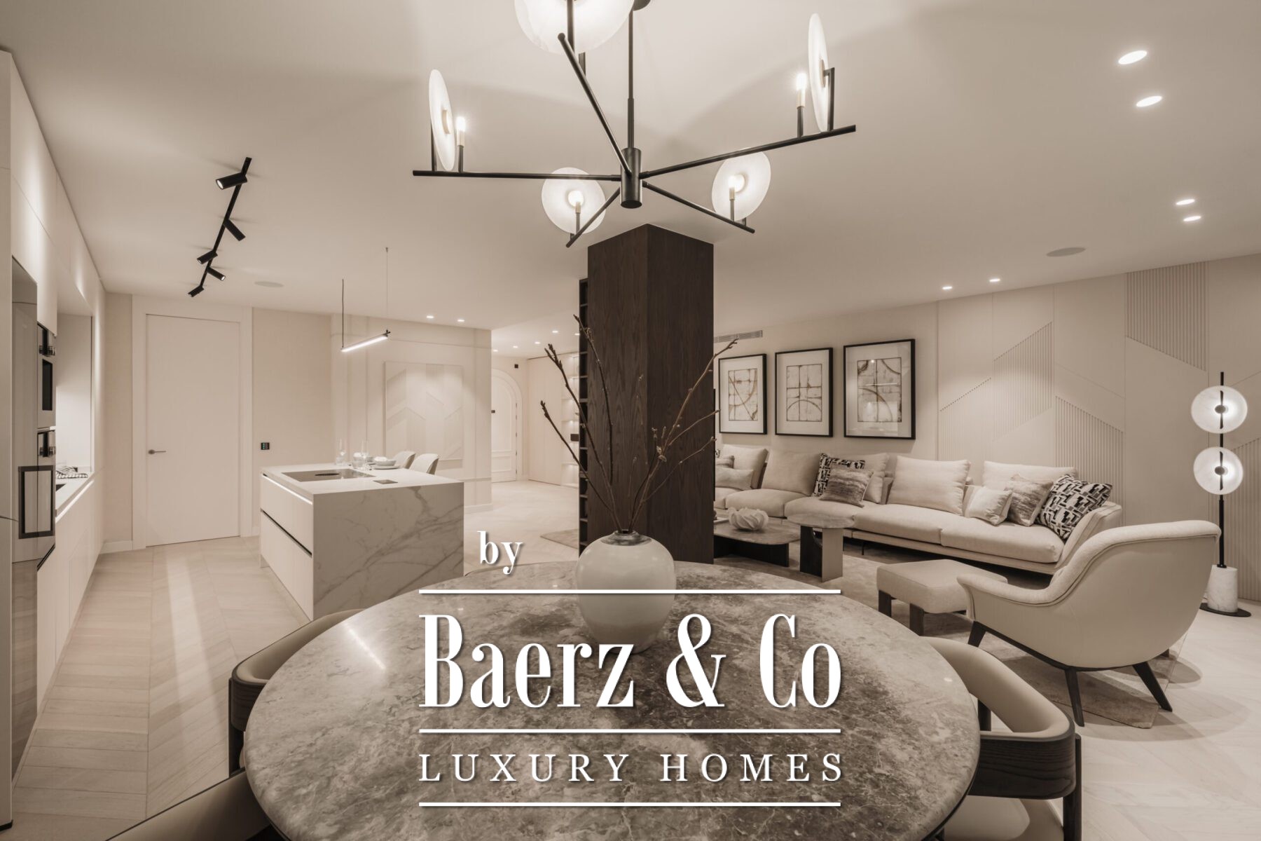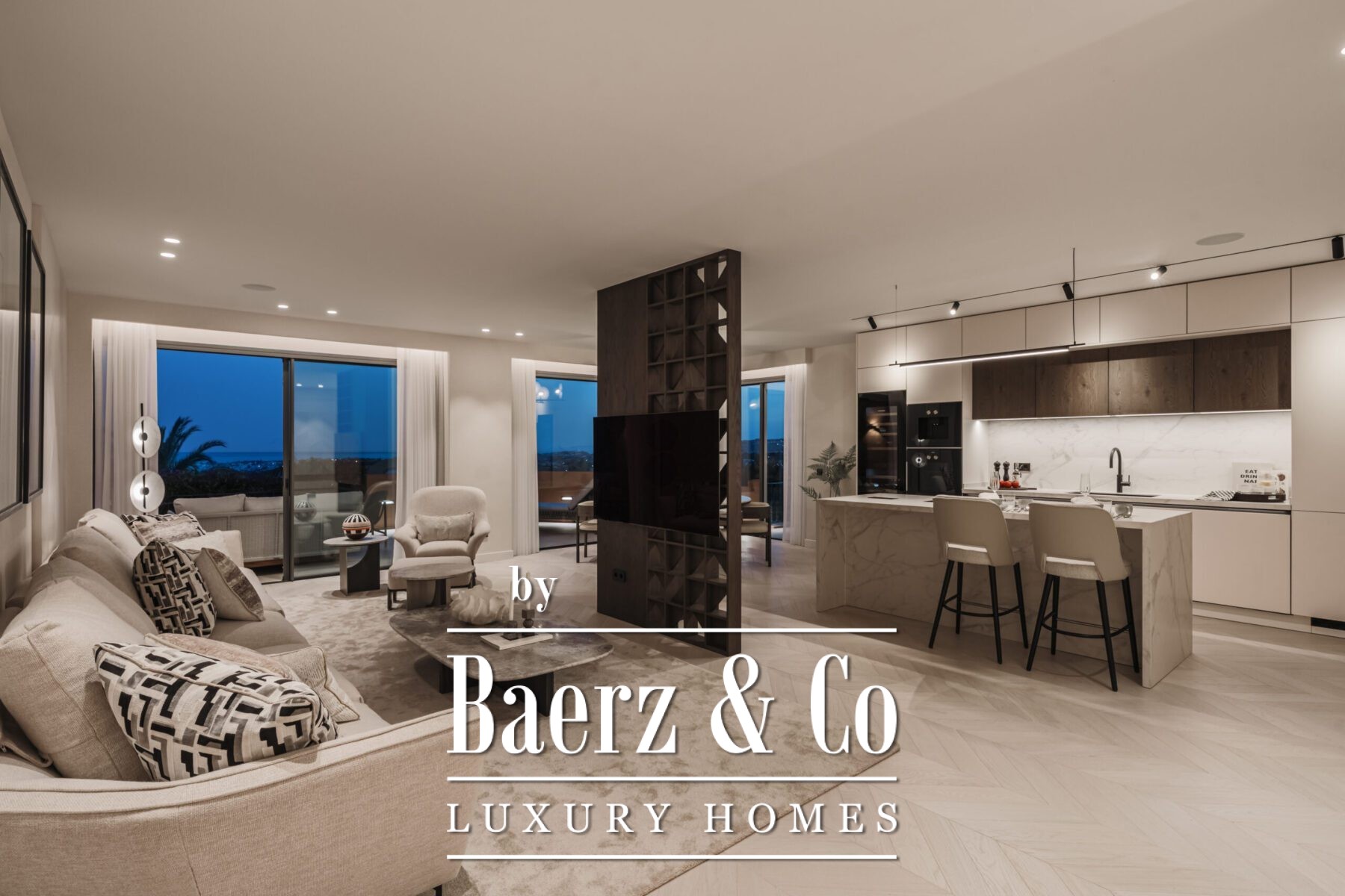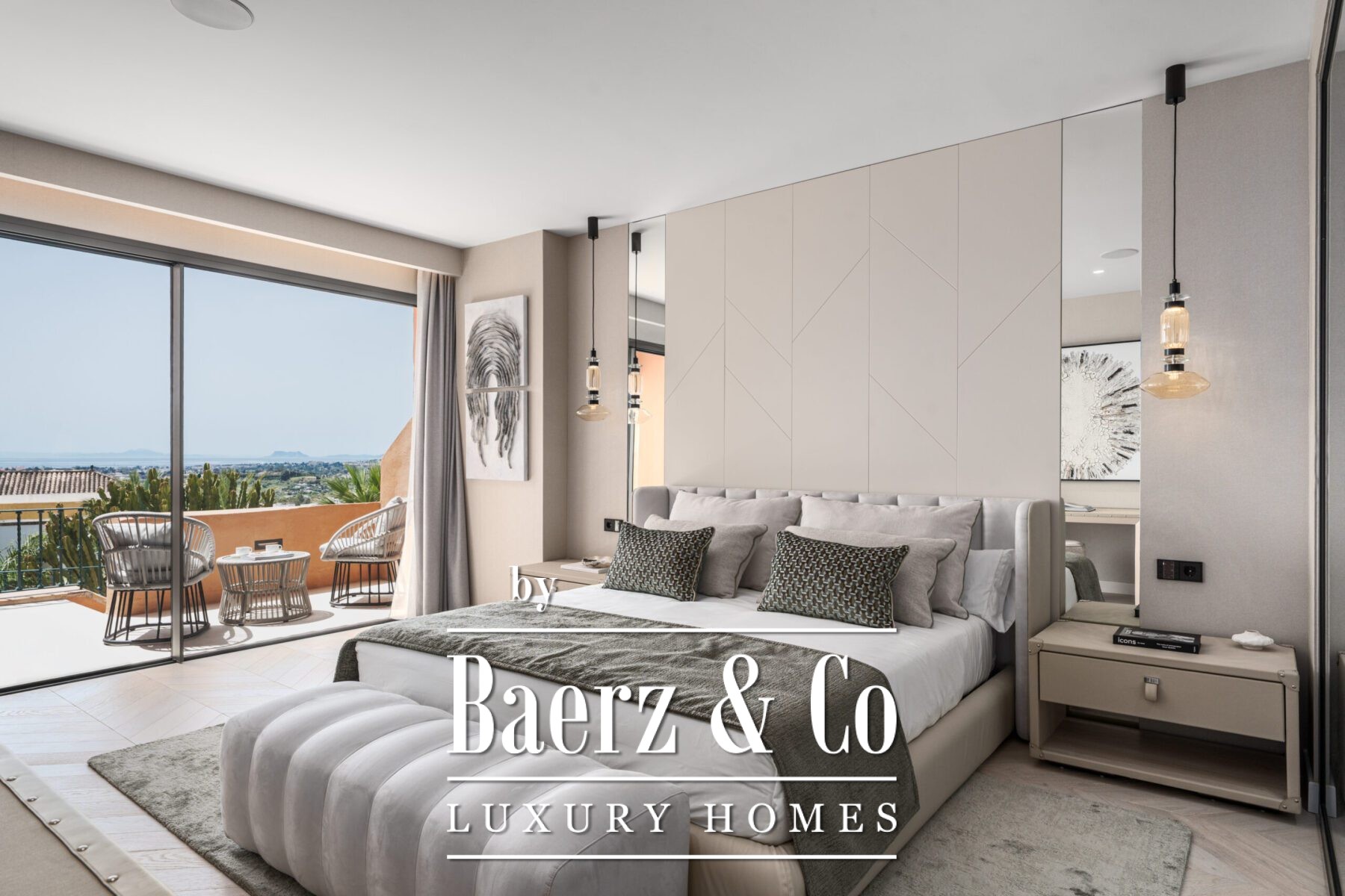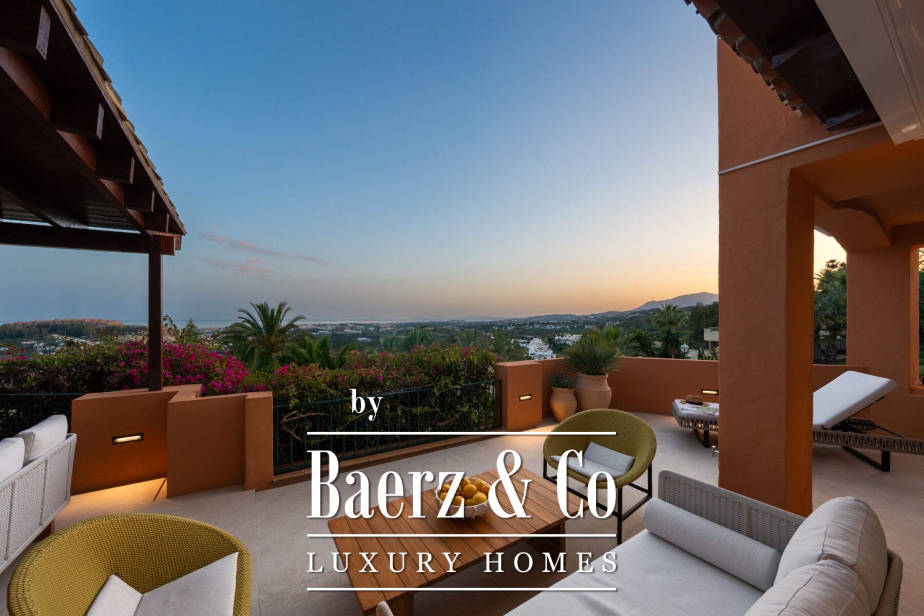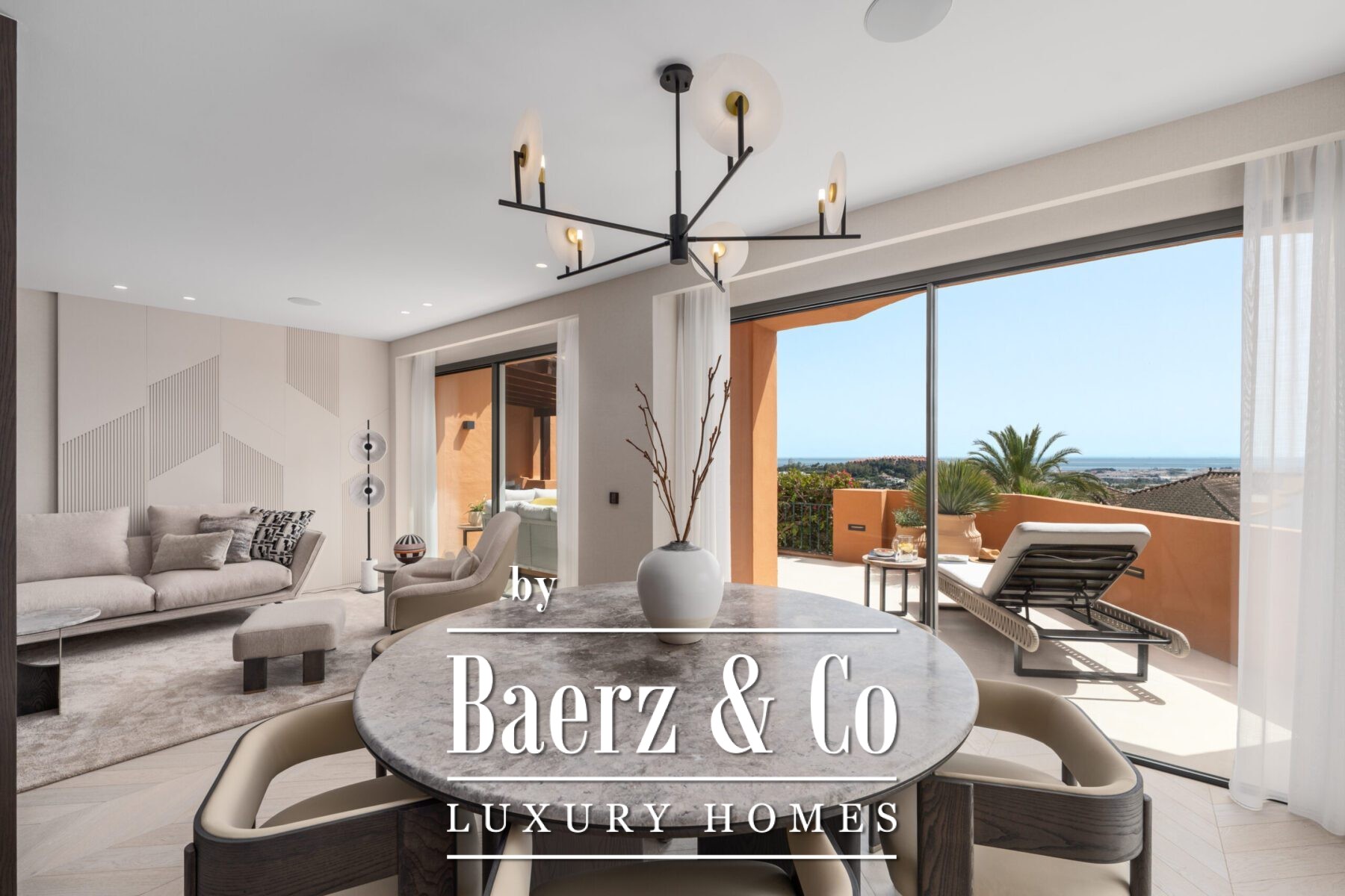 Apartment Marbella presents a rare vantage point above the prestigious streets of La Cerquilla, Nueva Andalucía. This fully renovated ground floor residence spans 215 m² and offers panoramic views of the Mediterranean Sea, the mountains, and famed golf courses, establishing a sense of harmony between sophisticated interior design and the surrounding landscape.