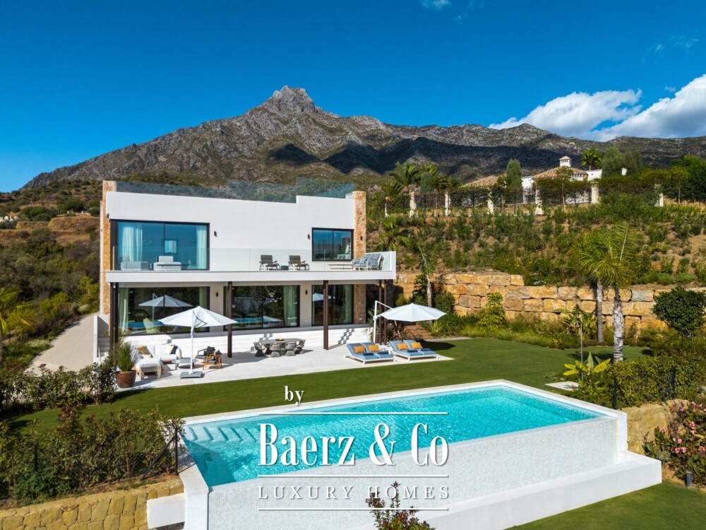 Sophisticated amenities include a home office, bespoke bar, entertainment room, home gym, Turkish bath, indoor pool, and dedicated cinema room. Outdoor space is equally deliberate, offering a private swimming pool, solarium with outdoor kitchenette, and a succession of terraces, all oriented toward panorama views of the Mediterranean and the mountains. With 24-hour security, proximity to golf, the sea, and Marbella's cultural enclave, this luxury villa for sale in Marbella Hill Club articulates discretion and enduring value.