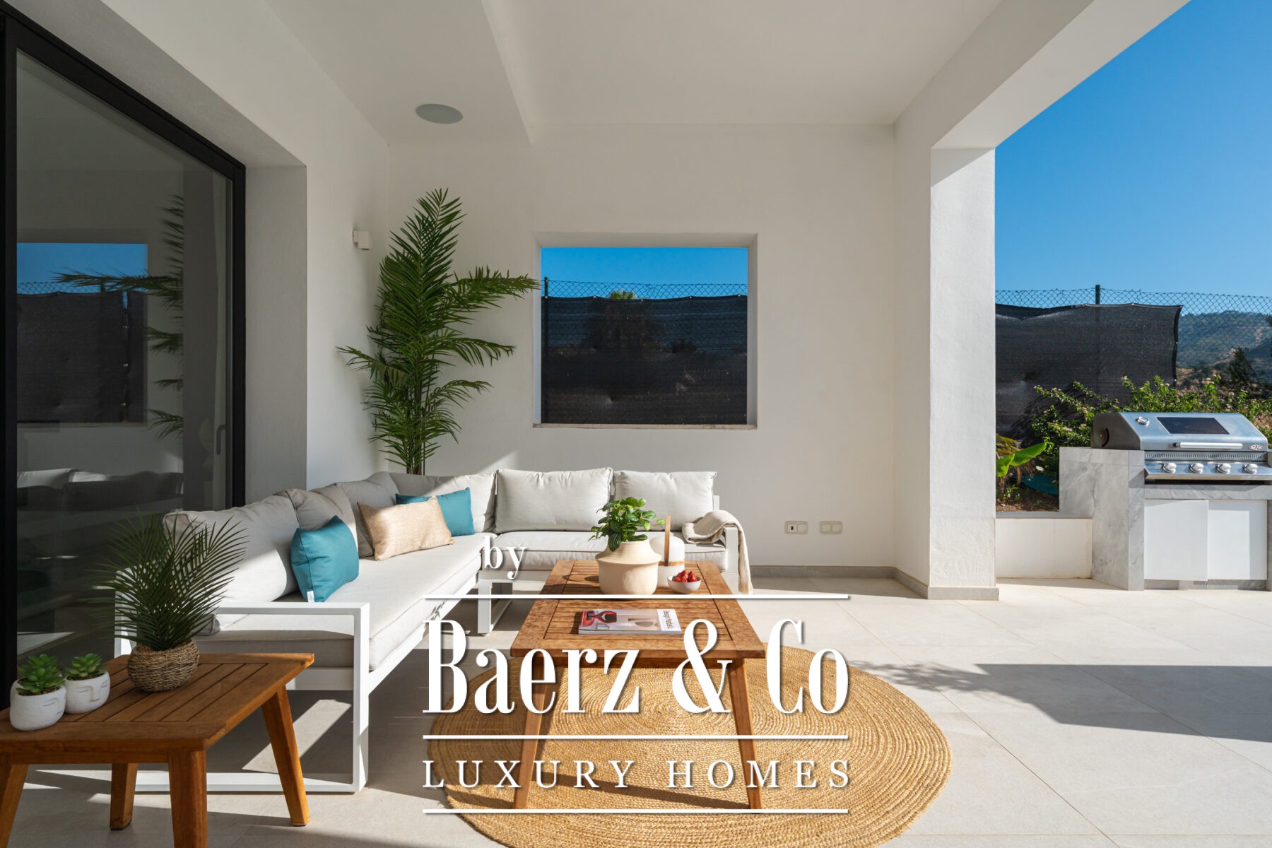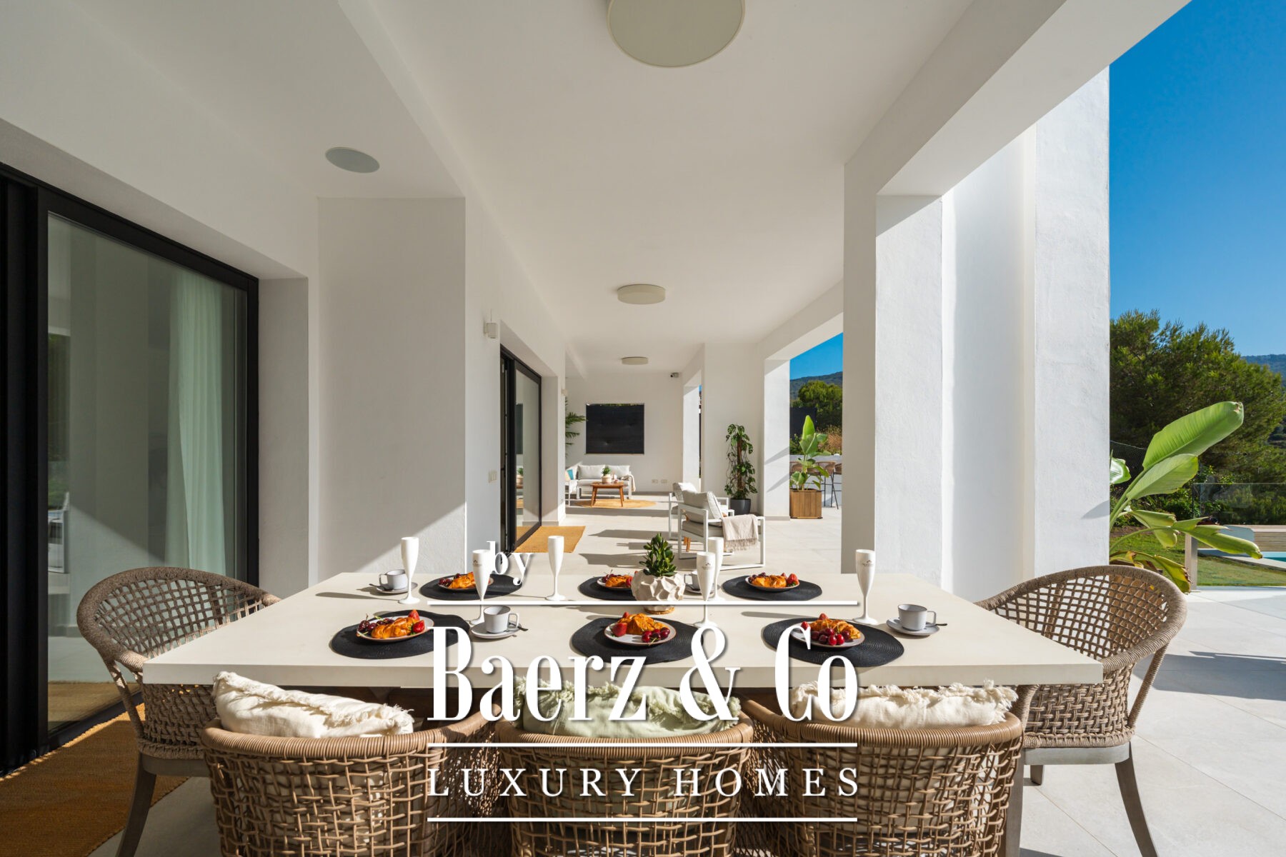 The residence’s architecture balances contemporary clarity with warmth, employing ceramic stone and wood finishes to create a poised atmosphere. Miele appliances, solar panels, electric blinds, and an advanced irrigation system speak to its sustainable detailing. Terraces open from all bedrooms and main spaces, leading to a covered swimming pool, outdoor barbecue area, and sauna, while panoramic golf course and Mediterranean Sea views act as a constant aesthetic backdrop.