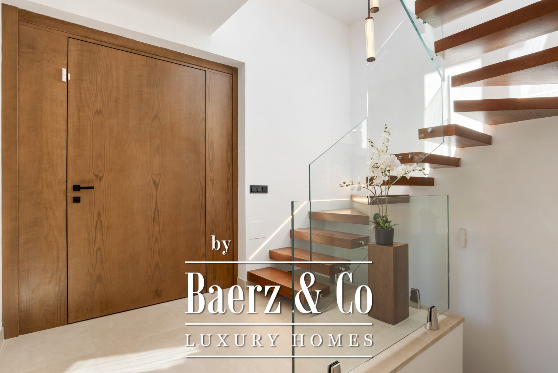 On the rooftop terrace, panoramic views of the sea and mountains invite moments of quiet reflection. Built-in wardrobes include LED illumination, combining practicality with subtle sophistication. The villa offers a garage for one car with a charging point, and additional enclosed parking for up to three further vehicles within the gate.
