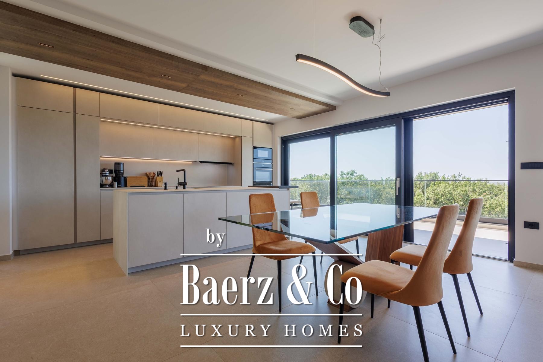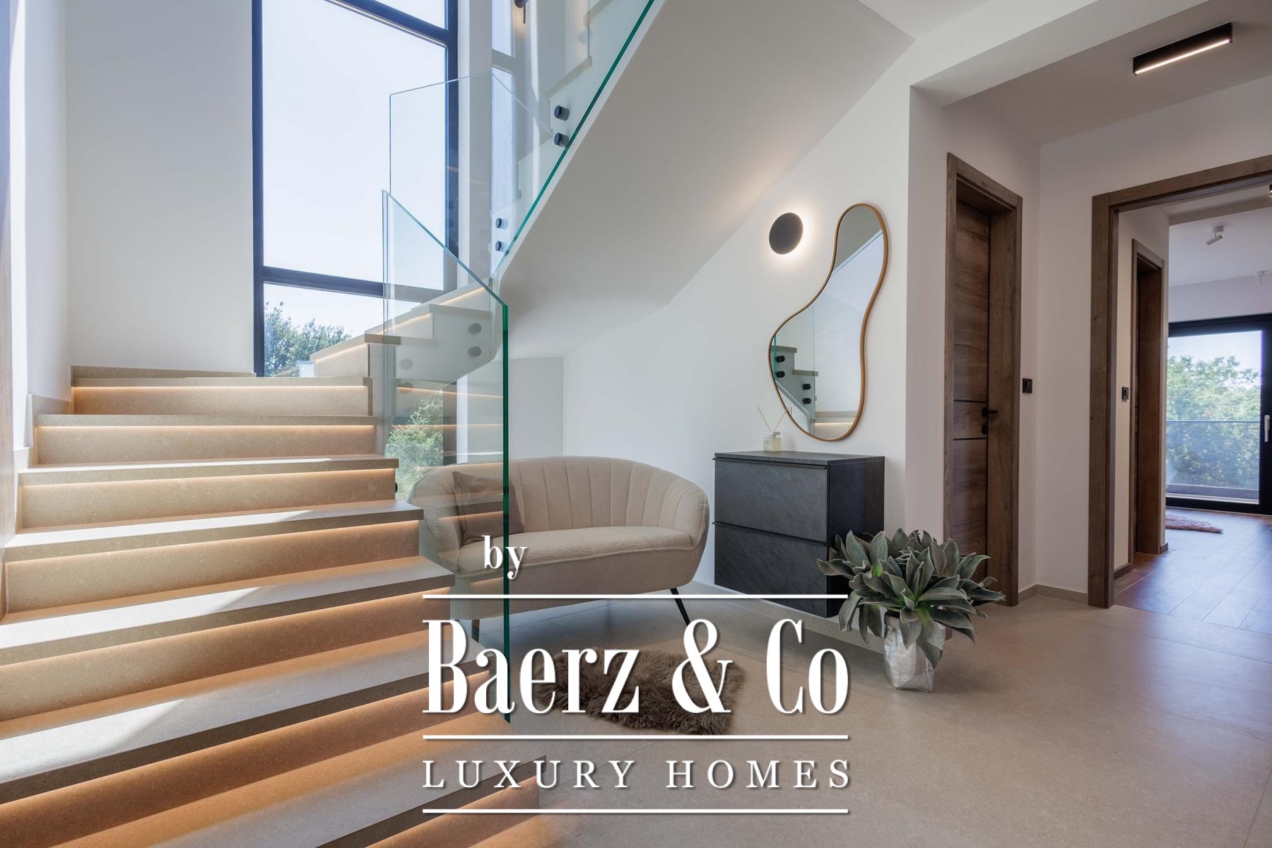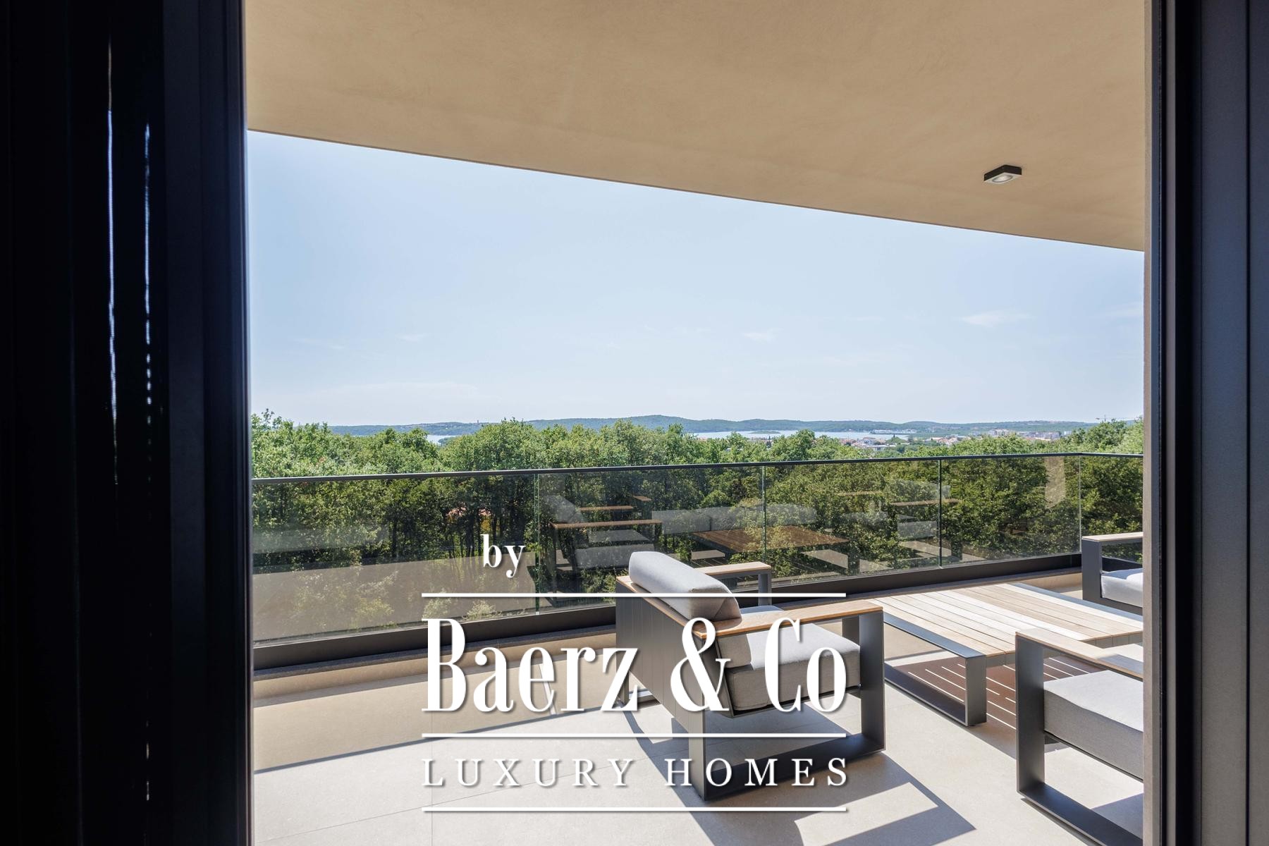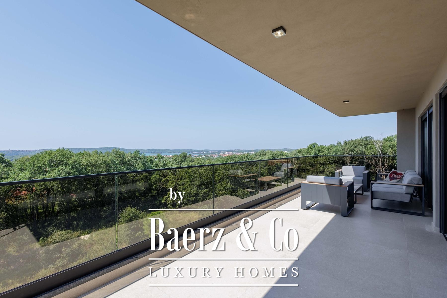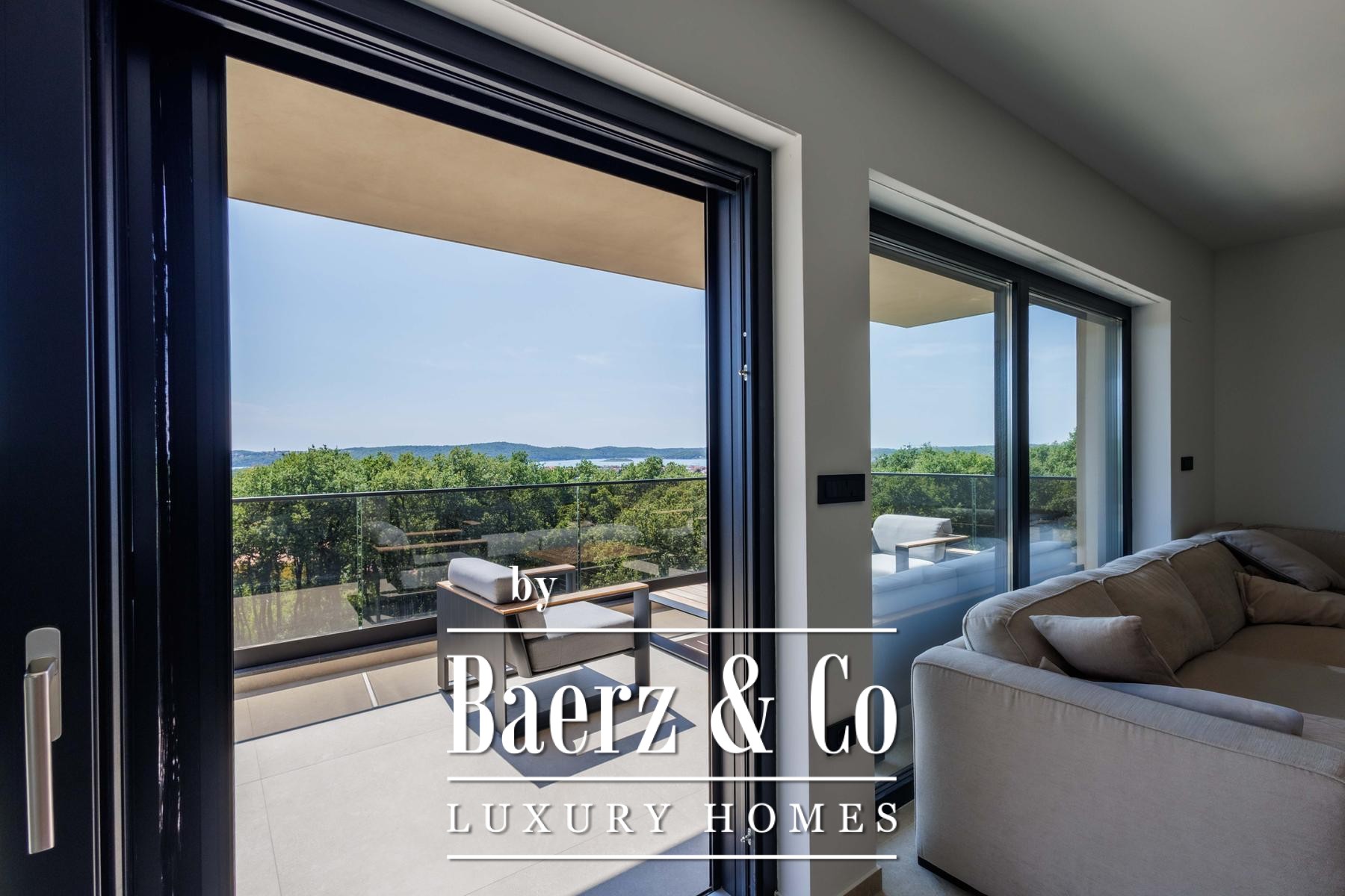 In a quiet part of Medulin, on a spacious plot of 780 m², a modern villa offers the perfect combination of luxury, comfort, and an extraordinary sea view. The house, with a total living area of 311 m², is arranged over several floors. Upon arrival, you will be greeted by a large private parking lot with direct access to the ground floor. On this level, there are two elegant bedrooms, each with its bathroom and terrace, and an additional toilet. An internal staircase leads to the first floor, where there is a spacious bedroom with its bathroom, a practical storage room, and an open living room connected to the kitchen and dining room in an open space concept. The living area leads to a large terrace with a spectacular view of the sea and the Medulin Bay, and a sliding glass wall subtly separates the living area from the relaxation area.Due to the cascading configuration of the terrain, an external staircase leads to the lower floor, where there is a separate apartment with a living room, kitchen, dining room, bathroom, and two unfinished rooms that can be adapted