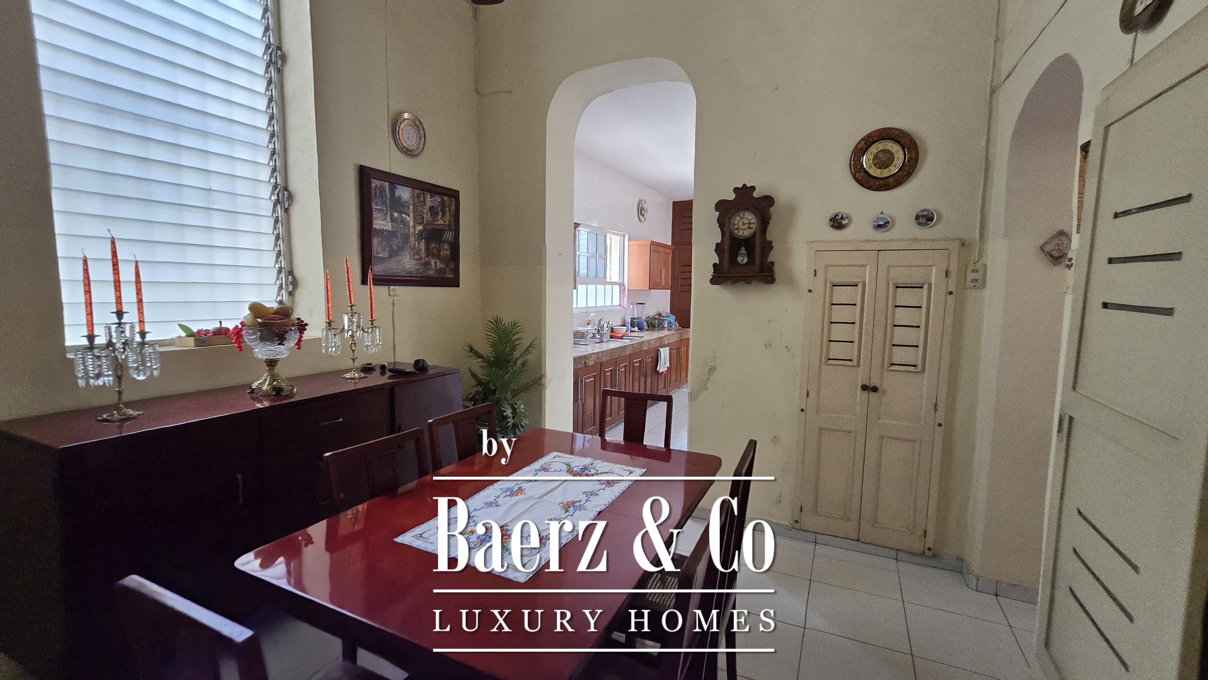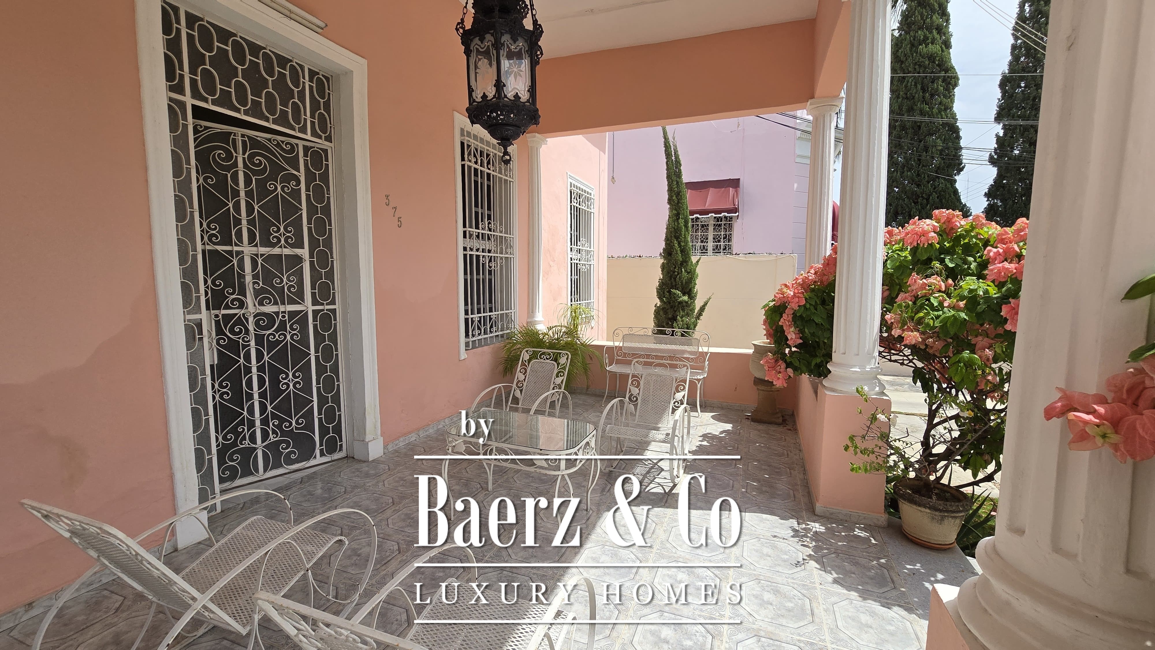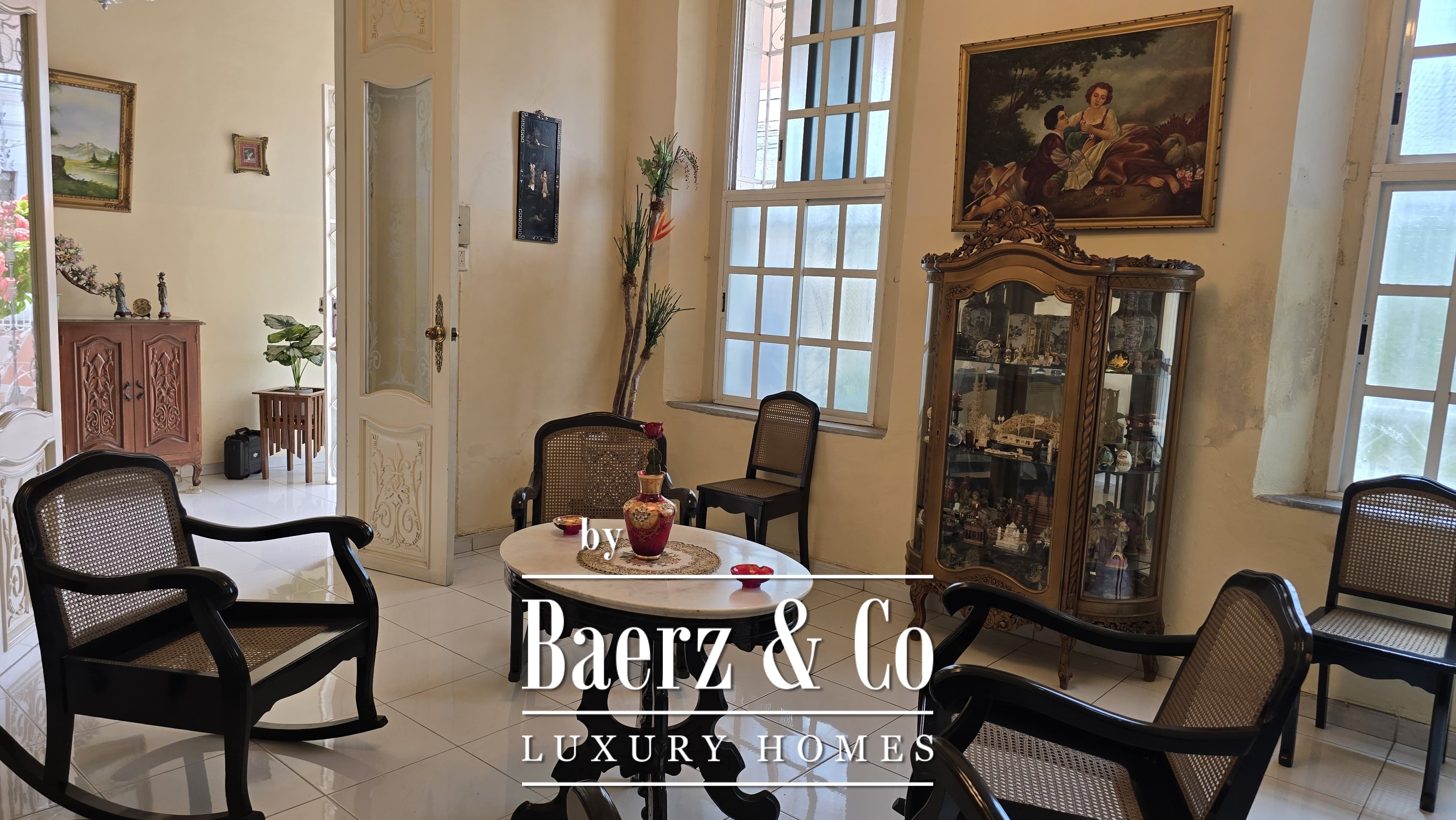 Beyond its grand façade, the residence offers four bedrooms, each with a dedicated bathroom, with the main suite enjoying a walk-in closet. The layout is both classic and accommodating, with a sequence of living and dining rooms, a granite-fitted kitchen, two family rooms, a studio, service quarters with bath, and ample storage and laundry spaces. Wide foyers and a generous porch invite openness, while the private pool and covered garage for four cars enhance everyday luxury. The property integrates contemporary comforts such as hydro system, inverse osmosis, electric gate, and essential connectivity.