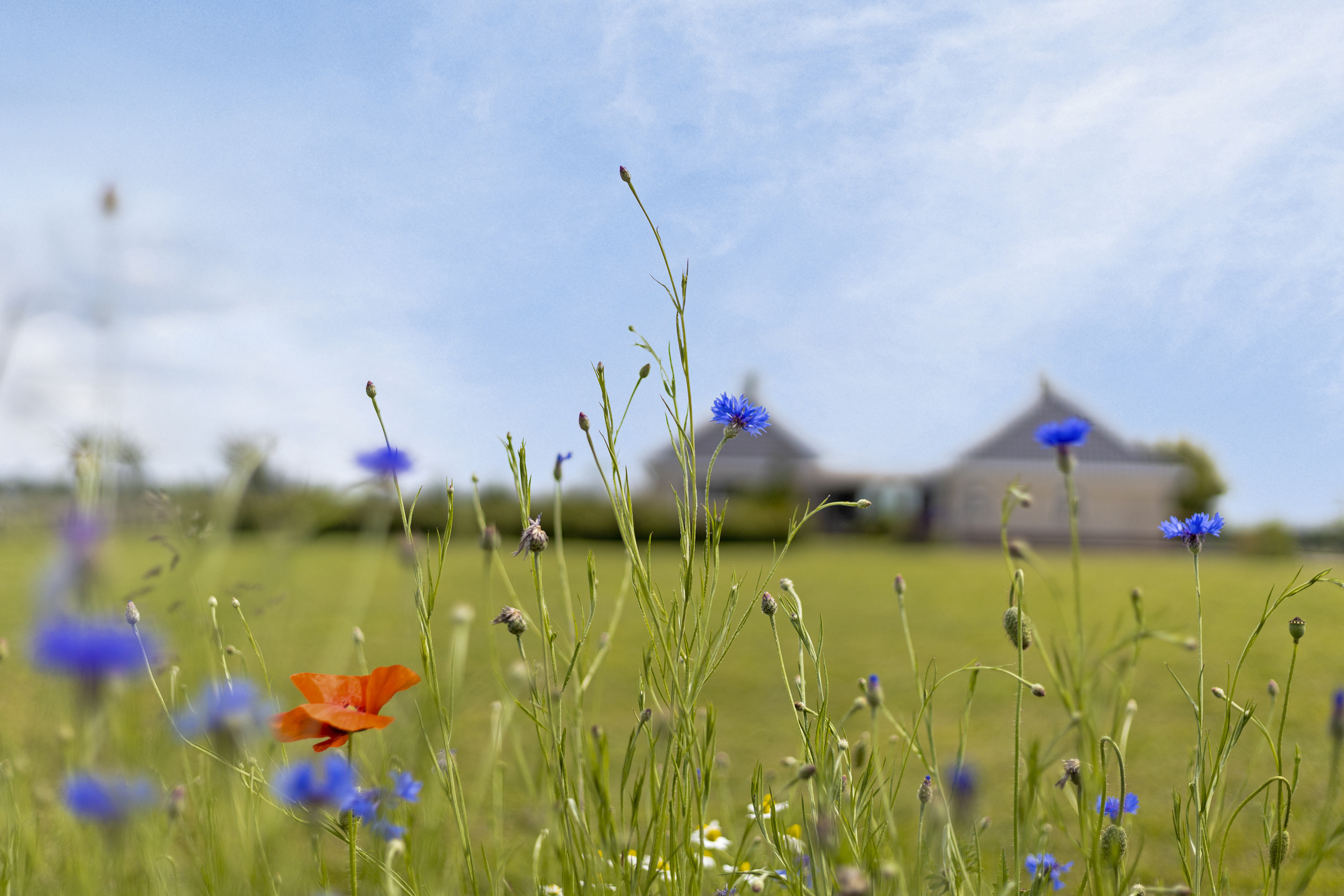 The garden is divided with an ornamental garden at the front and side, at the back of the house there is a vegetable garden. The back of the plot is covered with carpet of field flowers, with daisies, chamomile, stork's beak, sunflowers, cornflowers and poppies in all colors. Behind the garden runs the bike path where people regularly take the time to literally stop and take in the beautiful view.