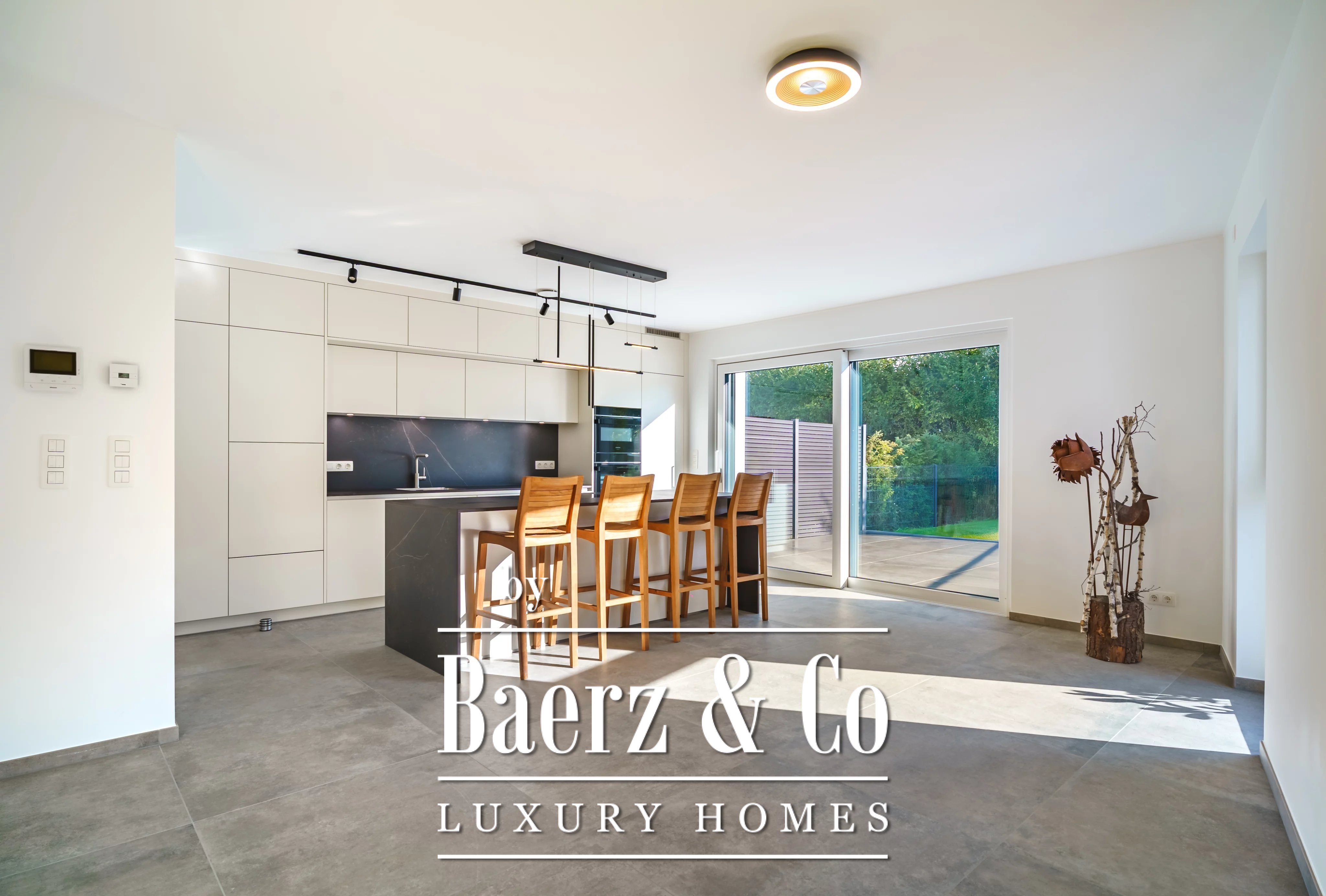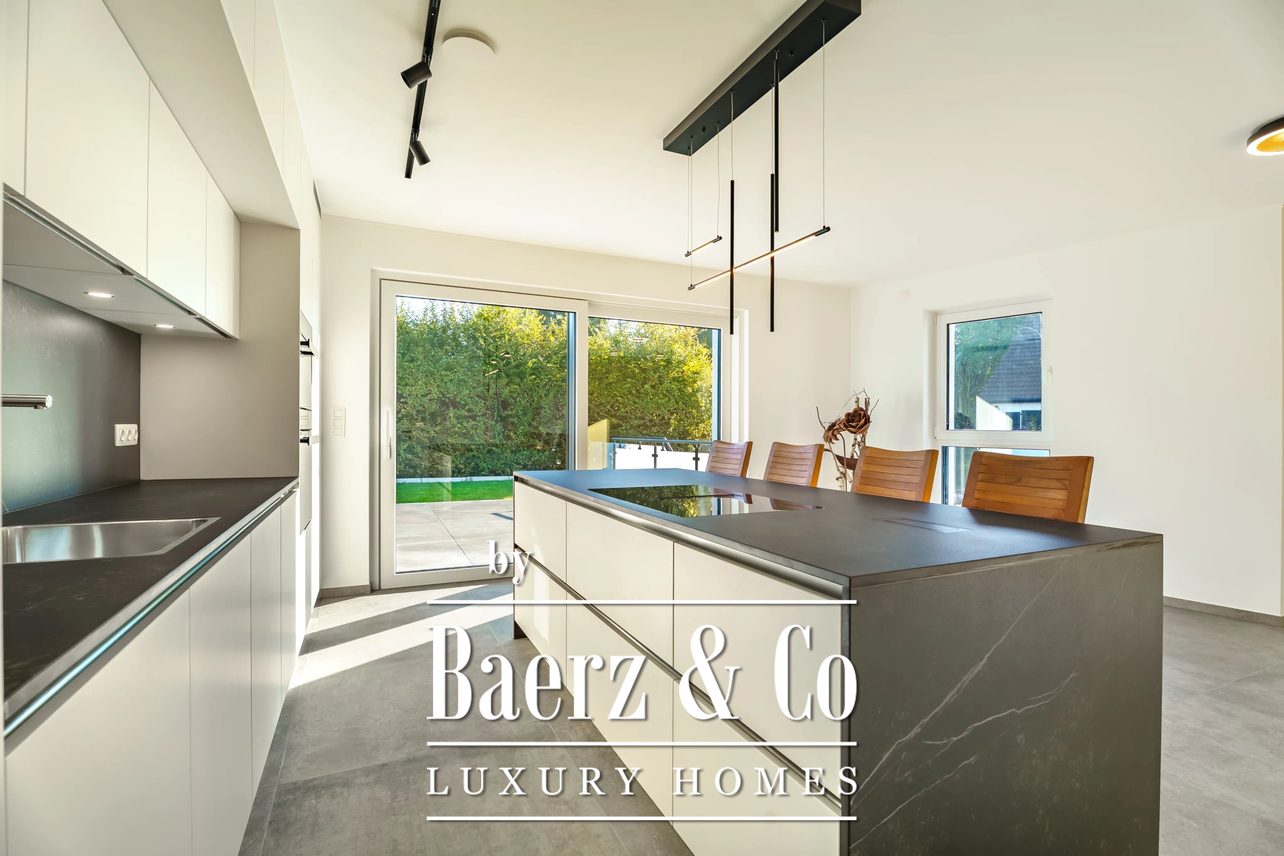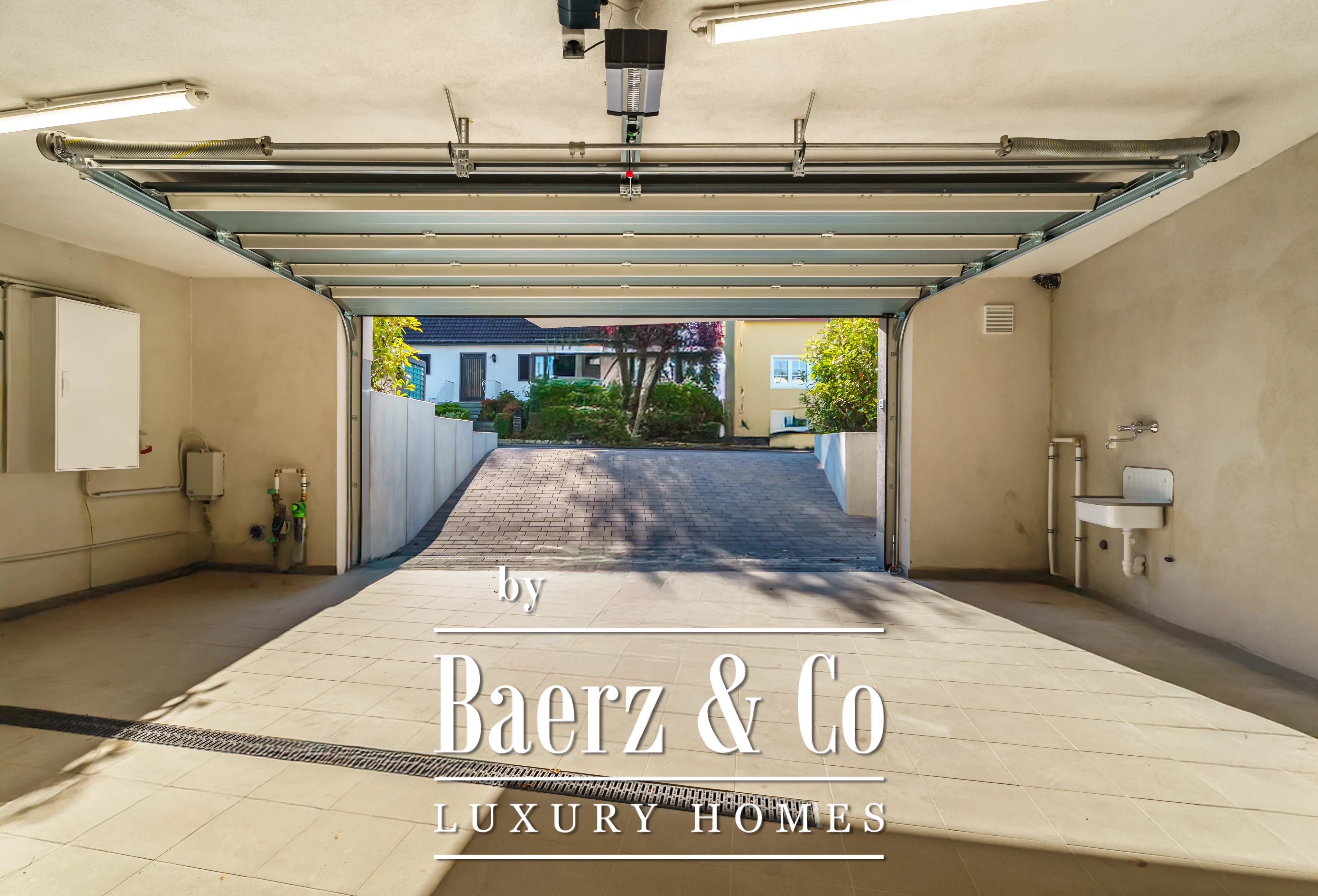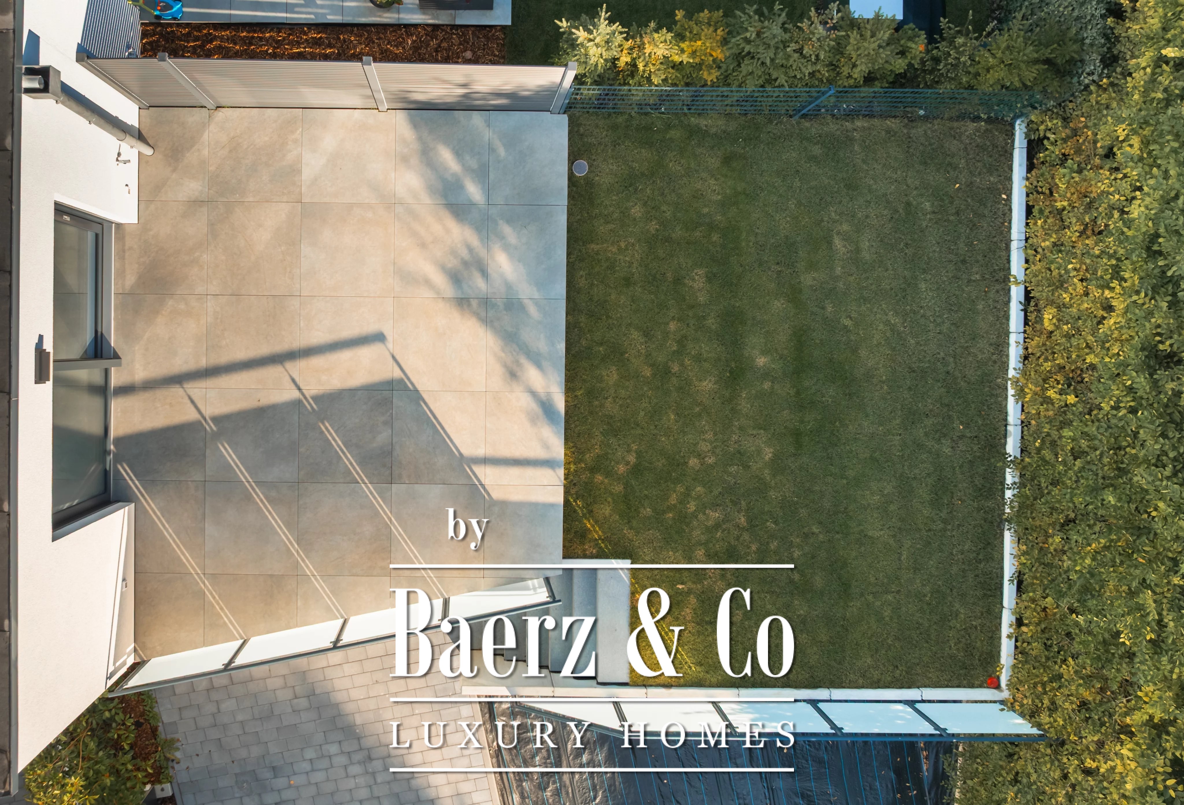 Triple glazing, sliding windows, electric awnings, and an advanced alarm system underscore a commitment to comfort and security throughout this A+ energy class home. The 40.45 m² double garage and videophone entry add further assurance. For those seeking a luxury single-family house for sale in Niederanven, this address articulates contemporary architecture with enduring discretion.