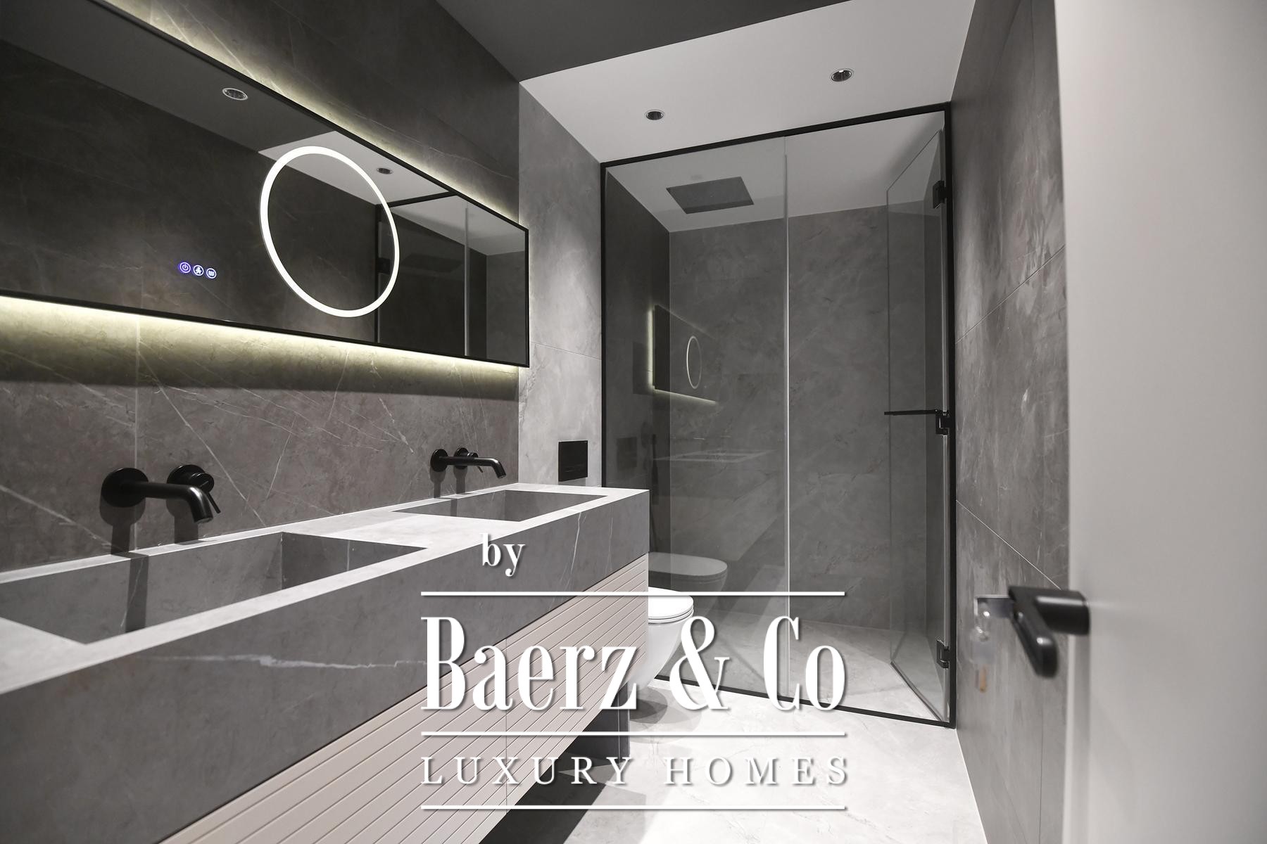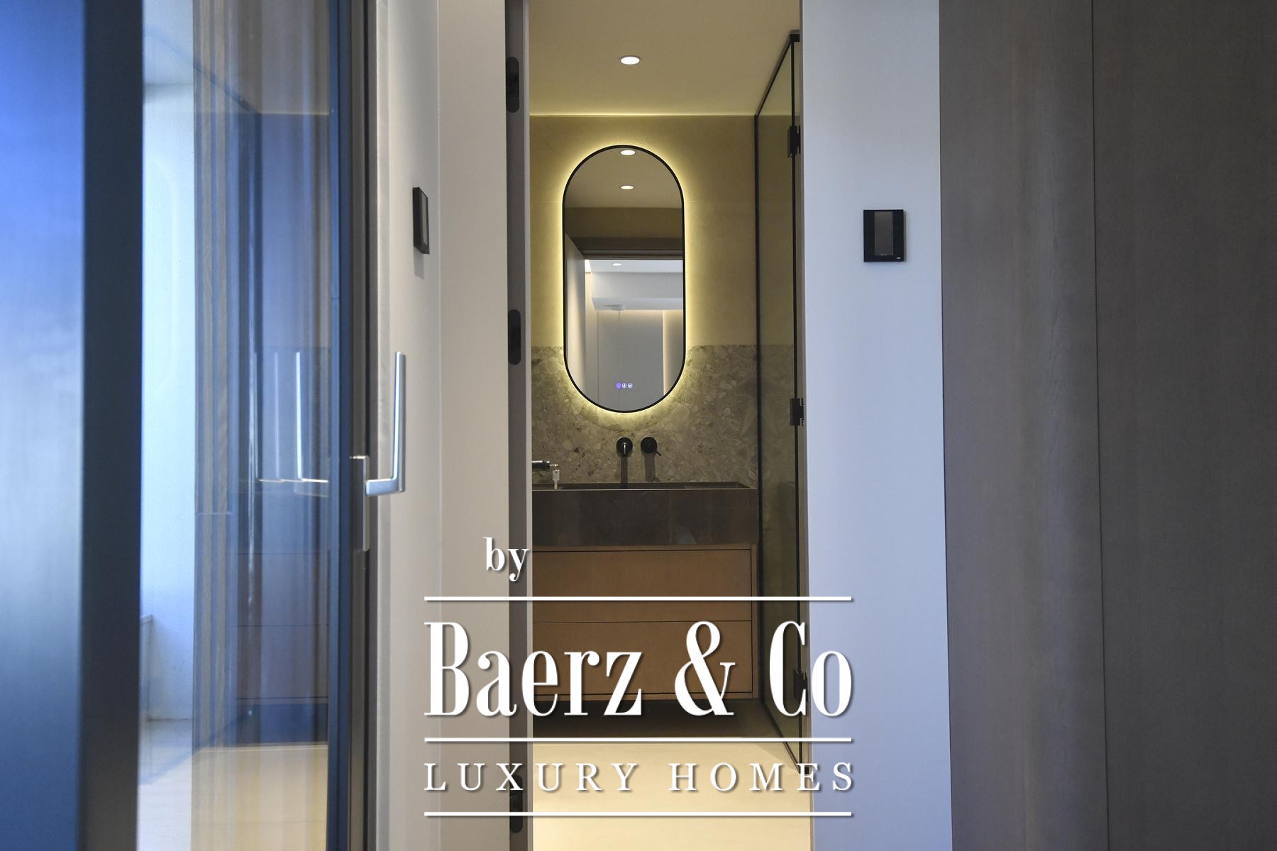 Each of the three bedrooms privileges privacy and sea views, with the master suite offering an en-suite bathroom and tailored wardrobes. Bathrooms feature Hansgrohe fixtures, walk-in showers, underfloor heating and precise finishes that recall a private spa. Practical living is ensured by a dedicated laundry room, storage space and an additional guest toilet.