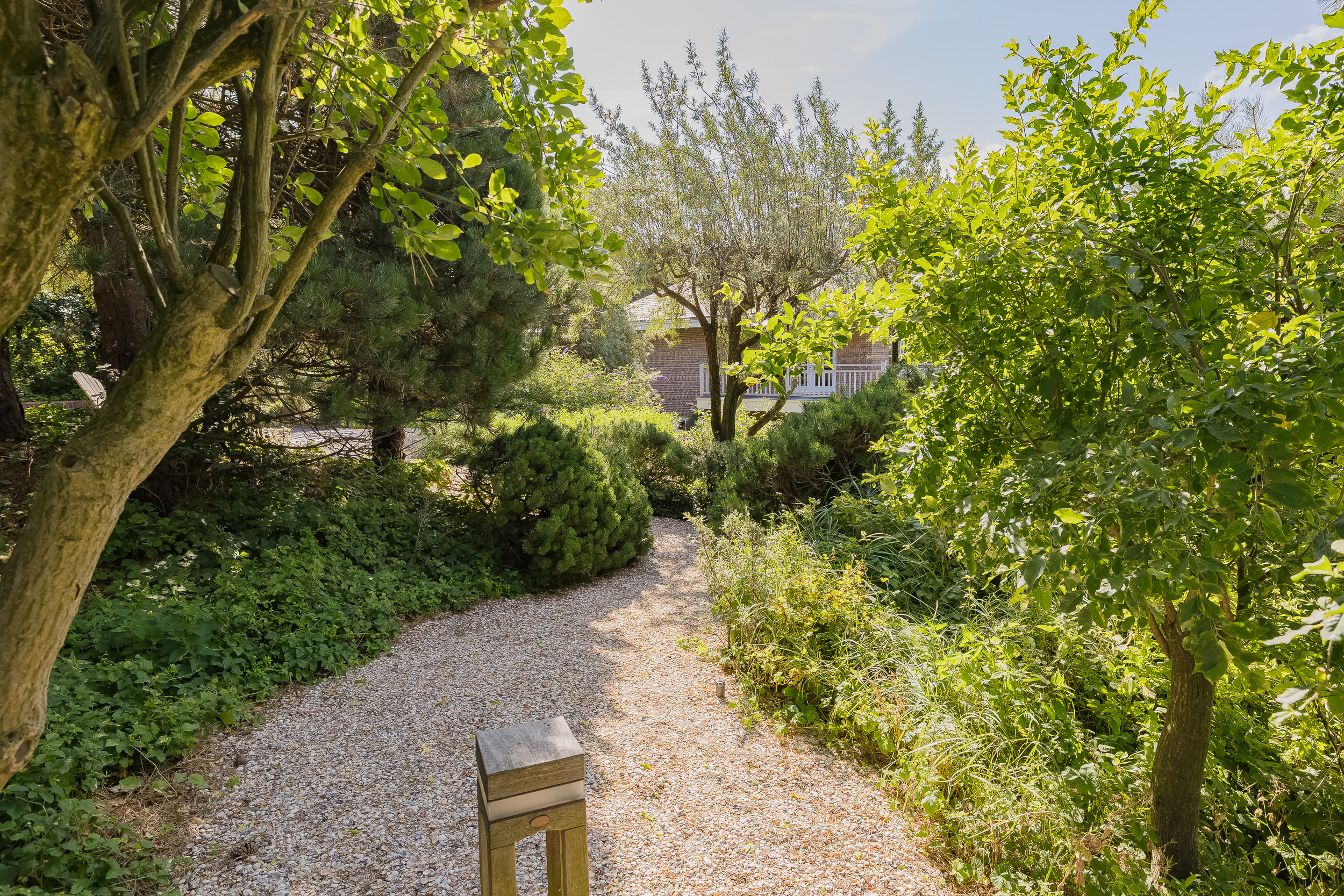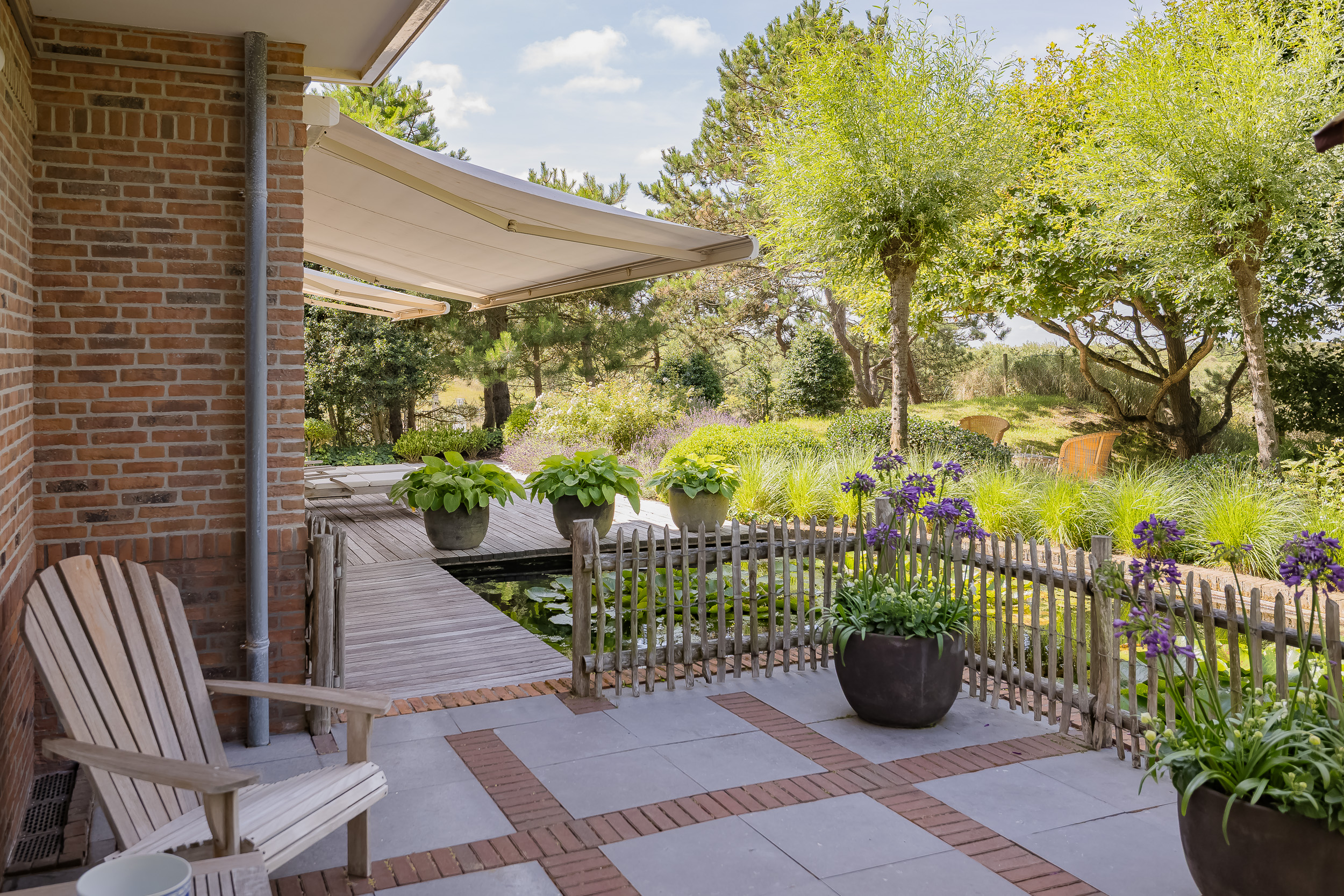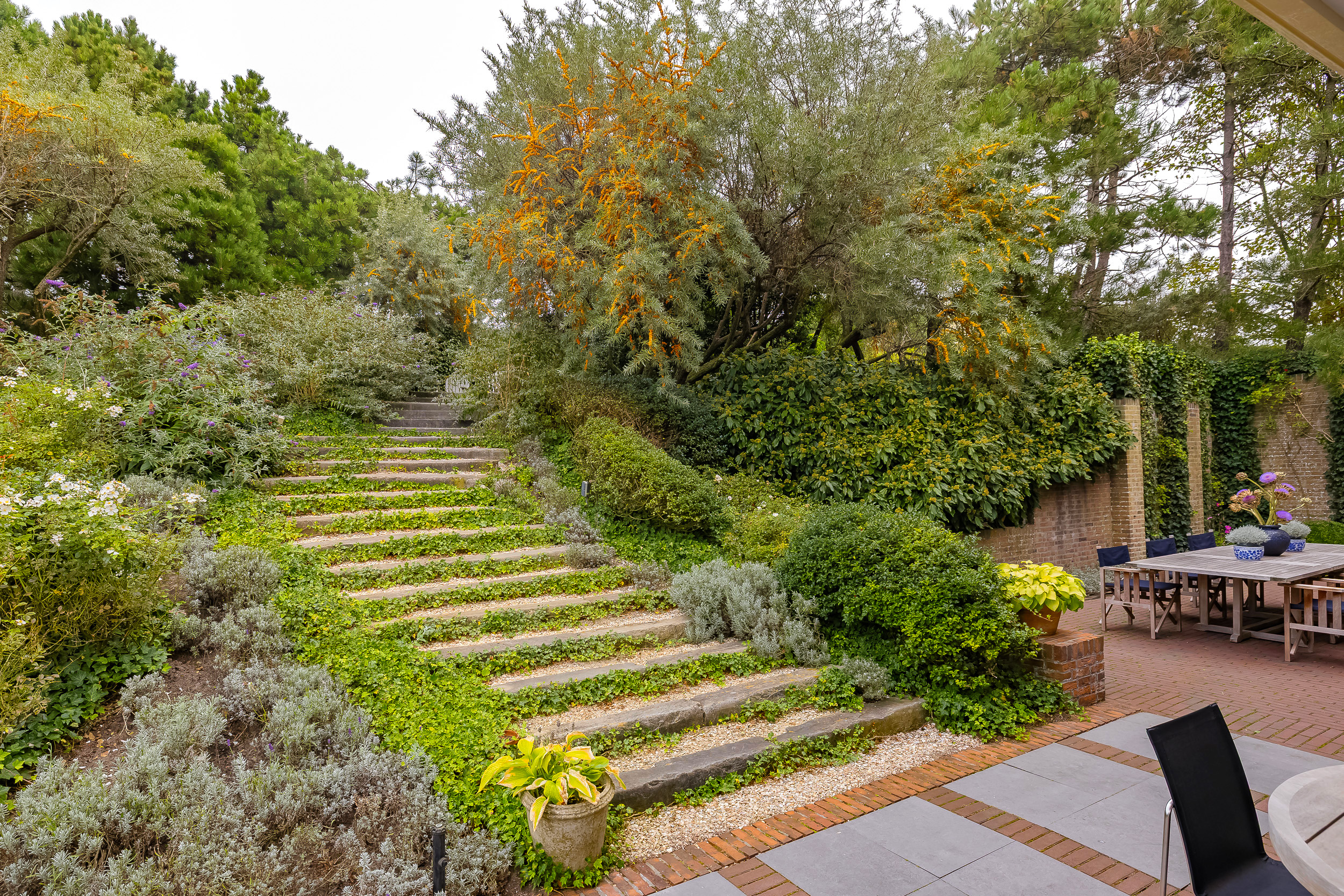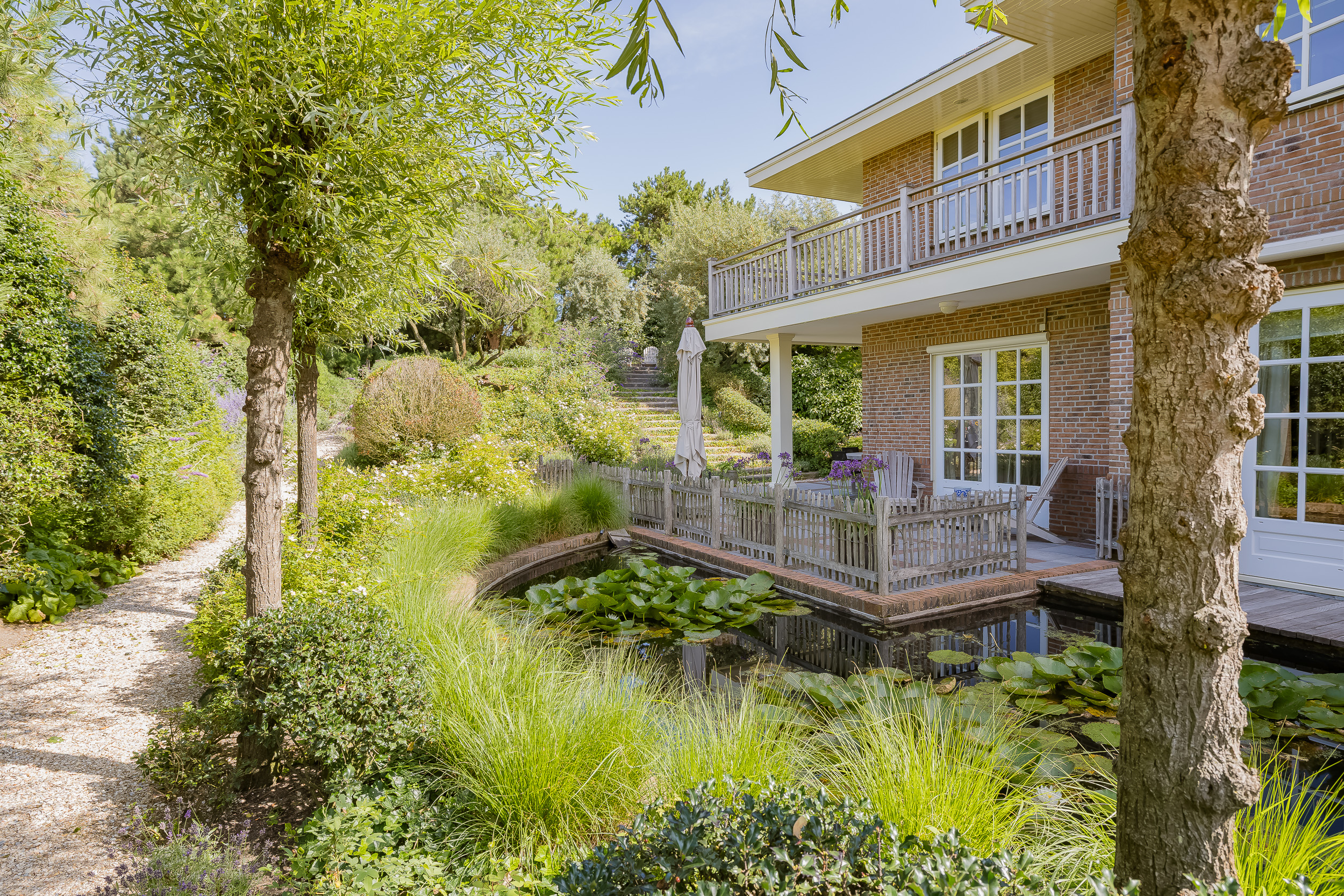 The garden is truly enchanting. Designed by architect Arend Jan van der Horst, it slopes gently with the dune landscape and offers an oasis of peace and beauty. Terraces, various seating areas, large trees, richly flowering borders, a pond with a deck terrace, and elegant shell paths create a unique outdoor experience. A place to enjoy endlessly.
