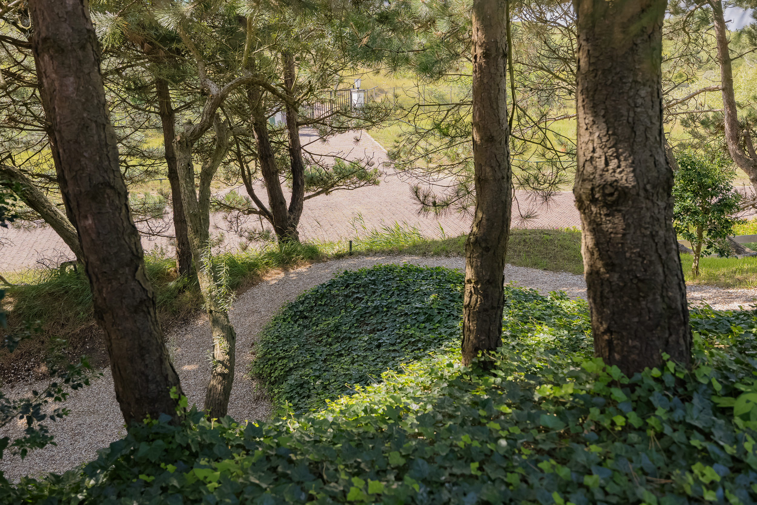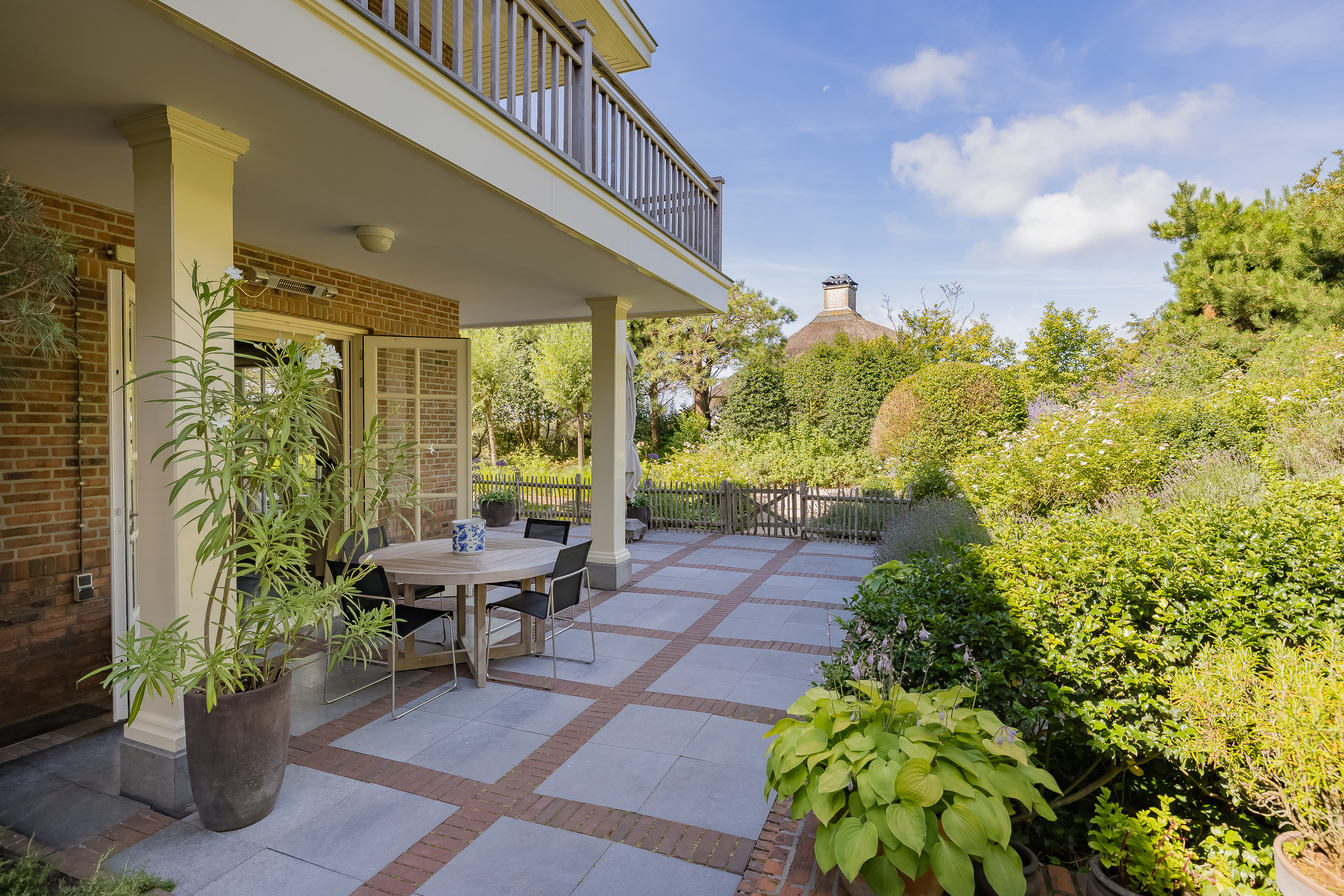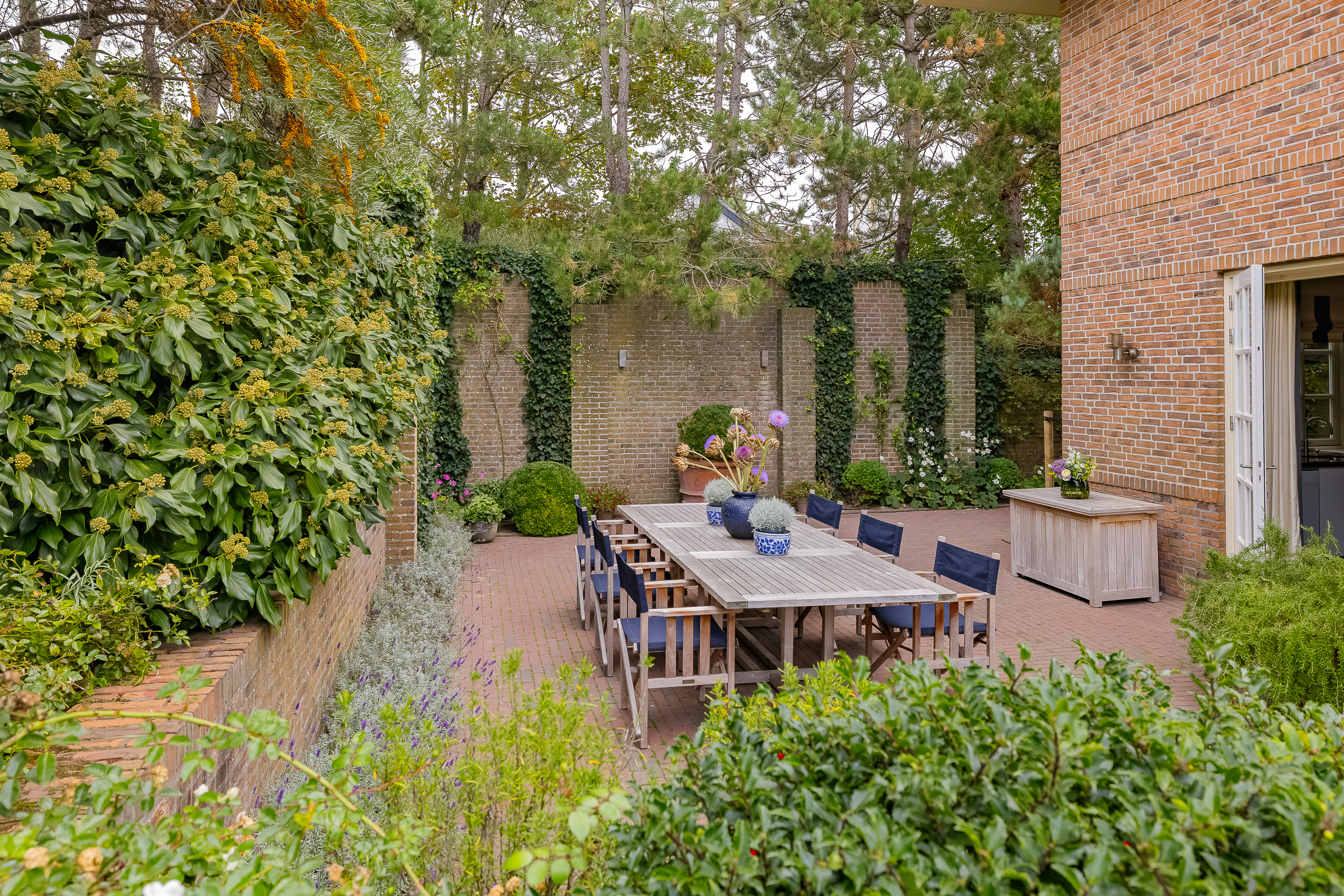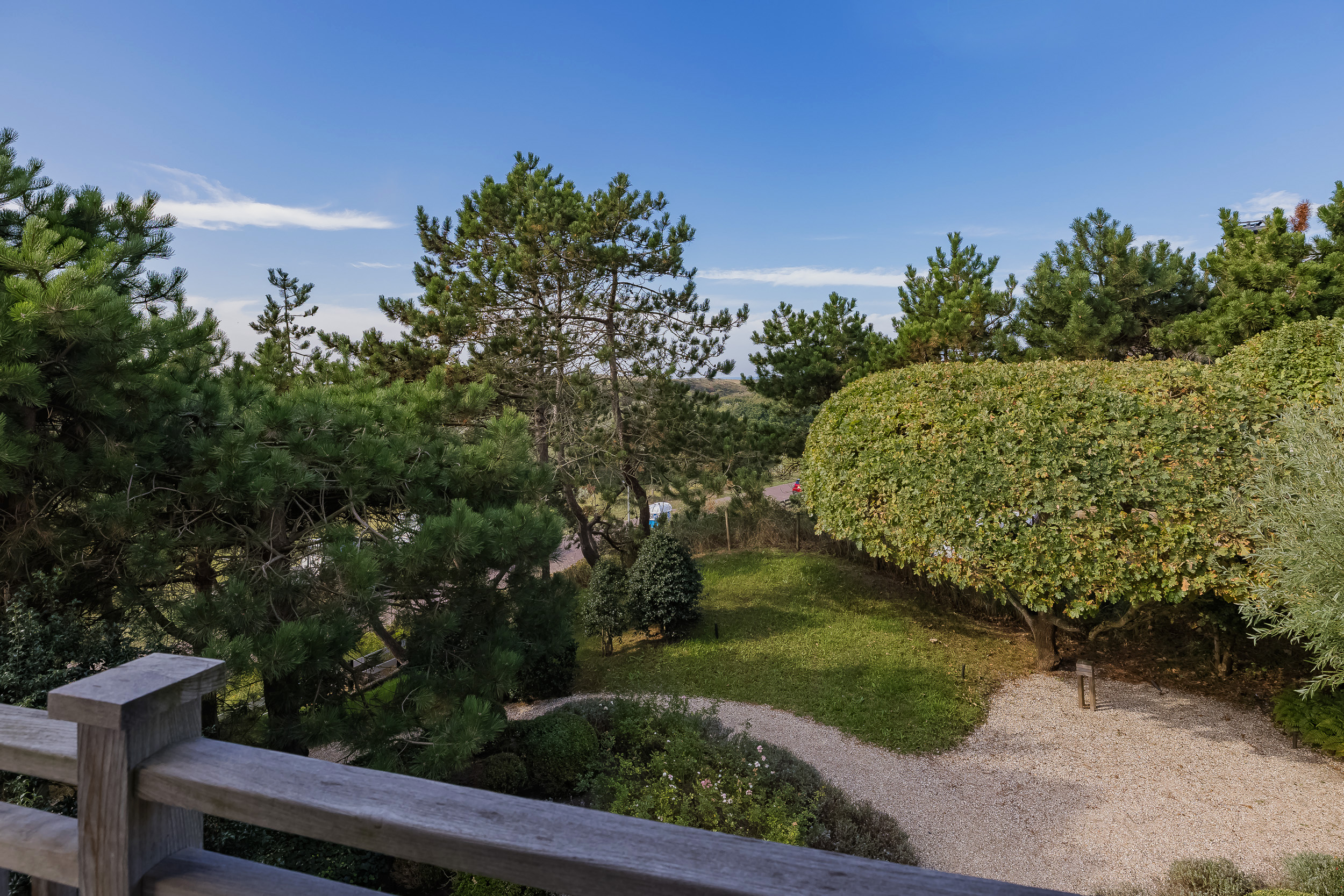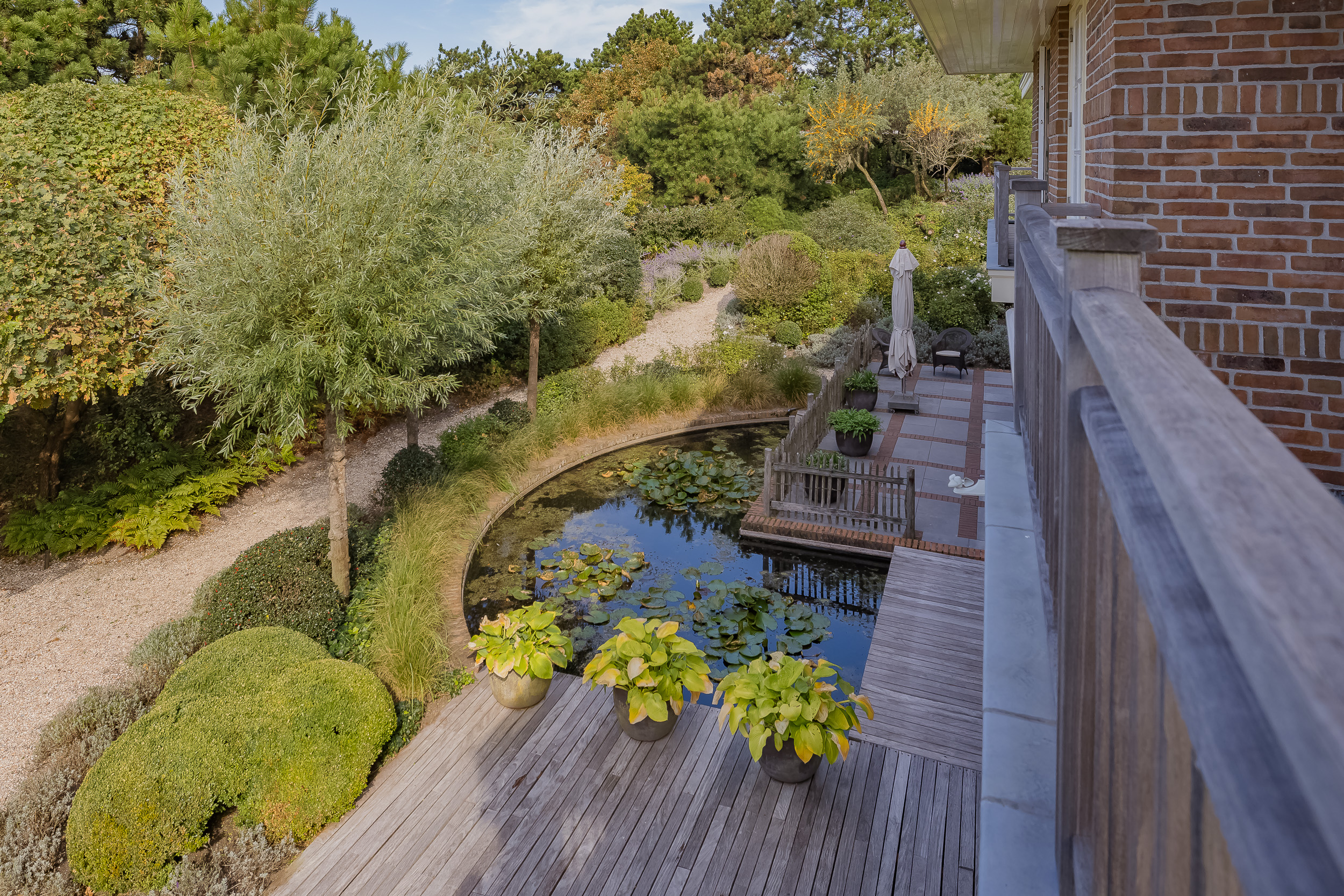 The garden is truly enchanting. Designed by architect Arend Jan van der Horst, it slopes gently with the dune landscape and offers an oasis of peace and beauty. Terraces, various seating areas, large trees, richly flowering borders, a pond with a deck terrace, and elegant shell paths create a unique outdoor experience. A place to enjoy endlessly.