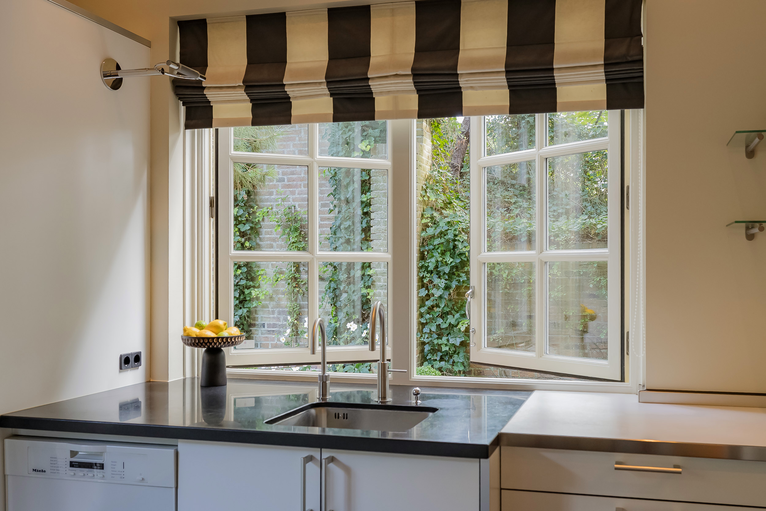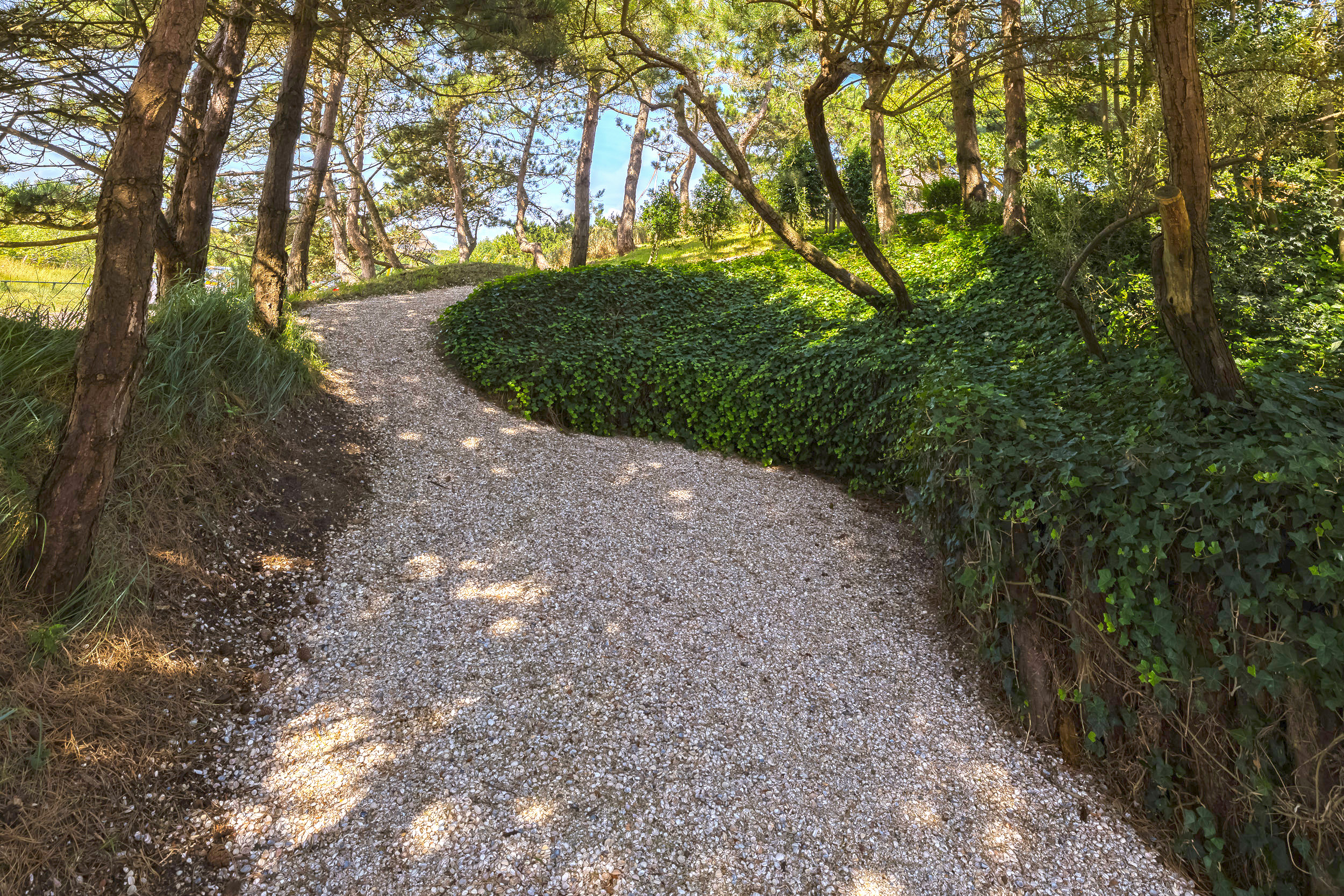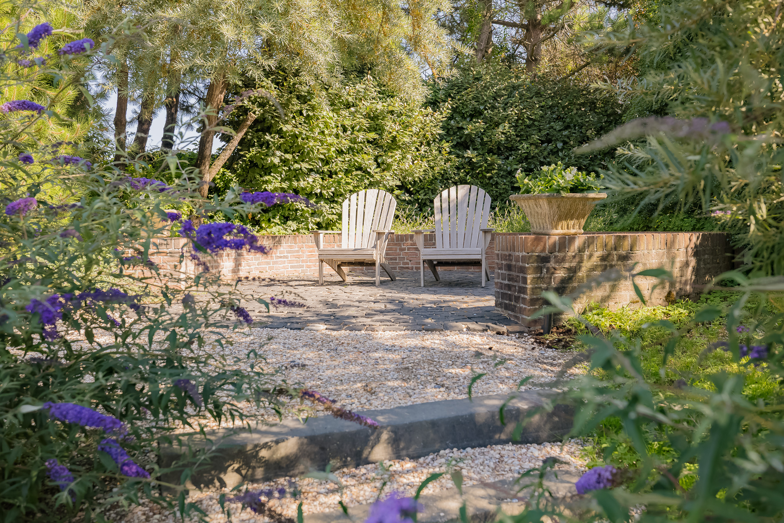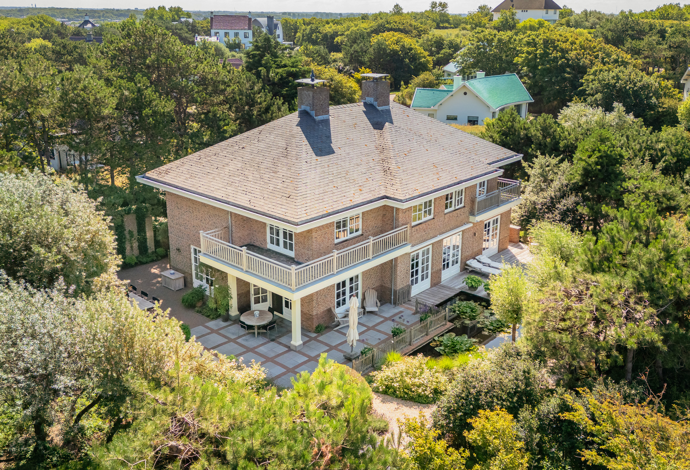 The garden is truly enchanting. Designed by architect Arend Jan van der Horst, it slopes gently with the dune landscape and offers an oasis of peace and beauty. Terraces, various seating areas, large trees, richly flowering borders, a pond with a deck terrace, and elegant shell paths create a unique outdoor experience. A place to enjoy endlessly.