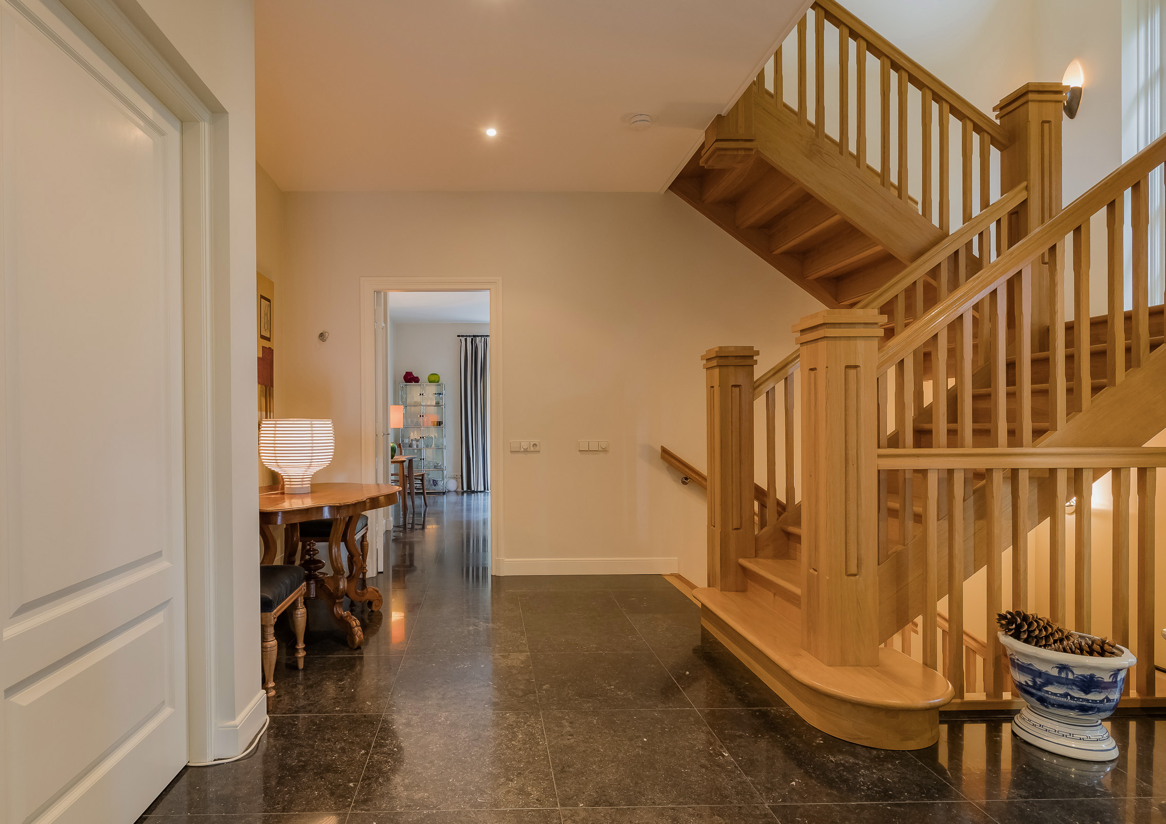 A beautiful staircase leads to the first floor with four spacious bedrooms. The master bedroom has its own dressing room, a luxurious bathroom with separate toilet, and a large sunny balcony. There is also a second bathroom, a separate toilet, a practical laundry room, and plenty of closet space.